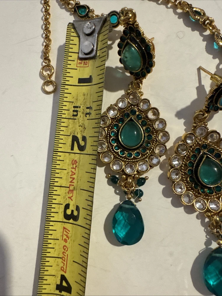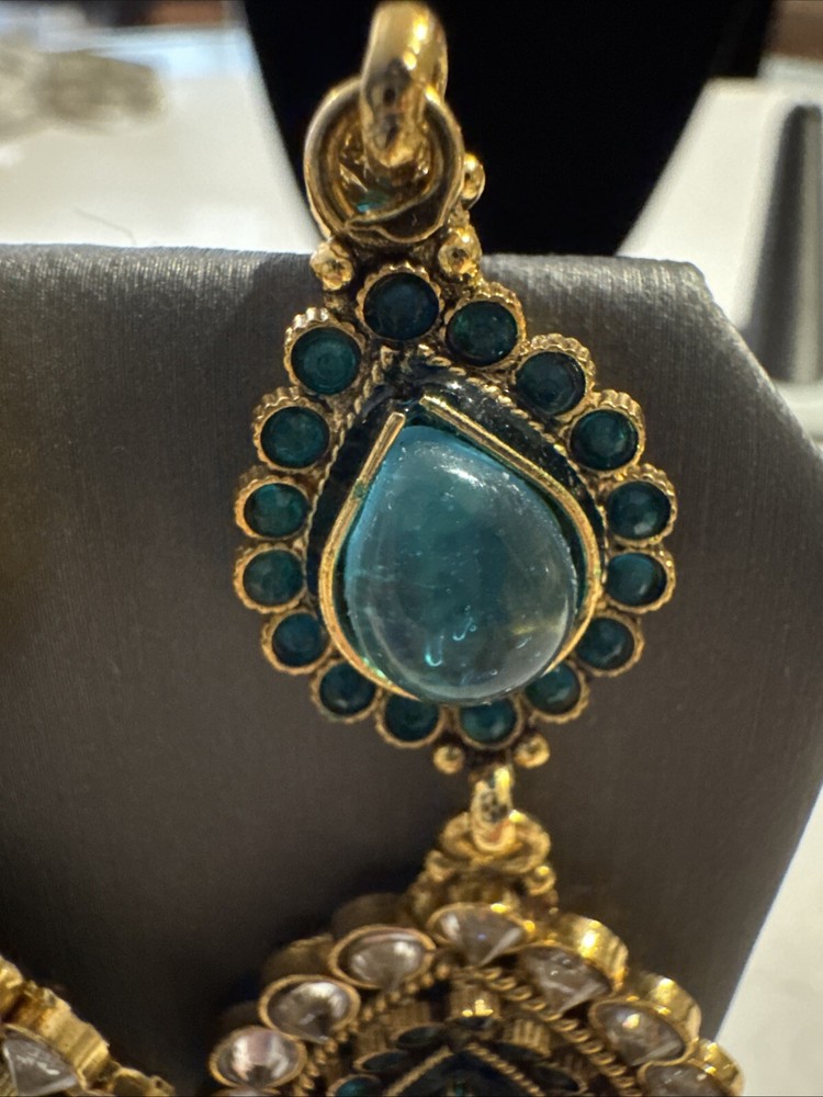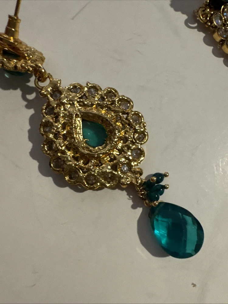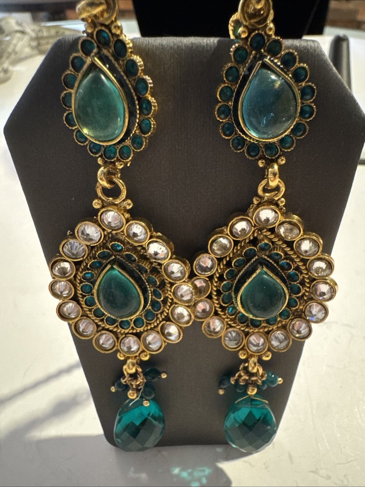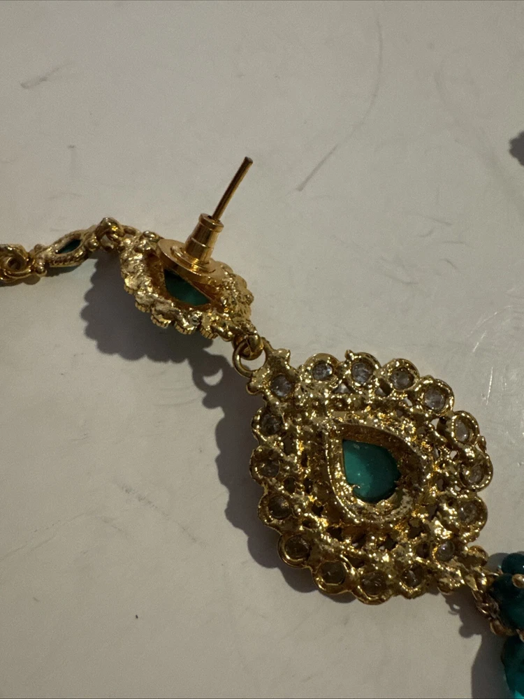 Adorn your ears with the vintage charm of these Gold Kundan Effect Earrings, paired with a complementary Green Earback Chain. These unbranded chandelier earrings are designed to add an elegant touch to any outfit, featuring a threader closure that ensures a secure and comfortable fit for all-day wear. Crafted from mixed metals and embellished with striking green stones, these earrings are perfect for a variety of special occasions, from anniversaries and birthdays to weddings and engagements. The intricate design and eye-catching green hue will effortlessly enhance your look, making these earrings a timeless addition to your jewelry collection.