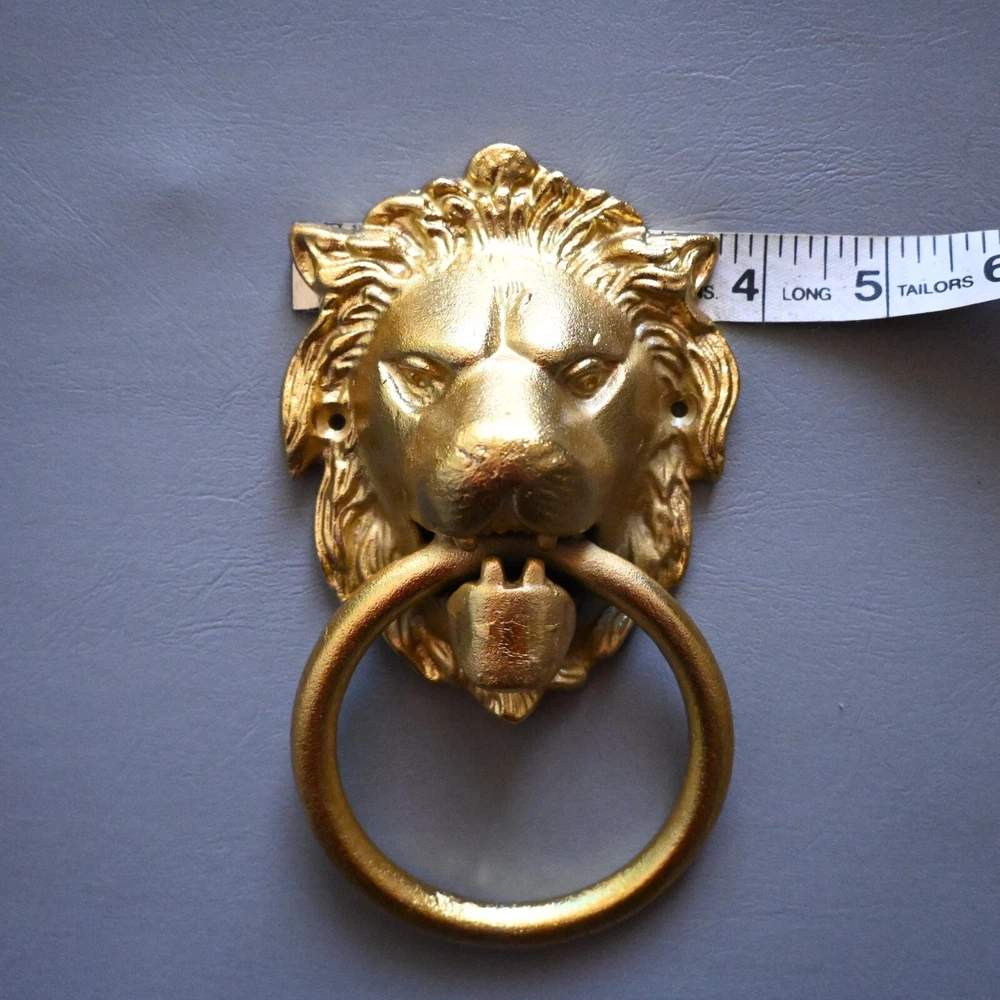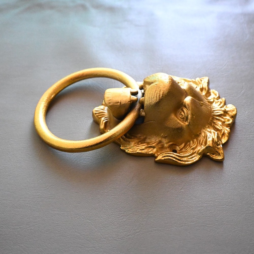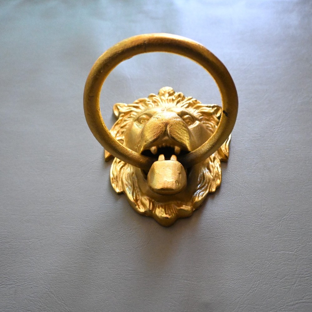 UP FOR SALE Vintage style cast iron gold painted lion door knocker. Cast iron lion with cast iron ring . Heavy weight lion knocker. Item as found condition Size = See images Please do visit my Store . We have great variety of rare tools , military knifes and dagger/khanjar etc. Please note = images are also the part of description so please see the images carefully before buying. If you want any extra details regarding products please contact us . We look forward to assist you. SHIPPING Shipping will take 10 to 15 days or more depends on location and situation. We will ship by any international or domestic courier company . "Happy buying "