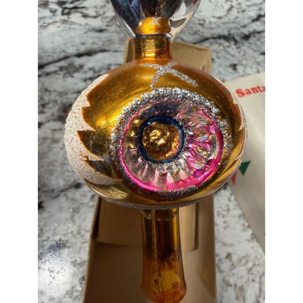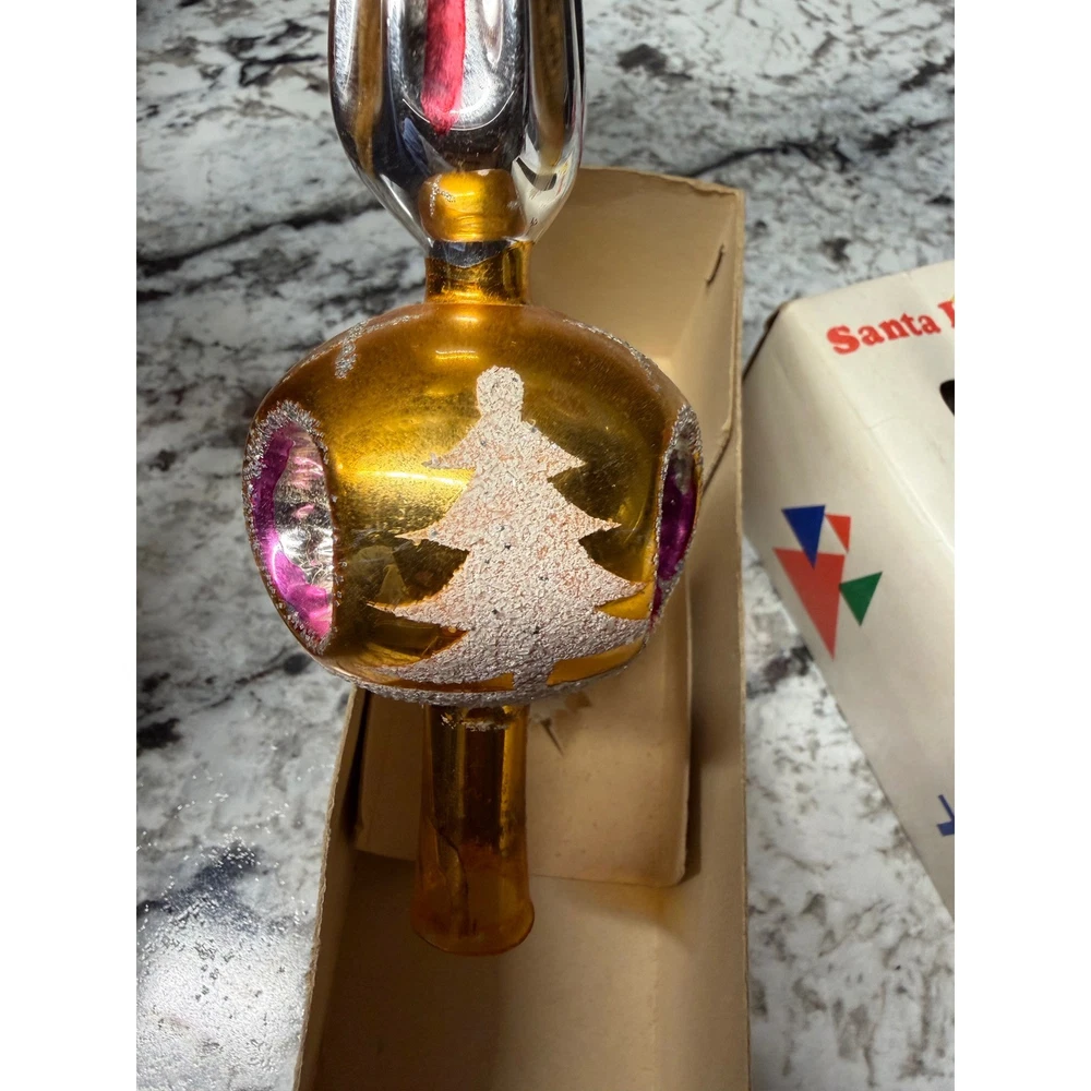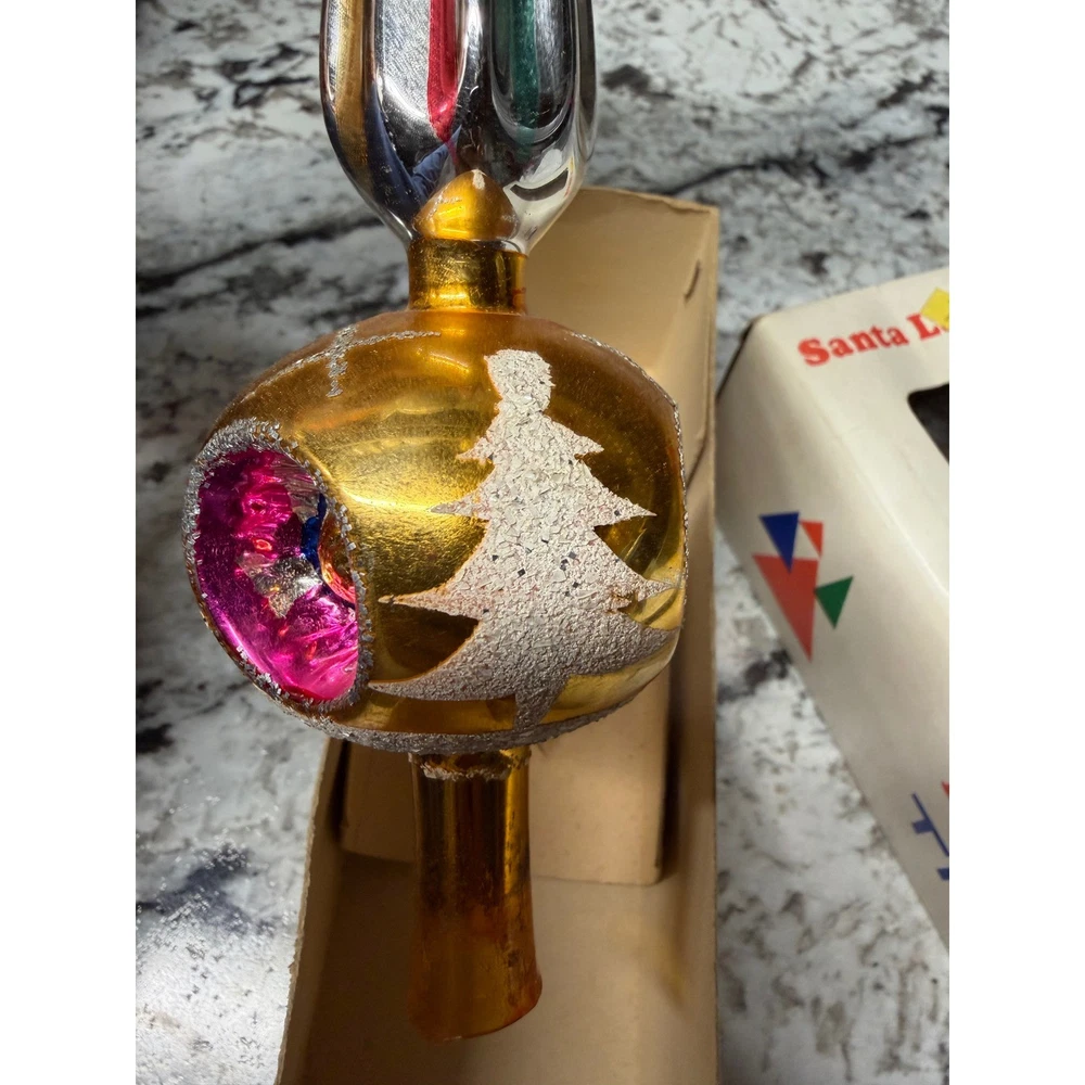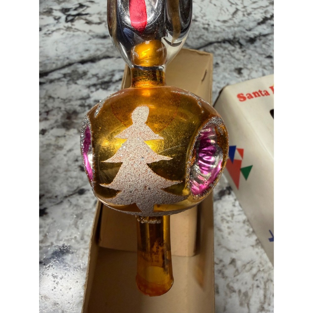 Vintage glass Christmas tree topper showcases a classic finial silhouette with a vibrant gold mercury glass finish. This hand-decorated piece features colorful indented reflectors in pink and blue, accented by white glittered Christmas tree motifs and silver tinsel-like trim. The elegant spire design adds a nostalgic mid-century aesthetic to any holiday decor collection. Measurements: • Height: 11"