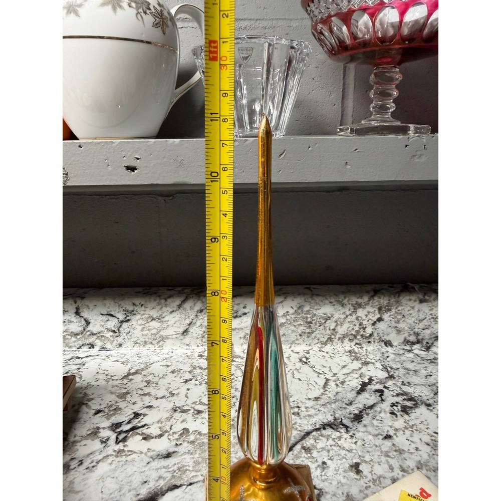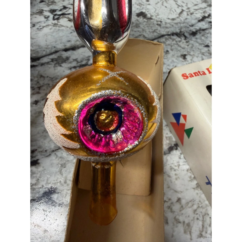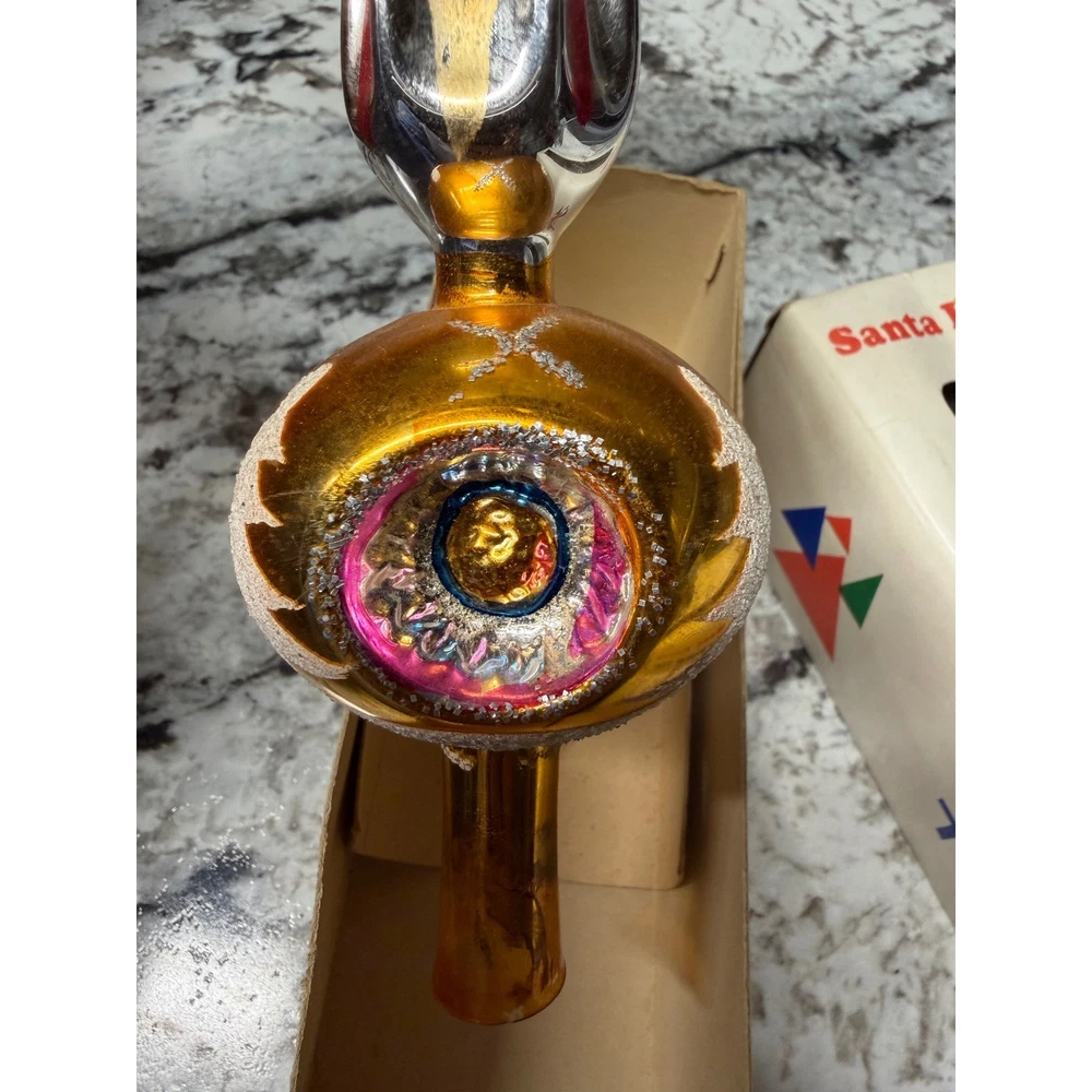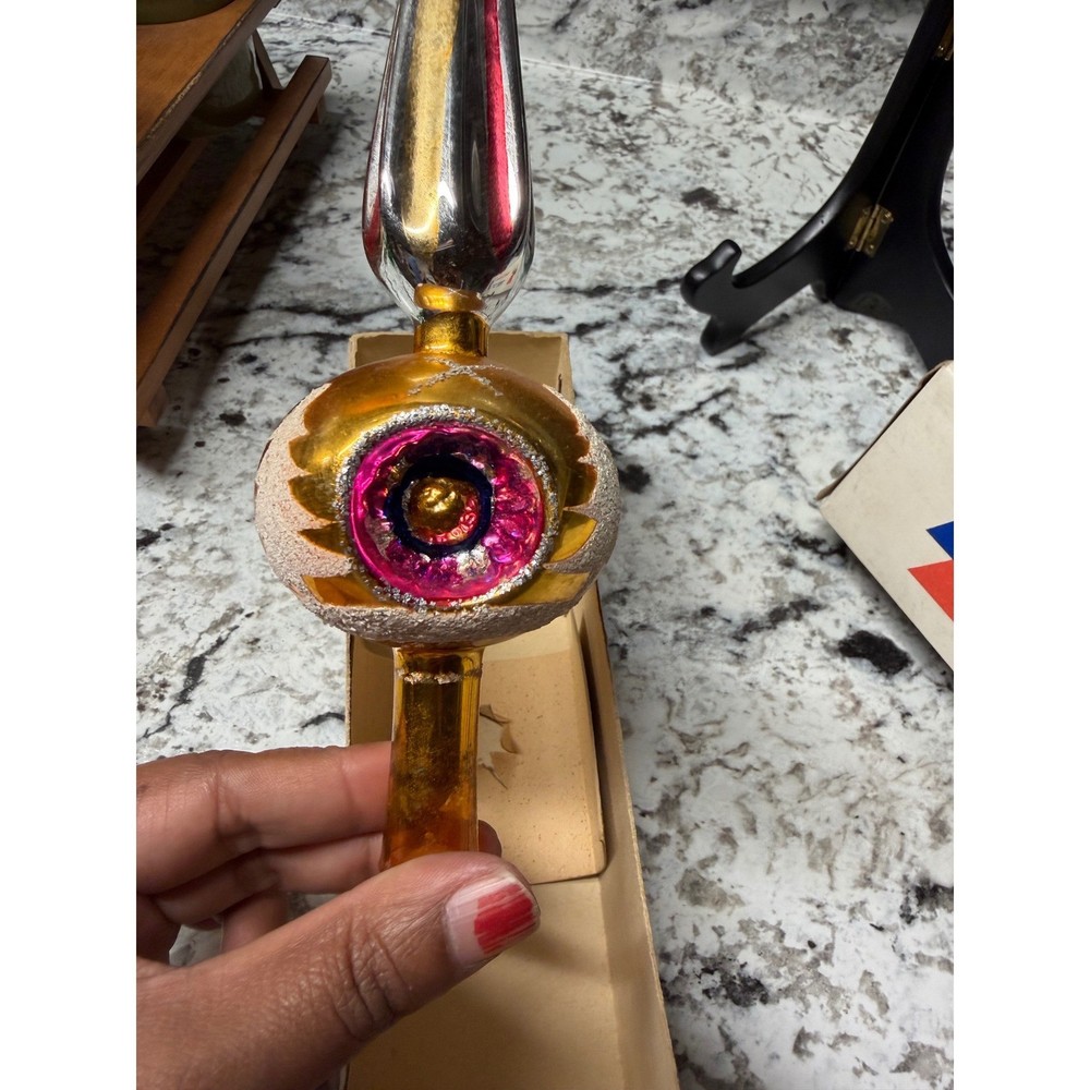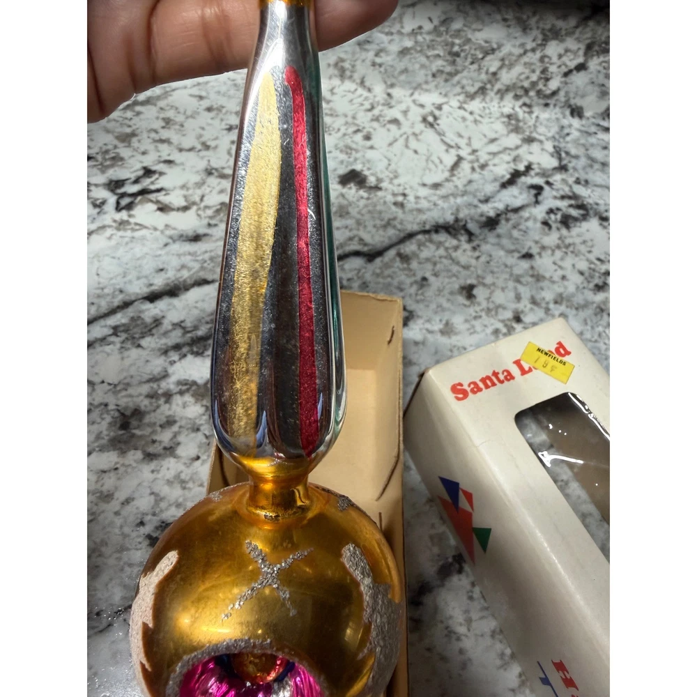 Vintage glass Christmas tree topper showcases a classic finial silhouette with a vibrant gold mercury glass finish. This hand-decorated piece features colorful indented reflectors in pink and blue, accented by white glittered Christmas tree motifs and silver tinsel-like trim. The elegant spire design adds a nostalgic mid-century aesthetic to any holiday decor collection. Measurements: • Height: 11"