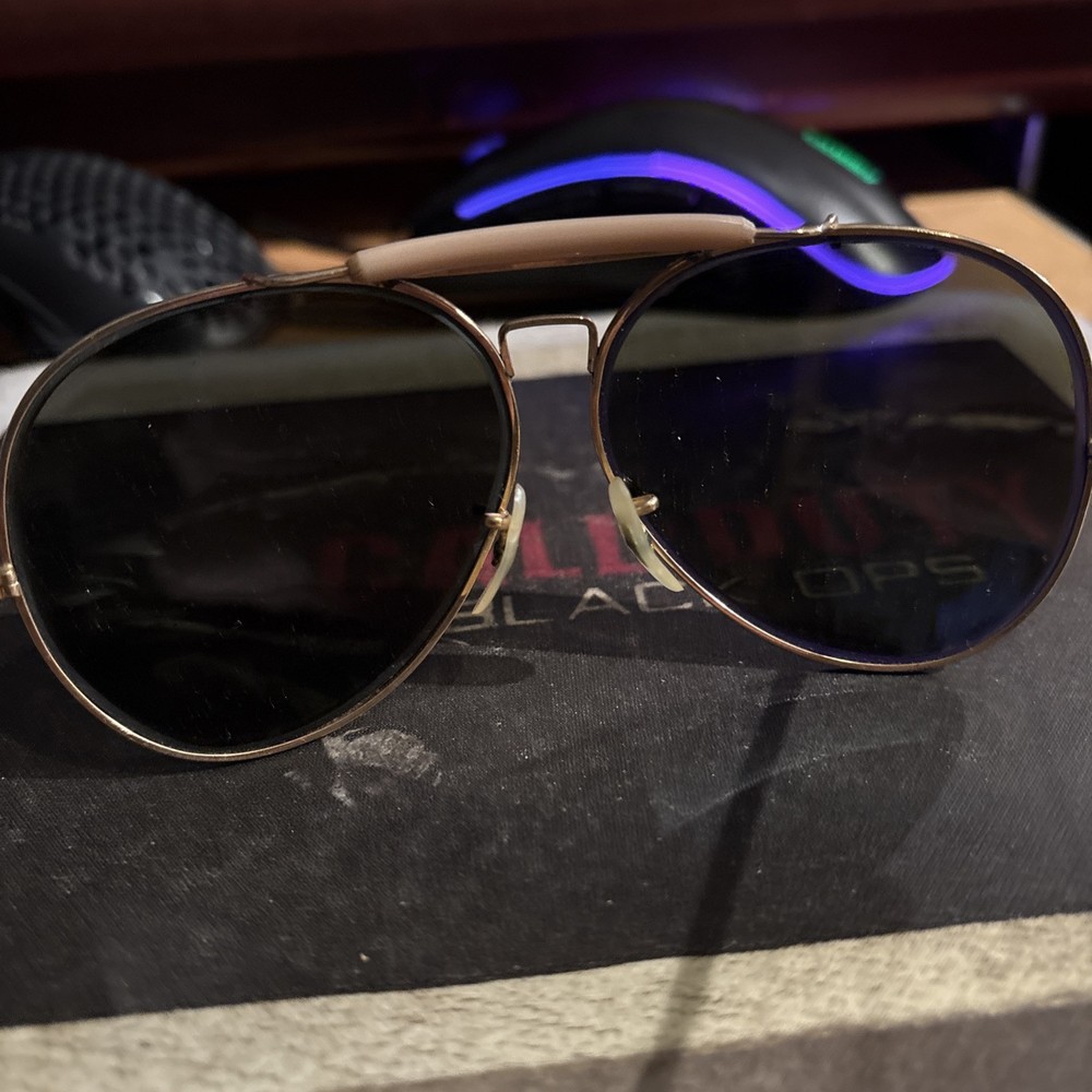 Real aviators , 12K gold plated, donβt know brand or lensβs type. Got them decades ago from my uncle who was in Air Force back in the early 50βs . The only thing stamped on rims is 12k gold . Lenses are clear, no scratches!