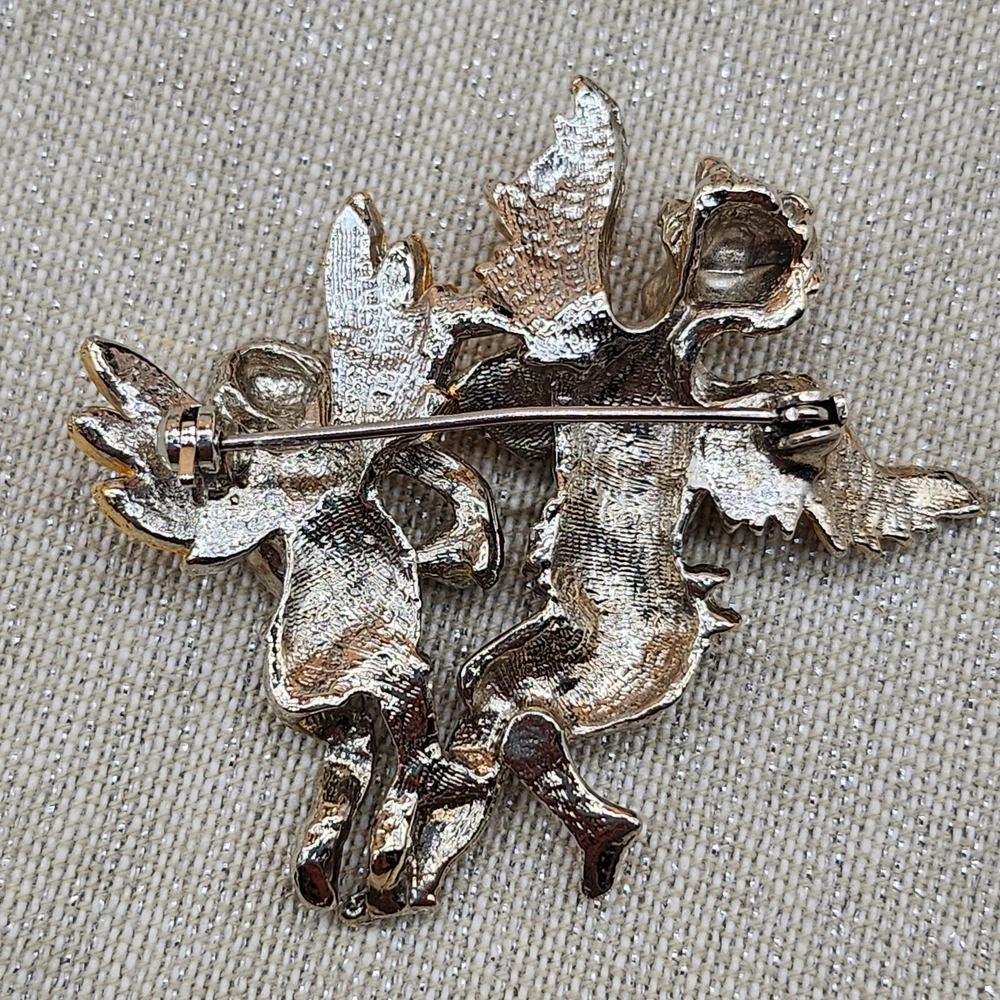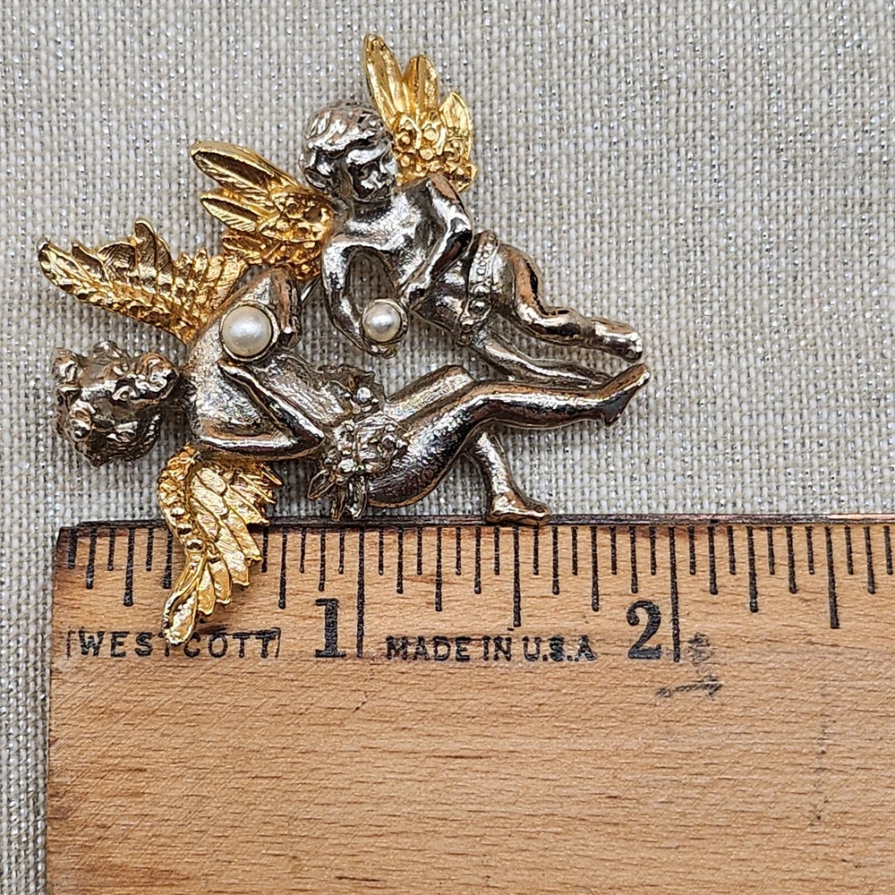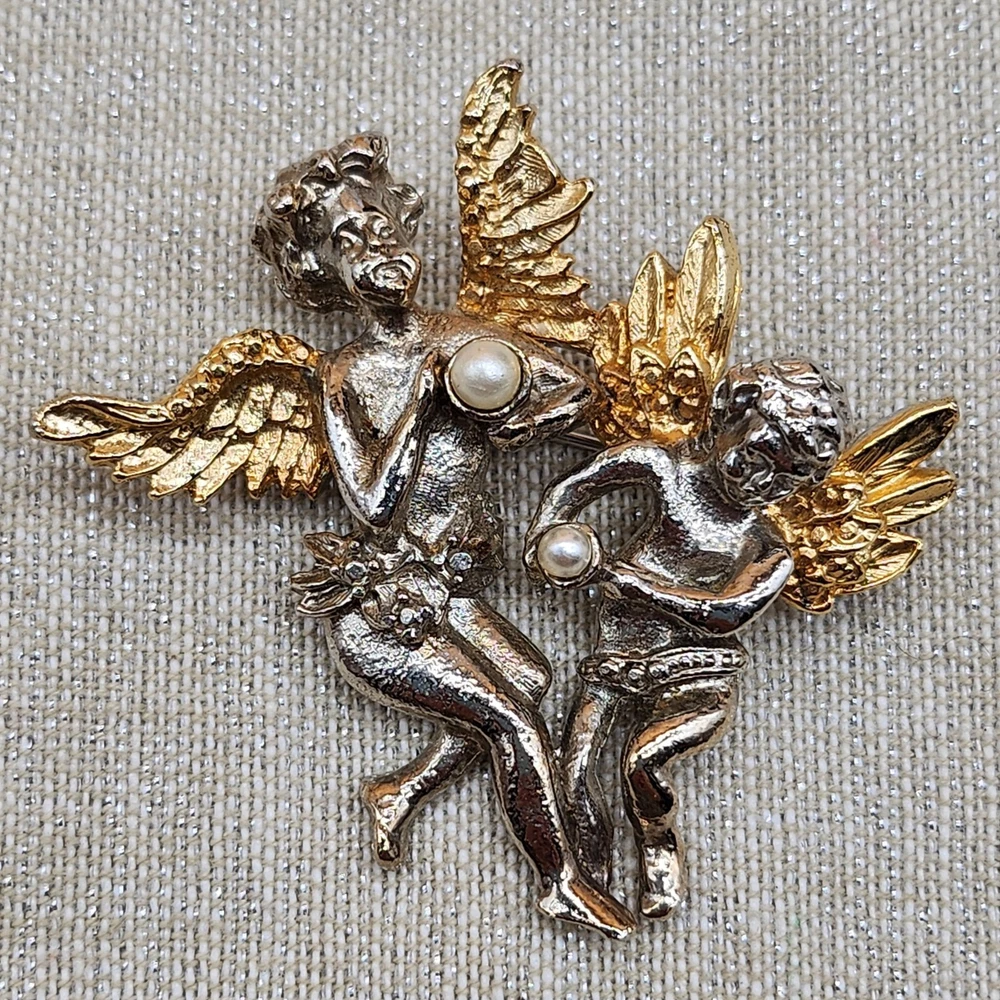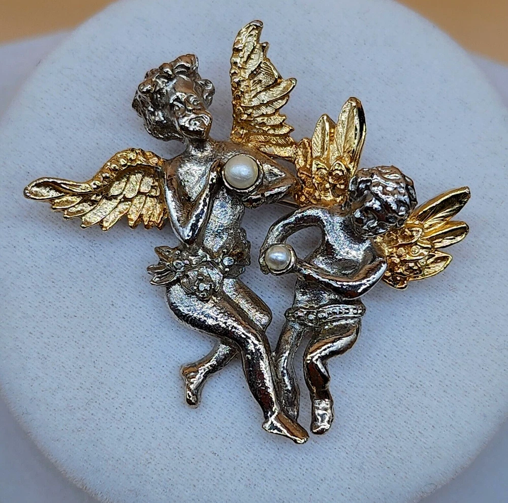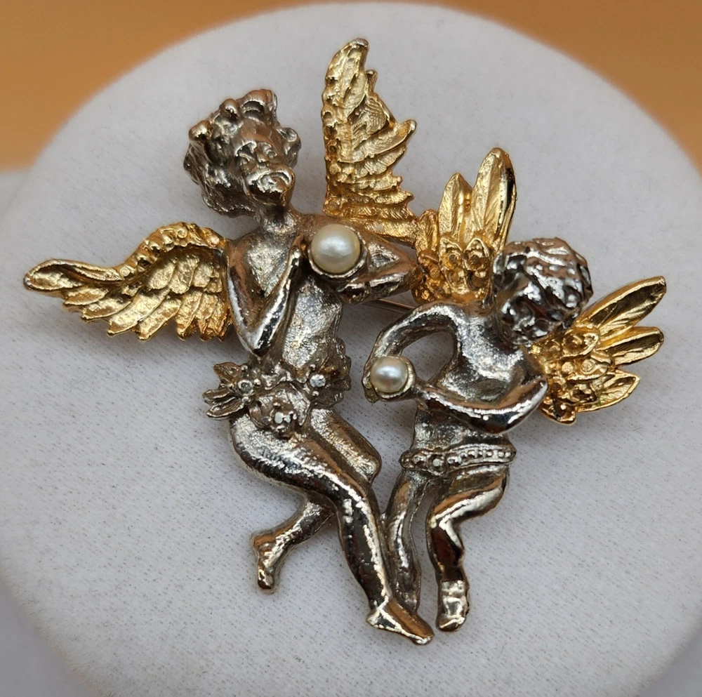 Vintage Gold & Silver Tone Golden Wings Angels with Faux Pearls Brooch