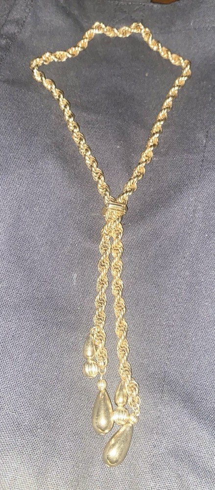 This Vintage Gold Tone Bolo/Lariat Style Twisted Rope Necklace is a stunning statement piece of jewelry. The twisted rope design adds a unique and stylish touch to the piece, while the bolo closure gives it a secure fit. With its beautiful gold tone color and vintage aesthetic, this necklace is perfect for adding a touch of elegance to any outfit.