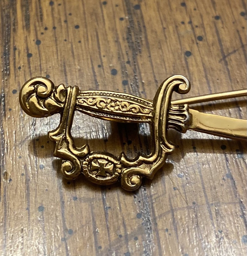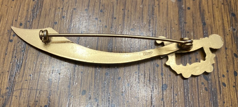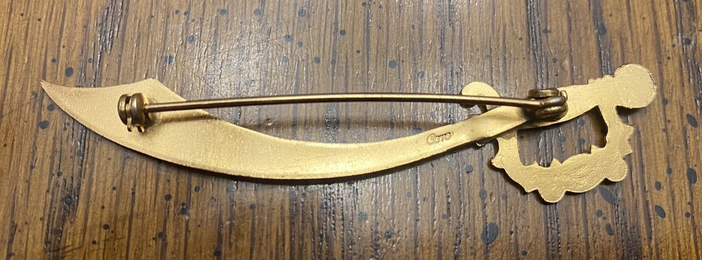 Elevate your jewelry collection with the vintage charm of this Coro Scimitar brooch pin. The elegant gold tone complements its classic design, making it a versatile piece for both casual and formal wear. Measuring at 2 7/8 inches wide, it's sized just right for a statement without overwhelming. Signed by Coro, this brooch boasts a timeless appeal that transcends eras. Its mixed metal composition ensures durability, while the unisex design makes it a great addition for anyone who appreciates the sophistication of fashion jewelry. Whether it's an original piece or a cherished heirloom, this brooch is sure to be treasured. Smoke free, pet free home. Always combined shipping for multiple purchases. Shipped by USPS Ground Advantage.
