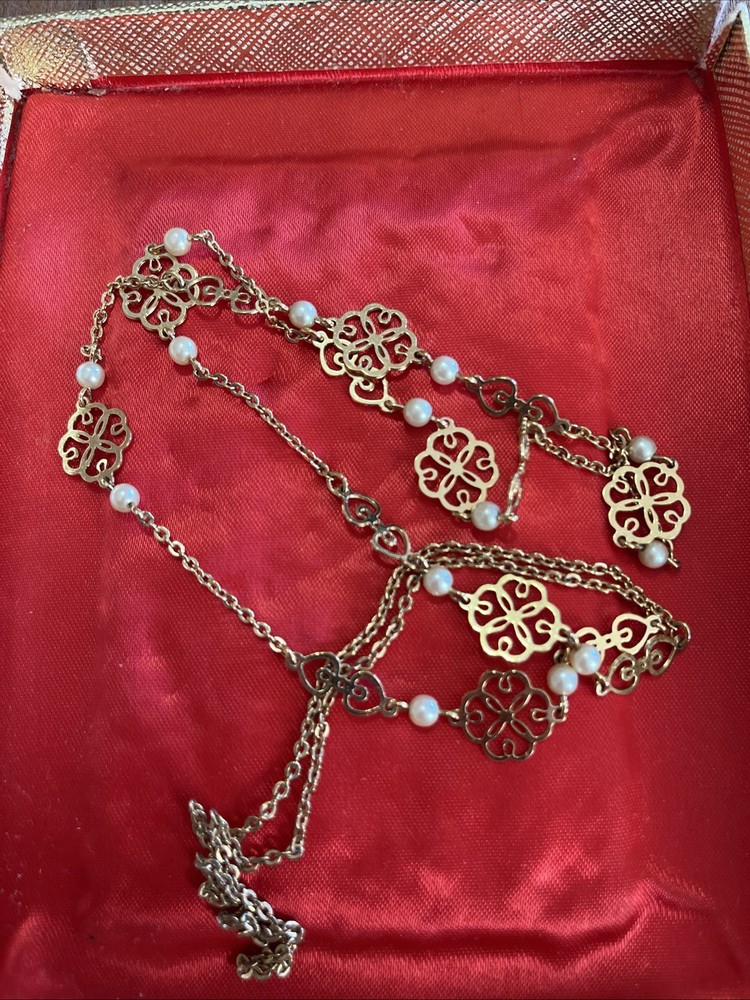 Add a touch of elegance to your outfit with this vintage gold tone necklace. The dainty station chain design features delicate clover faux pearls that add a touch of sophistication to any look. The necklace measures 32 inches in length and is perfect for both formal and casual occasions. The brand of this necklace is Avon and it falls under the categories of Jewelry & Watches, Vintage & Antique Jewelry, and Necklaces & Pendants. The color of the necklace is gold and it has a style that is both station and chain. The material and metal used in making this necklace are unknown.