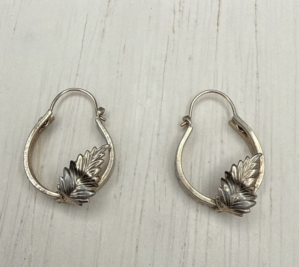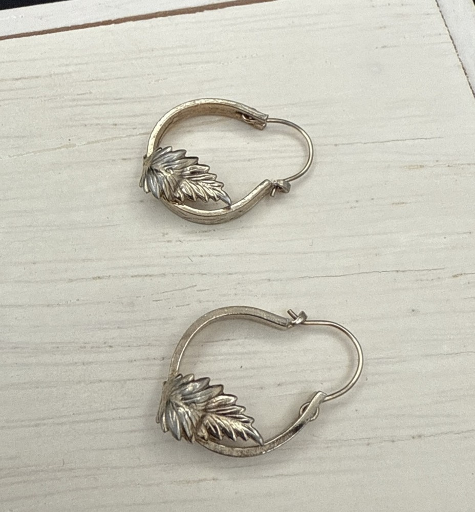 Vintage EARRINGS Faded Gold Tone Small Hoops with Leaf Attached To Side PRETTY! (5598)