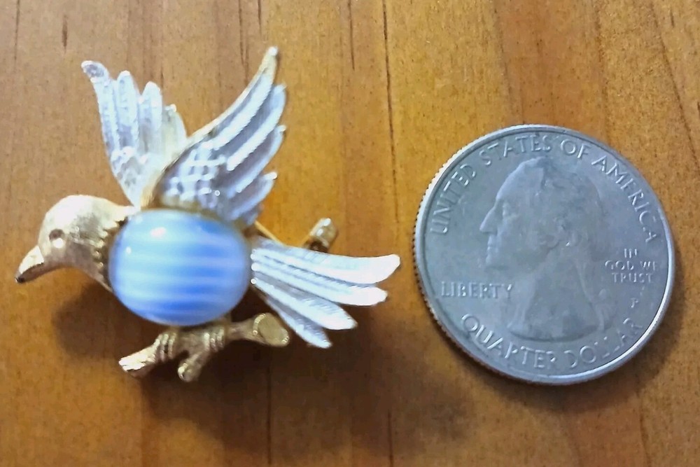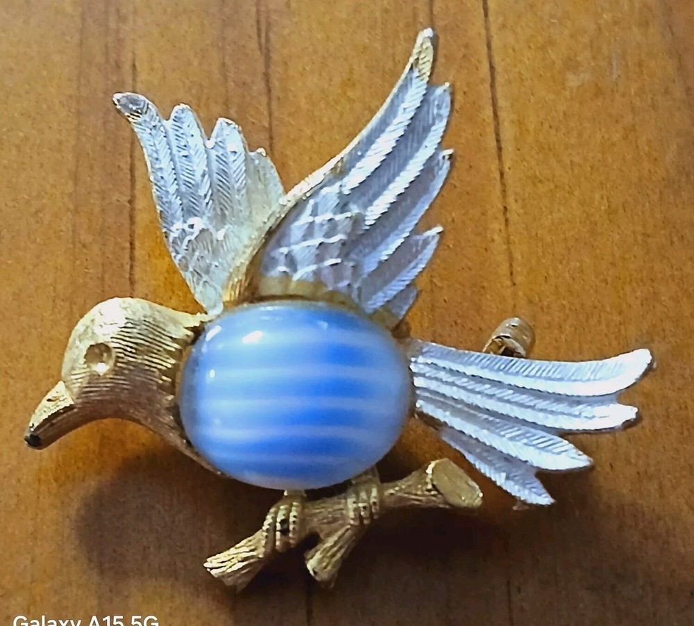 This Jelly Belly brooch is a unique addition to any vintage jewelry collection. This brooch has a gold toned bird and a round stone with blue and white stripes. The brand is well-known for its quality, and this brooch is no exception. Pre-owned and in good condition.