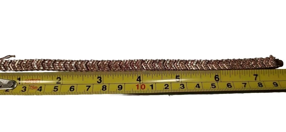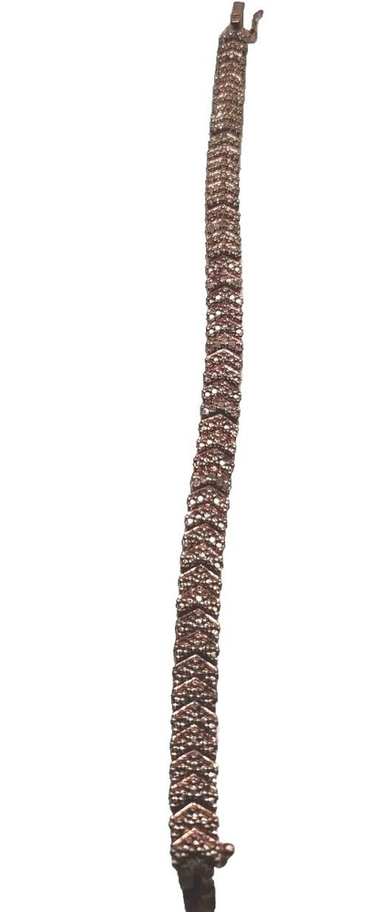 This vintage tennis bracelet is a charming addition to any jewelry collection. The clear rhinestones and white/colorless main stone color create a beautiful contrast against the brass metal. The asymmetrical shape and push lock closure add a unique touch to the design, making it a one-of-a-kind piece. Perfect for any fashion-conscious individual, this bracelet is a great choice for casual or formal events. With its herringbone chain type, it is durable and comfortable to wear. This pre-owned vintage jewelry is not signed but is in excellent condition. Add this timeless piece to your collection today.