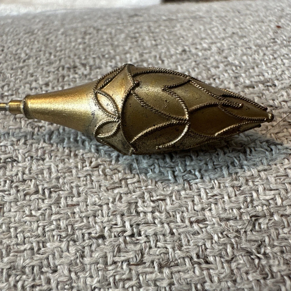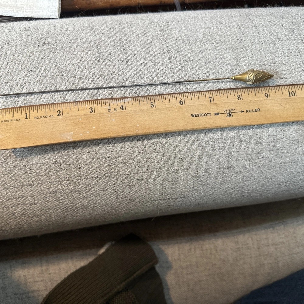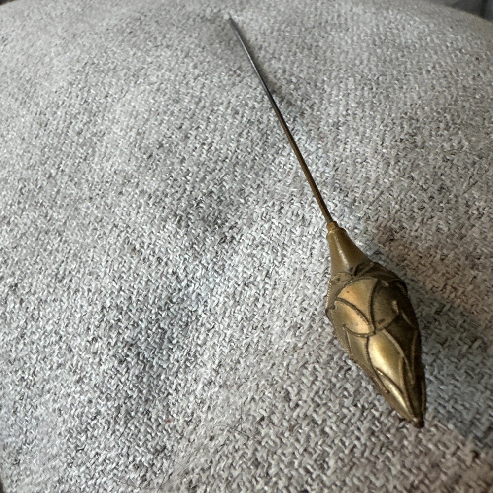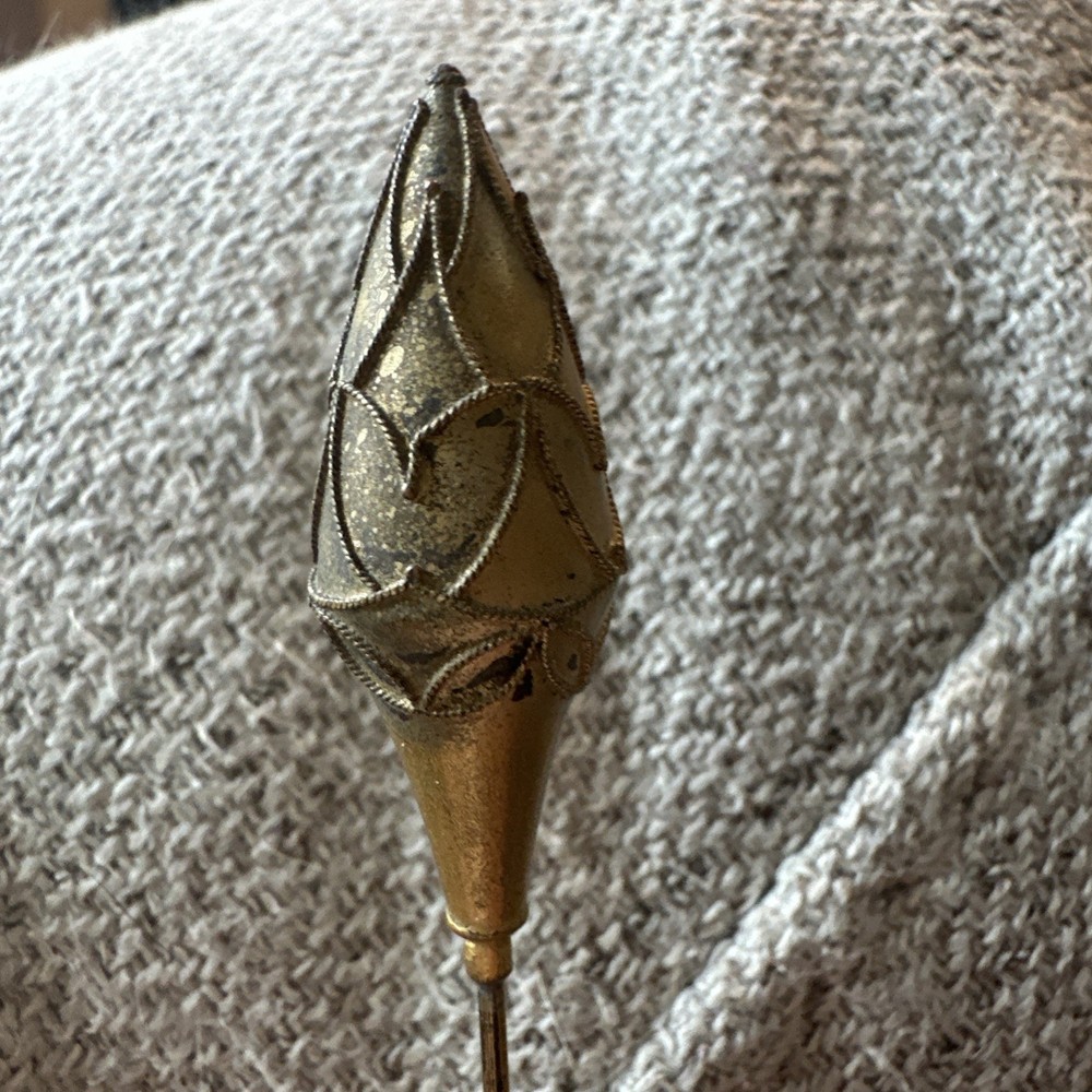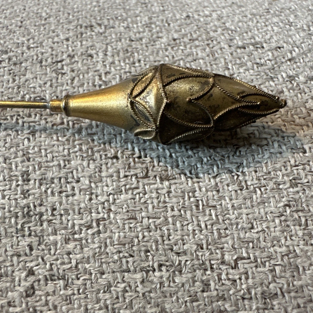 This vintage gold tone teardrop Victorian hatpin is a beautifully crafted collectible item made of metal. Measuring 9.25 inches in length, this hatpin exudes a classic and elegant style reminiscent of the Victorian era. Perfect for adding a touch of old-school charm to any outfit or collection, this hatpin is a versatile piece that can be used for various occasions. Its intricate design and unique shape make it a standout accessory for those who appreciate vintage aesthetics.