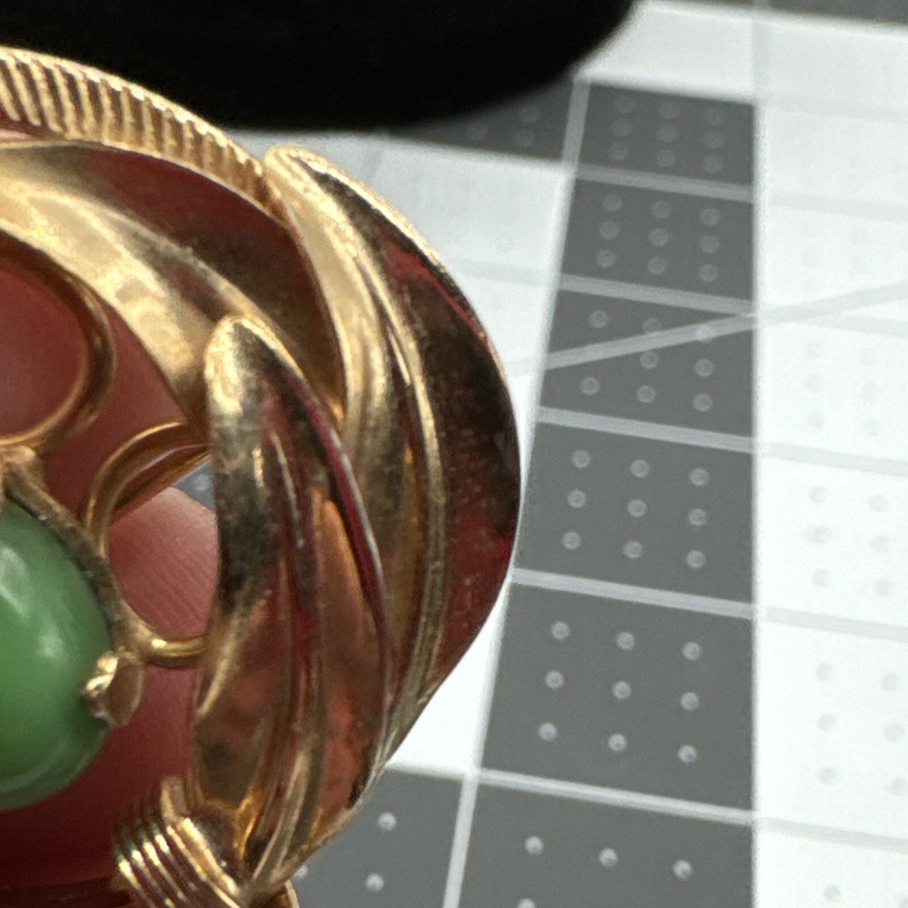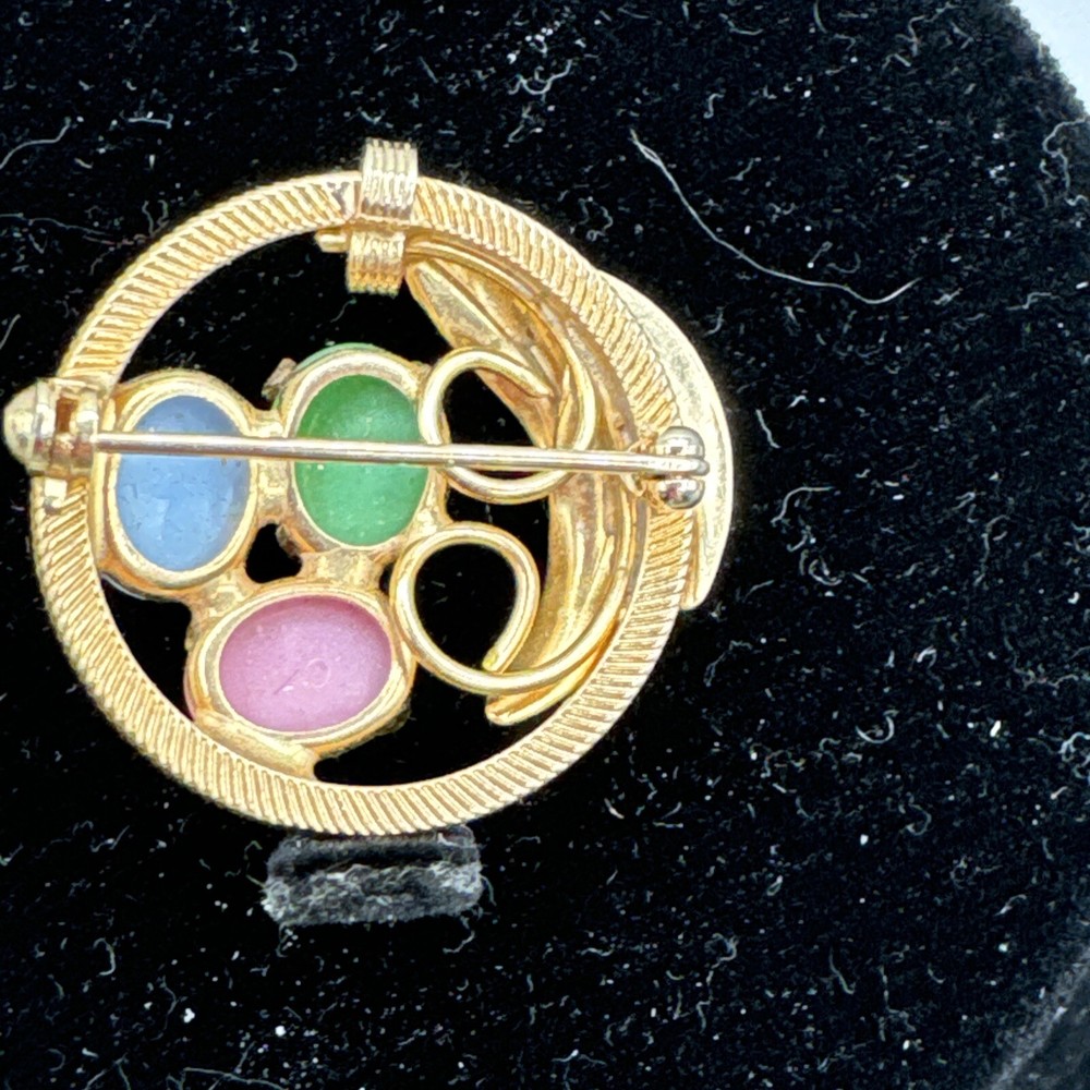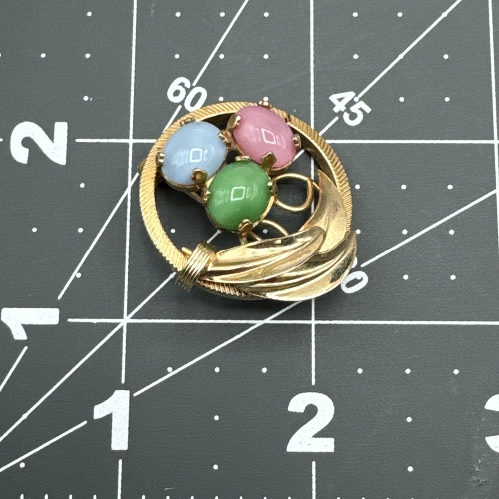 Vintage Stone Trio Brooch Pin Feathers Gold Tone Green Pink Blue Enamel Pre-owned. See measurements and pictures.