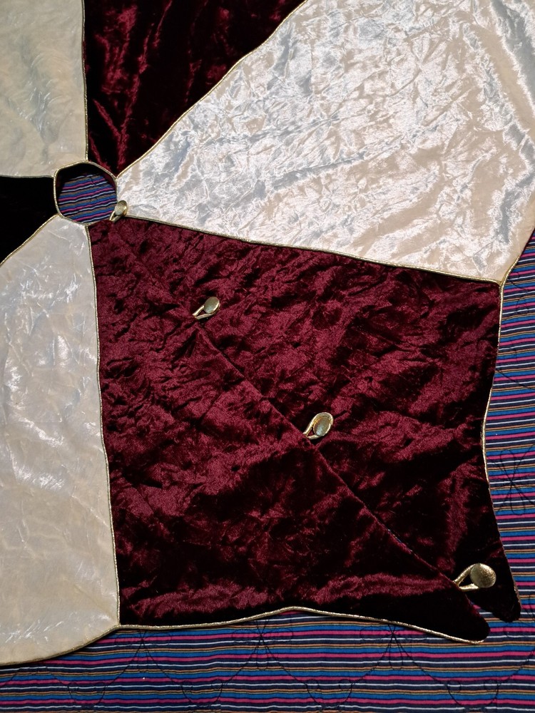 Star shaped Christmas tree skirt burgandy and cream with gold trim and gold buttons. Small mark, last pic.