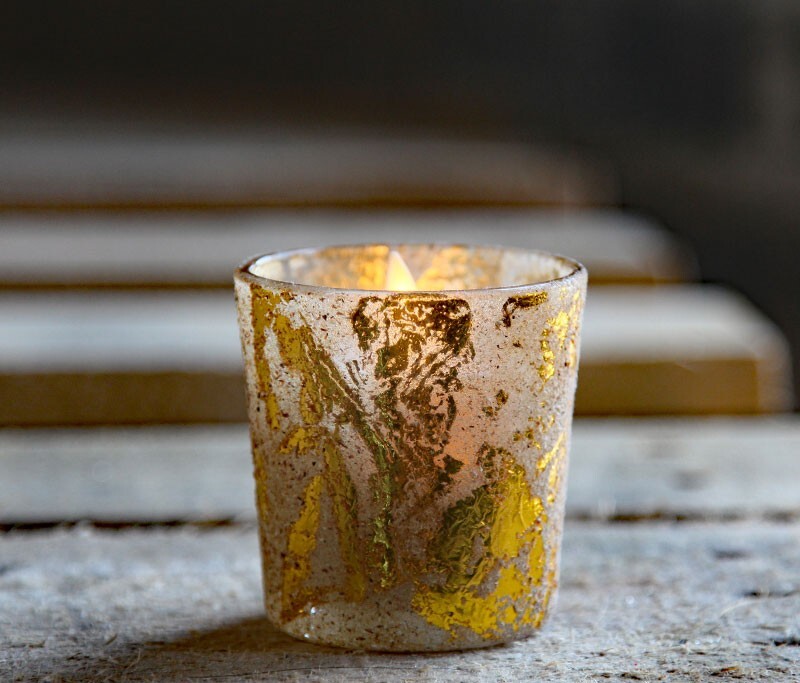 Gold Votive Holders with the appearance of Velvet brings an ambiance to your home, event or next party. 2.5 Inch Tall Base Measures 1.75 Inch Diameter 2 Inch Opening Gold Flocking Finish Durable glass will keep this timeless piece for years to come. Use with any of our flameless tealights. When our Moving Flame Tealights are added you see the dancing flame bounce light. You'll never know it's not a real flame !! Product Specifications SKU: #22630 Size: 2.25" H Color: Gold Type: Votive Holder Set