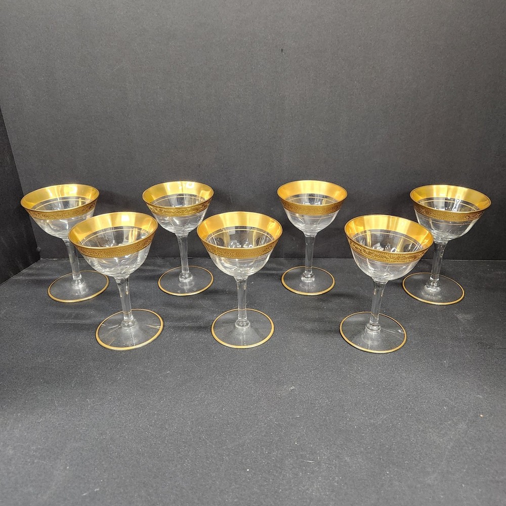 Vintage Coupe Crystal Wine Glasses with Gold and Rose Gold Trim Set of 7