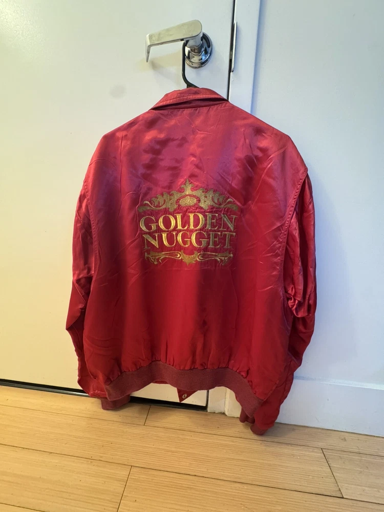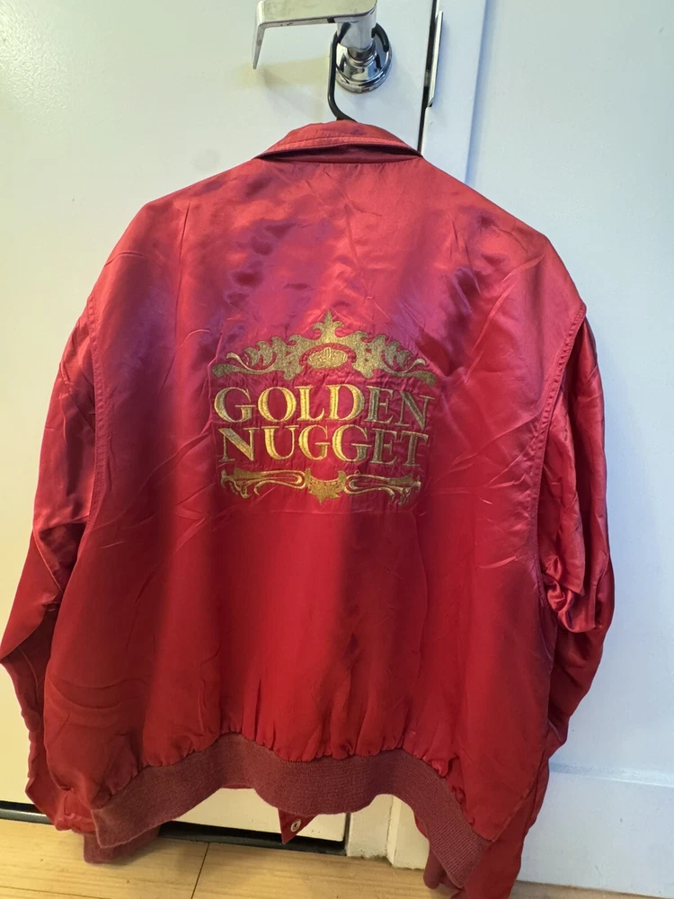 This vintage golden nugget employee jacket is a rare find for any casino memorabilia collector. Made in the United States, this jacket is a unique piece of history from the iconic Las Vegas casino. The jacket is sized extra large and features the classic golden nugget logo, making it a must-have for any fan of the casino. This jacket is perfect for display or for wearing to add a touch of nostalgia to any outfit.