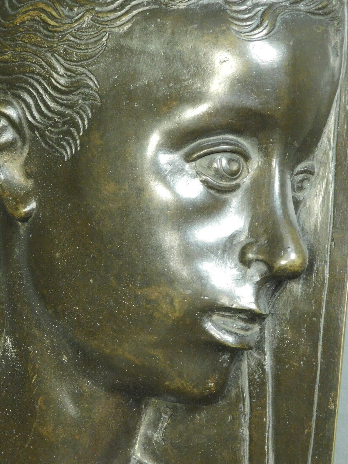 This sensitive lost-wax, cast bronze relief after the young Desiderio da Settignano (Florence, c.1430-1468) dates from the early 1900's and was likely crafted in Italy as a souvenir of the grand tour. Measuring 19 1/8" tall x 9 1/8" wide x 2 1/2" deep, it depicts the young John the Baptist as a young boy in profile wearing his rough fur garment. The deeply cut details and warm patina make this a particularly pleasing replica of Desiderio's masterpiece. WE ARE ALWAYS HAPPY TO SHIP WORLDWIDE IF ALLOWED BY USPS. Please contact for international shipping cost quote. Stated U.S. shipping charges are for FEDEX GROUND in the contiguous 48 states. Higher rates may apply for AK and HI or USPS shipping. Please e-mail me if you have any questions. PAYMENT POLICY: Unless arrangements are made prior to bidding, payment is expected within 7 days after the end of the auction or the item will be re-listed. Visa/MasterCard payments accepted through PayPal. Indiana residents must add 7% sales tax. On all INTERNATIONAL SHIPMENTS merchandise will be declared as such (not gifts or commercial samples) and value stated as the actual sale price. LARRY