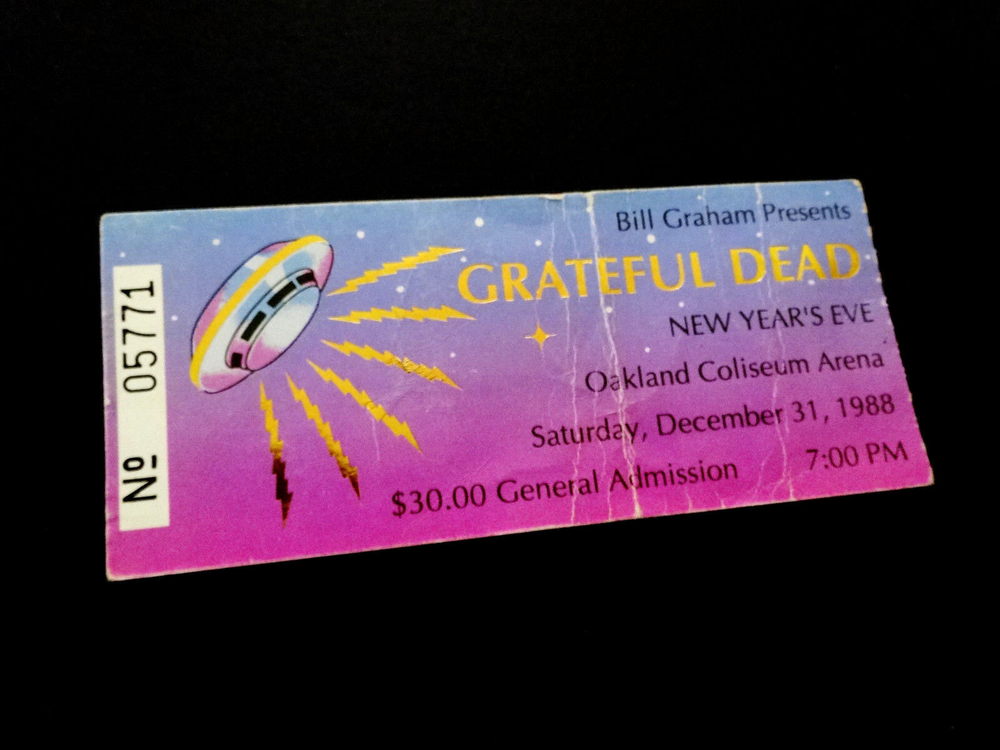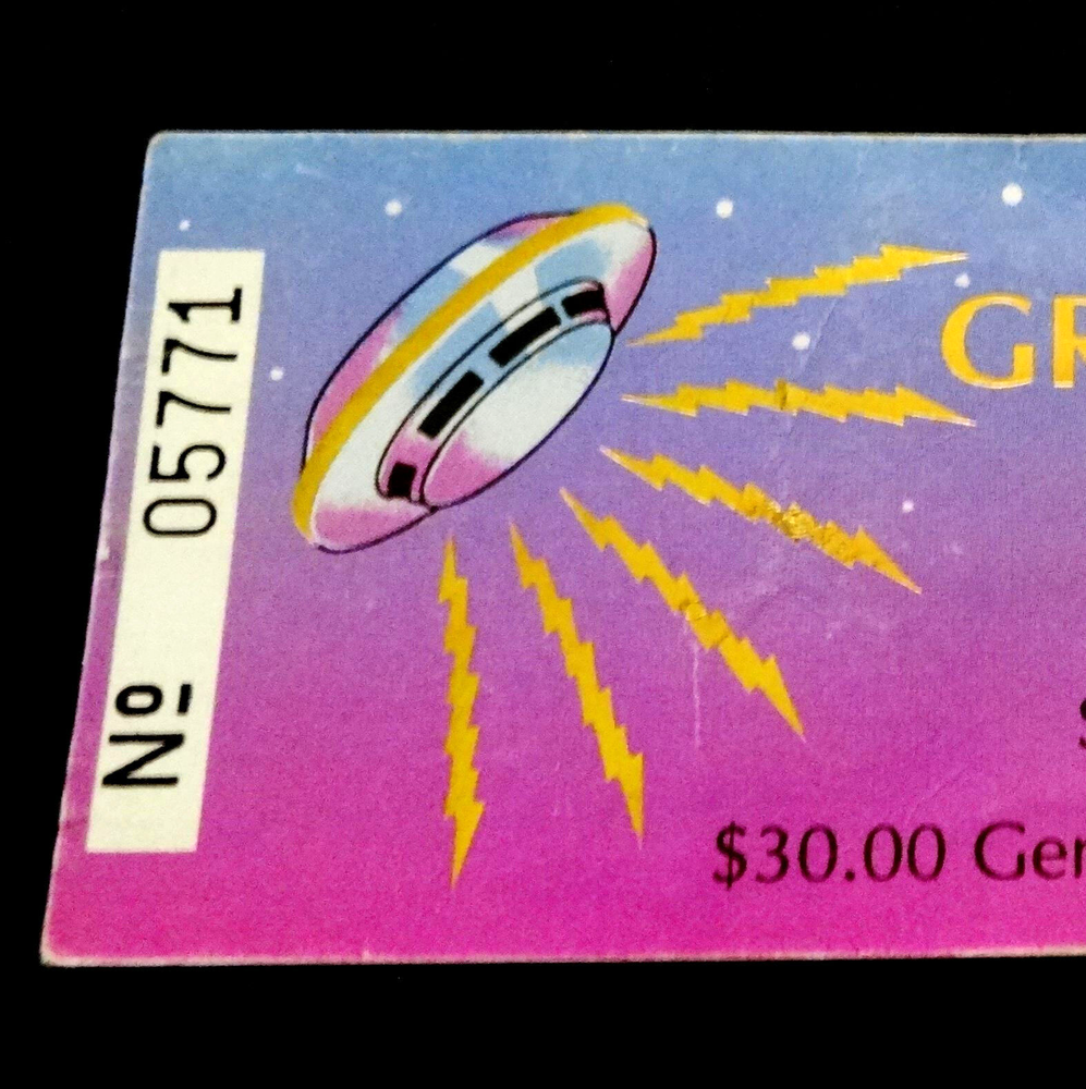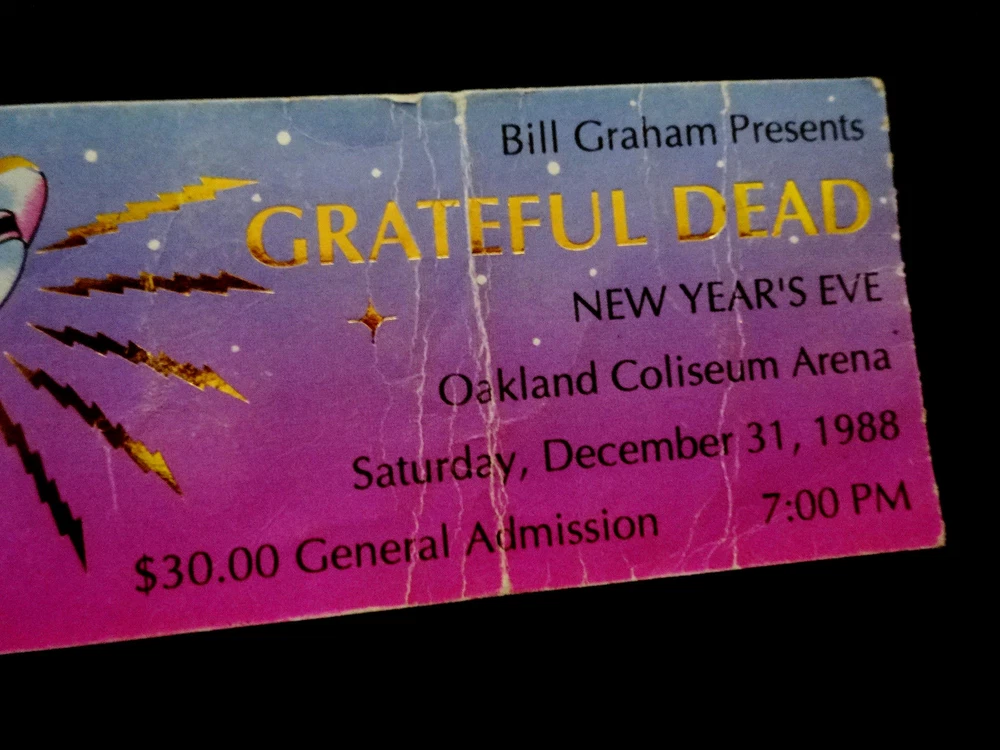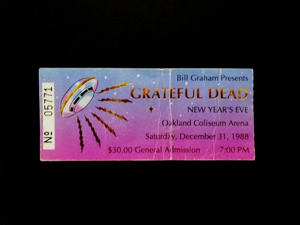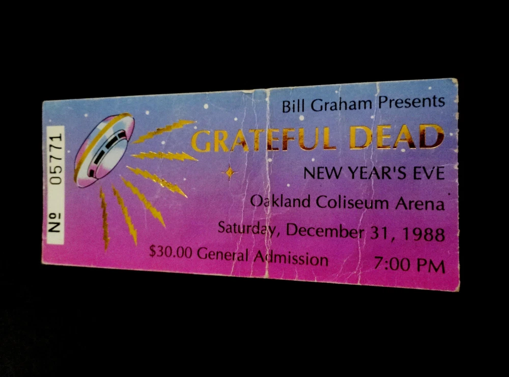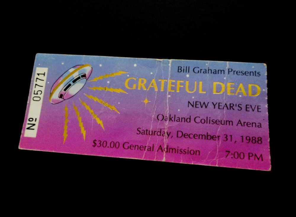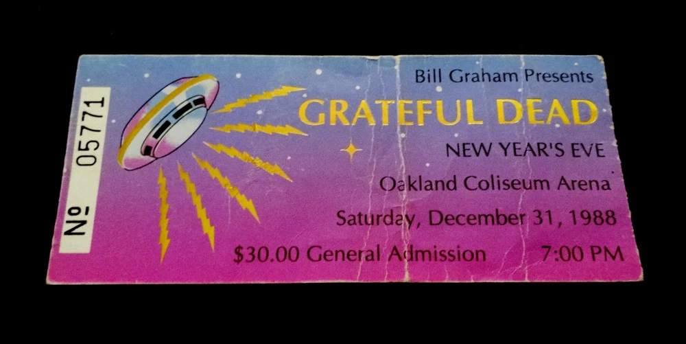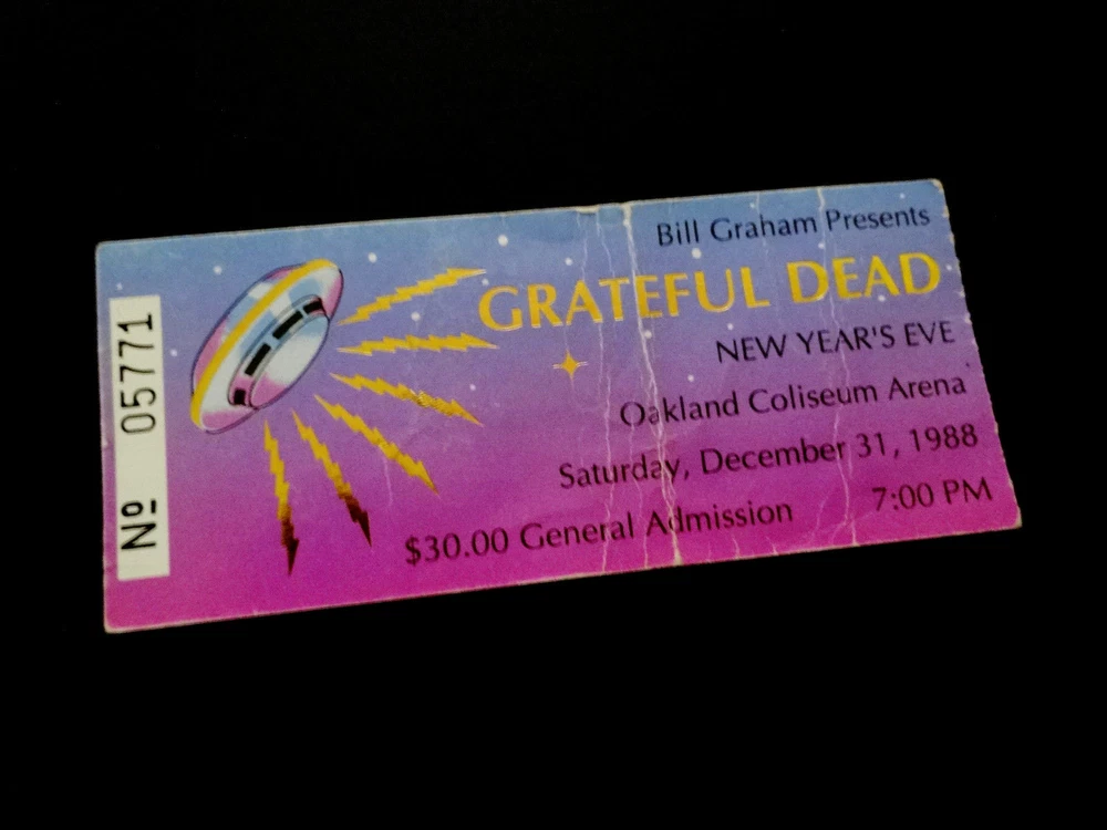 Grateful Dead Ticket Stub : 1988 : 1988 - 1989 New Years Eve ! : December 31, 1988 ( 12/31/88 : 12/31/1988 ) : Oakland Coliseum Arena - Oakland, California ( CA ) : 1988 Grateful Dead Productions, Inc. / Grateful Dead Ticket Sales, Inc. ( GDP / GDTS ) : Used GDP, Inc. GDTS Mail Order Ticket ! ( No. 5771 ) : The 1988 ! New Year's Eve Show !! - at the Oakland Coliseum !!! Grateful Dead " New Years Eve ! " Ticket Stub ... for the 1988 - 1989 New Year's Eve Show !!! at the Oakland Coliseum !!!!! Dead Fans !!! Talk about a 35-Year Old ! " New Years Eve ! " Dead Ticket !! that is Rockin' one of the Most-Awesome ! G.D. " New Years Eve " Ticket Designs of All-Time ! --- the Gold-Foil Lightning-Bolted UFO Flying Saucer Spaceship !!!!! And, what an Intergalactic ! '88-'89 New Years Eve Dead Show this one was - offering the Very 1st notes, tones & songs ... for the ' Super-Intergalactic ' 1989 Grateful Dead " Monster " Touring-Year - right in Oaktown ! at the Deadhead's one & only Oakland Coliseum !! Wow ... I mean 1989 Grateful Dead !!!!! Could never-ever say enough about it, and I still can't - as heck ... I'm just still getting started ! Well, how's this for starters ... Jerry Garcia !!!!!!! As This-Guy was on a straight-up Mission ! to bring the G.D. Live Heat ! in '89, and just kept doing it - Spring Tour, Summer Tour, Fall Tour, Winter Tour ... I mean you name it. I'm sure some of it had to be the whole 'near-death' thing in '86, obviously ... but Jerry was 47 here, and he was playing like he was 27 again - but ... no joke, even Better !!! I mean you only get better in Rock & Roll really, if you are truly one of the Greats ! And ... just how many Guitar Players really had the ideal ' chance ' to deliver for that long, for so many Rock & Roll, and Rock & Roll " Business " type reasons ... my point being something like this --- Jimmy Page got to play like what ? ... only 12-years with Zeppelin ? And, how many years did Iommi really-get, when you account for all of the on & off ' breaks ' ( & break-ups ) by the Black Sabbath(s) - including the Ozzy unit, the Dio unit, and also the ' other ' units. And Jerry ? - well, he got 30-Years ! with the G.D., and as far as I'm concerned ... this 1989-1990 Touring pocket, was indeed a Grateful Dead " Prime " Era - the tail-end of the " Brent-Era "... and arguably, in many ways you can easily argue - it " Was " the Ultimate-Prime ! of the Grateful Dead ' Live ' from a holistic standpoint - with ' all ' things considered. And, the simply fact is ... Jerry ! knew-it, and he got after it in 1989 Harder ! then in any other recent Dead Touring Year ... as you'd really have to go back all the way to 1985, and the " Twenty Years So Far ! " G.D. Tour ... and the Push ! Just think ... 6/30/85 ! Ha !! So yeah ... as this Ticket ! most-definitely represents this '89 G.D. Gateway, and for this New Year's Eve Celebration - in Oaktown ! - Jerry even had Clarence Clemons in tow ! ... " The Big Man " ... & " The Big ! Man " ... right ??! " Big-Men " times Two !! So ... Let The Good Times Roll ! right of the bat - then with no-time-wasted ... Franklin's Tower !! Wang Dang - West L.A. - a late-set Cold Rain, a Cassidy > Don't East 1st Set closer ... and it's Way ! more then On !!! Sugar Mag > Touch ! ( for Bill !! ) to open Set II - with Women Are Smarter Rockin' ! - and Gimmie Some Lovin' ... Rollin' !! - Sweet ! versions of both Terrapin & The Wheel ... Ace on the Watchtower ! -- and then ... The-Dew !!! >>> Sunshine Daydream !!!!! One of the Most ! ' underrated ' N.Y.E. Dead Shows that there-is ! But, it's not underrated to me ... not one single bit ! Red-Hot ! ... and so ' Noteworthy ' just about Everywhere !! Because after all ... just like the Sticker in the Oaktown ! Lot once did say ... " We Are Everywhere " !!! And, that's not-even all she wrote ... as the Boys then threw-down a " Set II " - delivering Wharf Rat > GDTRFB > One More Saturday Night !!! Because yeah ... it wasn't ' just ' a " New Year's Eve " Show ... Yeah Bobby !! Ha ! And Good Ol' Bill Graham ? ... he must-have ' predicted ' it - as after all ... he did ride-in on a Giant " Mirror Ball " !!! Go Bill !! Grateful Dead !!! - New Year's Eve '88-'89 !! - in Oaktown !!! ... Enjoy !!!!!! Grateful Dead : New Year's Eve '88 - '89 : 12/31/1988 : Oakland Coliseum Arena - Oakland, California ( CA ) : Setlist >>> Set I : Let The Good Times Roll, Franklin's Tower, Wang Dang Doodle *, West L.A. Fadeaway*, Masterpiece, Cold Rain & Snow, Cassidy > Don't Ease Me In Set II : Sugar Magnolia * > Touch Of Grey * > Women Are Smarter * > Terrapin Station > Drums ** > Space > The Wheel > Gimmie Some Lovin' > All Along The Watchtower > Morning Dew > Sunshine Daydream Set III : Wharf Rat > Goin' Down The Road Feelin' Bad * > One More Saturday Night * > * = with Clarence Clemons / ** = with Baba Olajunji, Sikiru Adepoju & Kitaro > Show opened by Peter Apfelbaum & the Hieroglyphics Ensemble, and Tom Tom Club > FM Broadcast on KFOG-San Francisco ( Radio Broadcast ) > Bill Graham rides in on a giant Mirror Ball ! Item Condition : This Vintage Original ( Genuine / Authentic ) Grateful Dead ( GDTS ) Used Mail Order Ticket for the 1988-1989 New Year's Eve Show on December 31, 1988 ( 12/31/1988 ) at the Oakland Coliseum Arena in Oakland, California ( CA ) is in Good condition - showing heavy show-used creasing & wear (please see all photos). Ticket is torn on the perforated edge, and has significant creasing & medium surface/edge wear (please see photos). This Ticket saw the Show, and looks fairly good, for seeing this Show - over 30-Years Ago ! ' Good ' condition, all across the board. Please see all photos & close-up photos provided to view the actual condition of this item. Photos included are of the actual item you will receive. A Vintage-Original G.D. 1988-89 New Years Eve Ticket Stub !!! ... Enjoy !!!!! Size : 2 Inches -by- 4 & Five-Eights of an Inch = 2 " x 4 5/8 " ( approximately ). * Please Note * : This Ticket has heavy crea