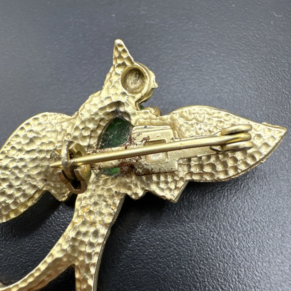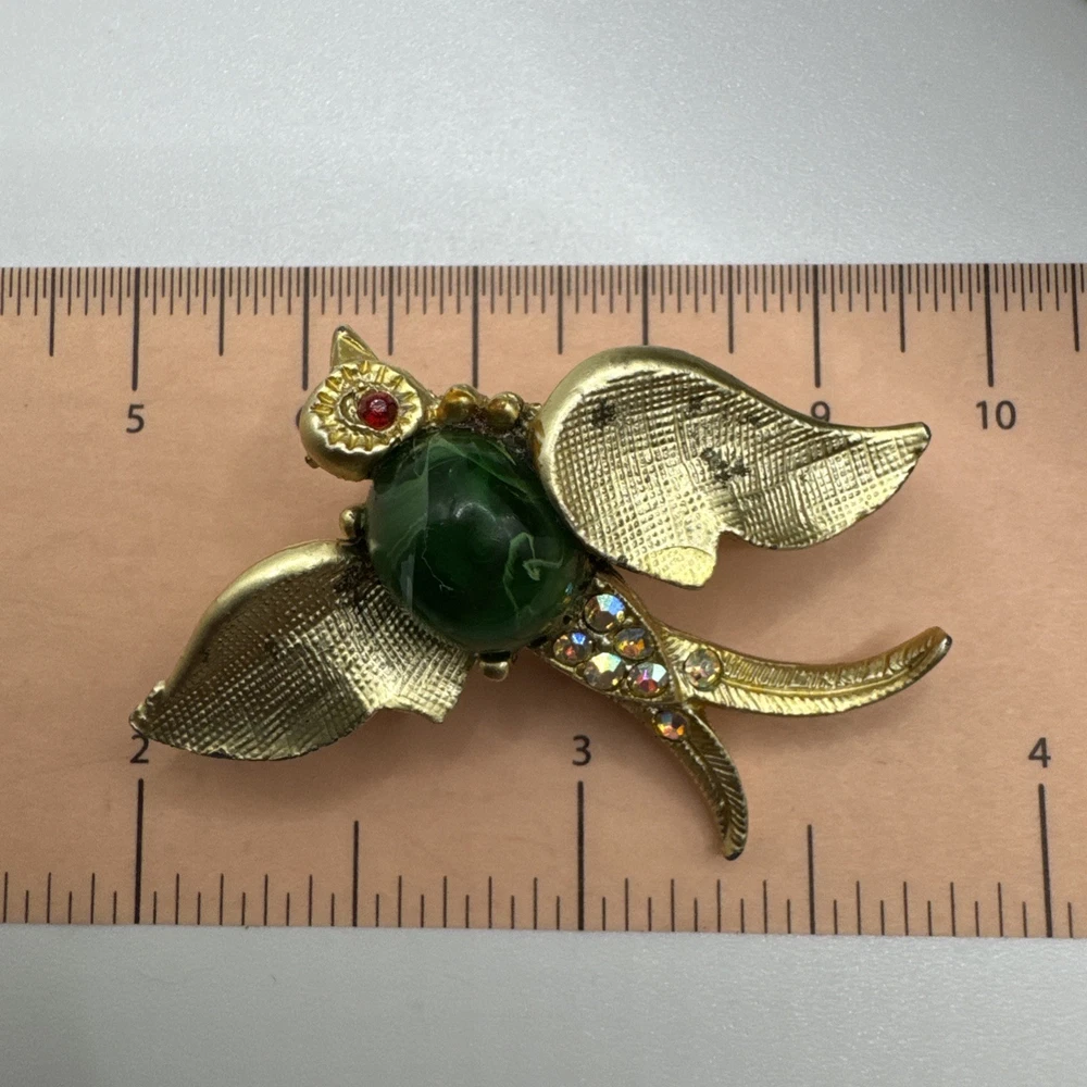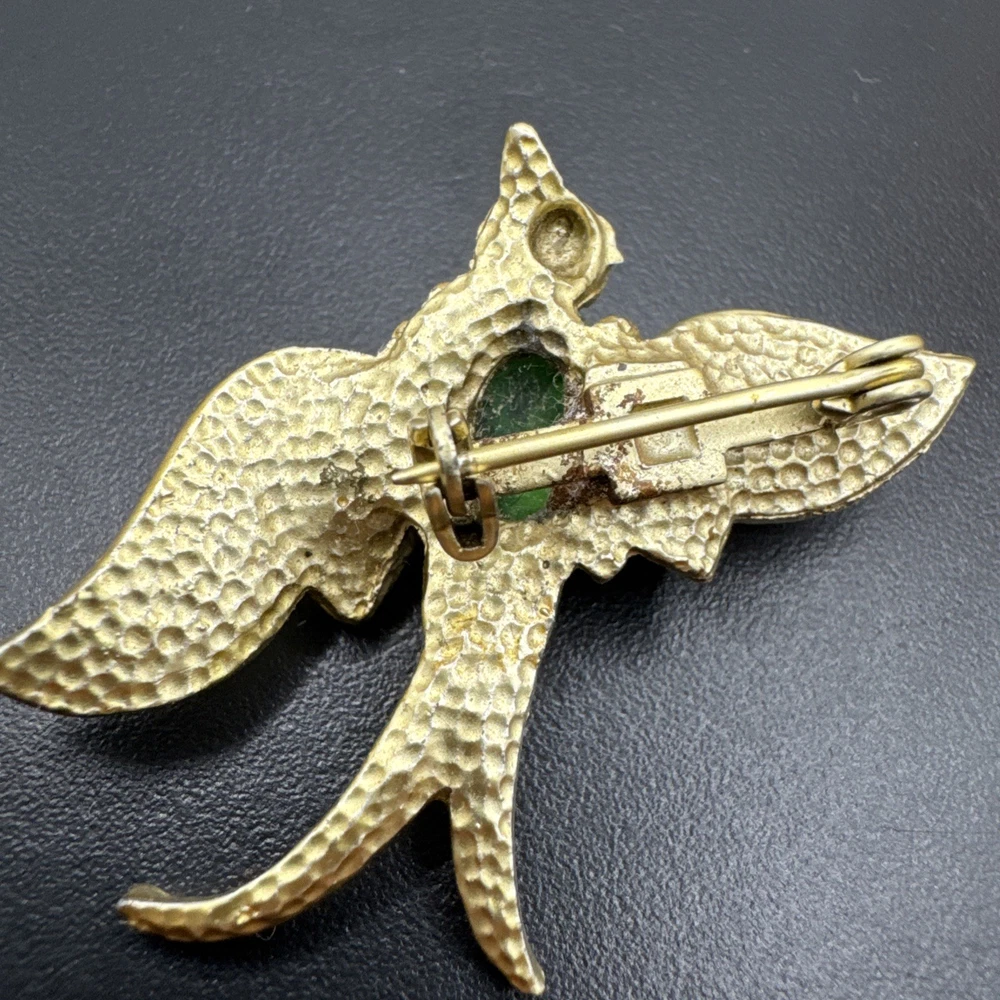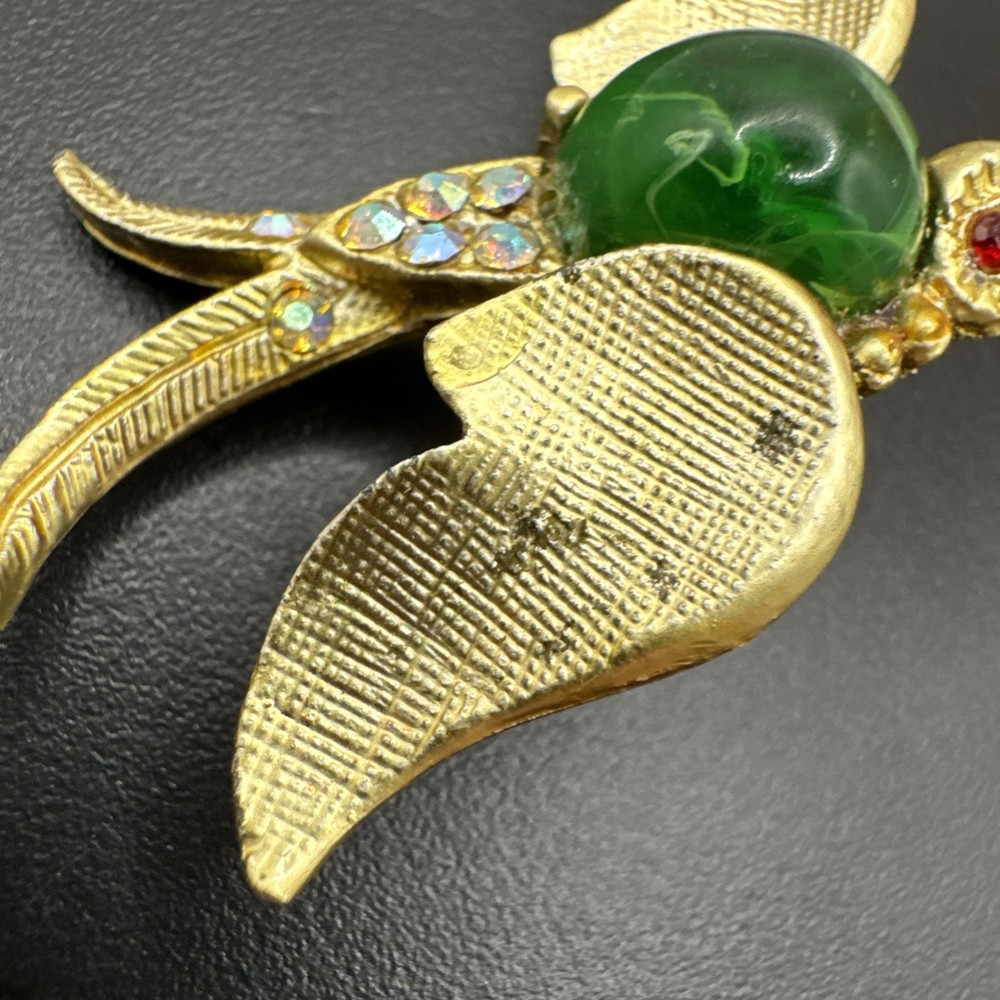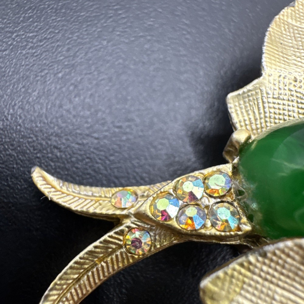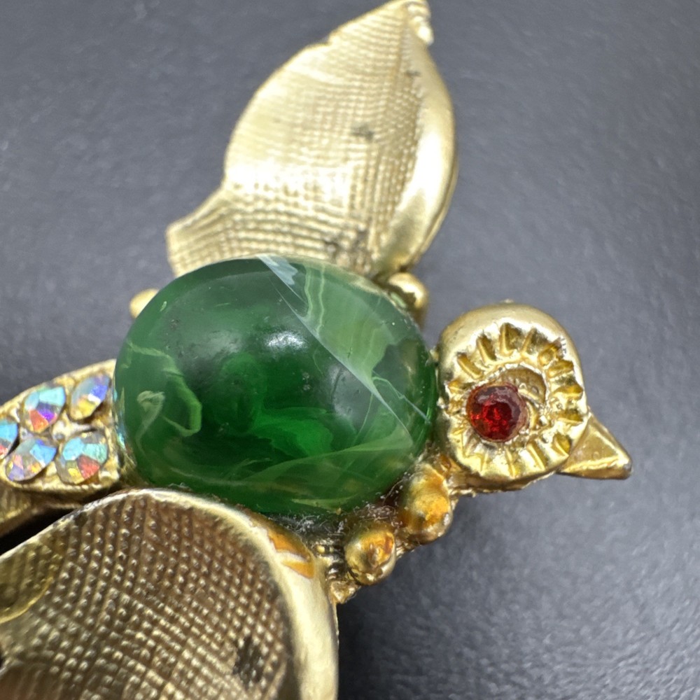 Vintage Green Cabochon Jelly Belly Bird Rhinestone Brooch