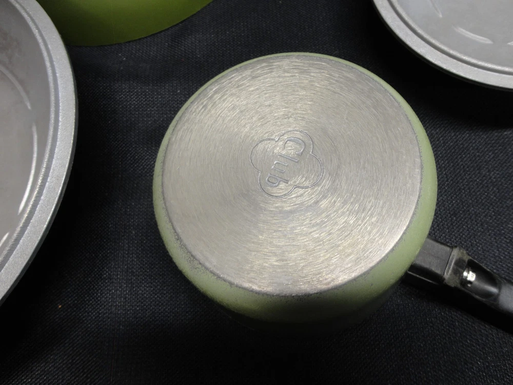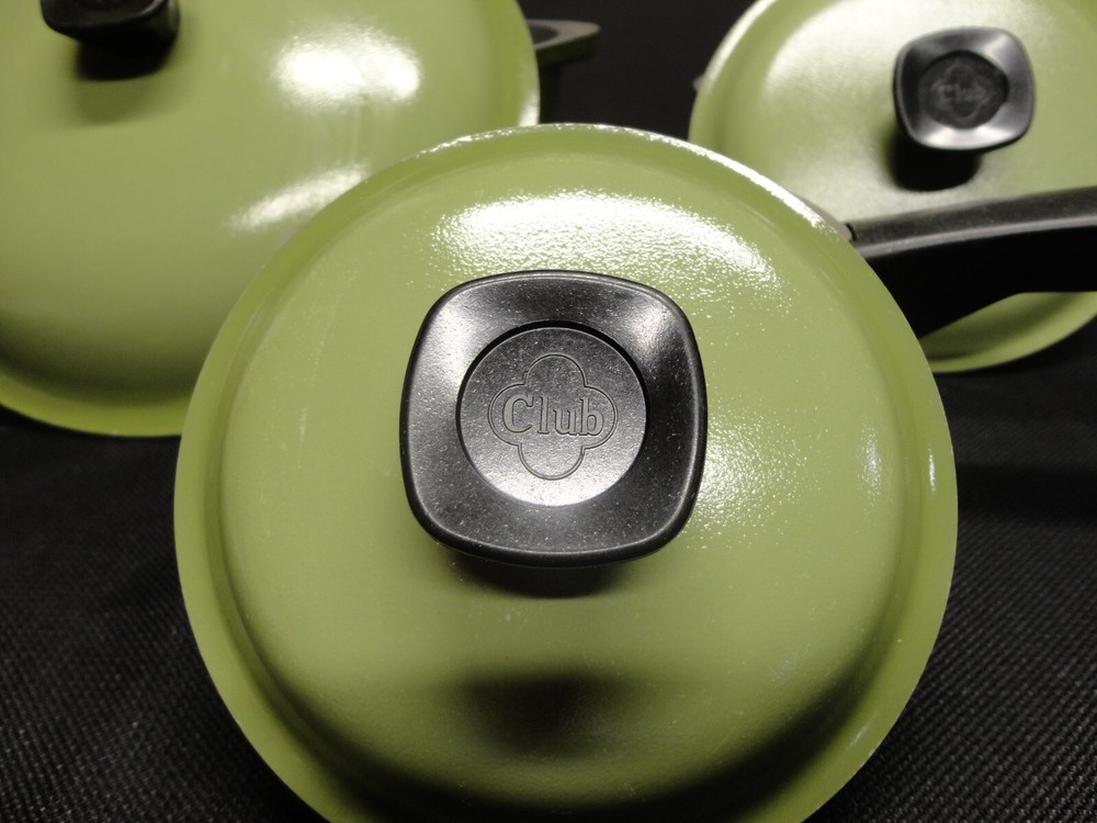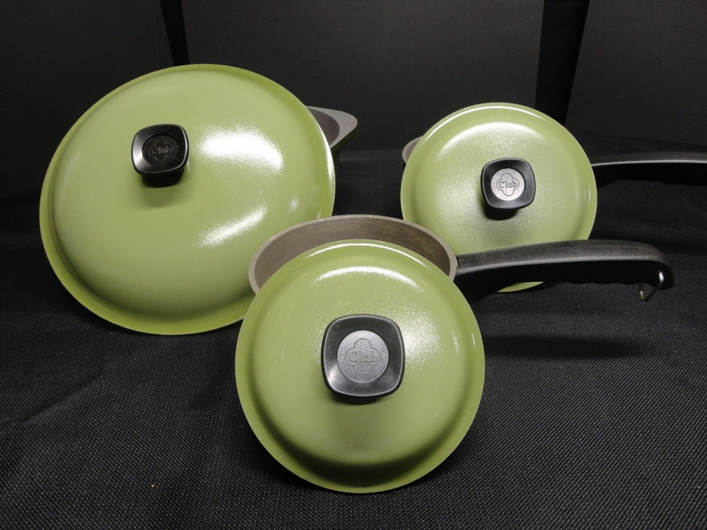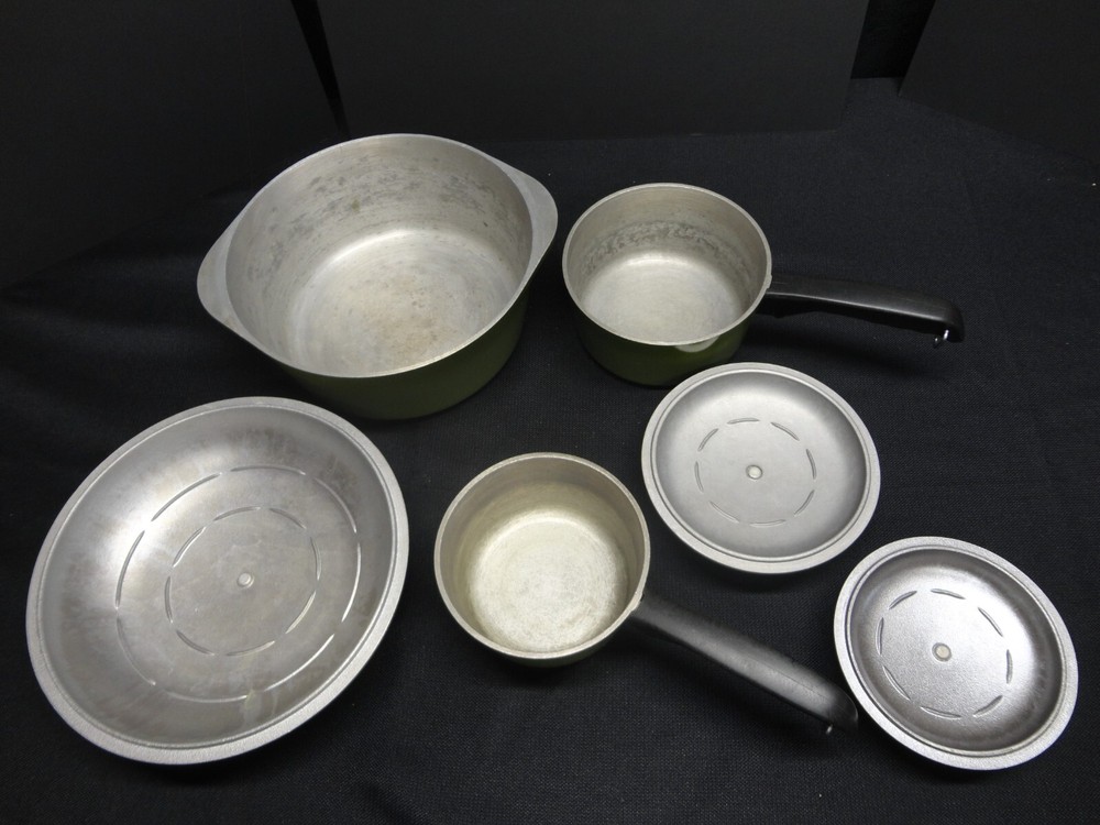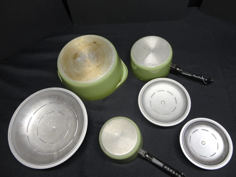 This vintage Club Aluminum six-piece pots and Dutch oven set is a rare find for collectors of antique cookware. The set includes round pots and a Dutch oven all in a classic green color with enamel paint surface coating. Made in the United States, this set is compatible with electric and gas stoves, making it a versatile addition to any kitchen. The original pieces from the Club Aluminum brand are a true vintage treasure for those who appreciate quality and nostalgia in their cooking utensils.