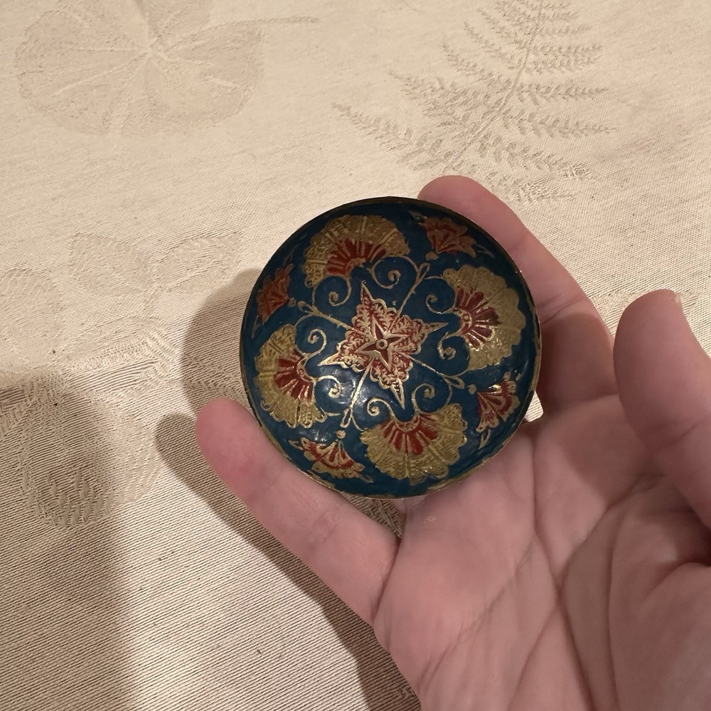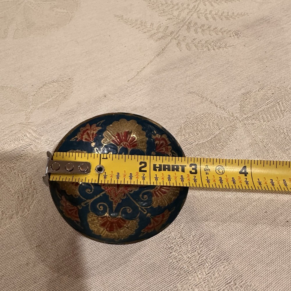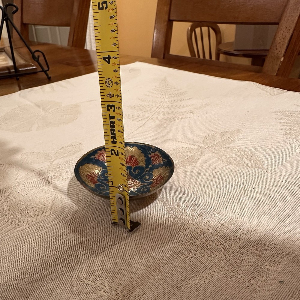 The Vintage Cloisonné Enamel Trinket Bowl features a beautiful green floral pattern on a round brass base. Handpainted with intricate details, this small trinket bowl is perfect for all occasions and can be placed in any room. Made in India by the brand Cloisonn’e, this original piece is a unique addition to any collection of keepsake boxes. Easy to clean with a damp cloth, this handmade trinket box showcases the artistry and craftsmanship of vintage design.