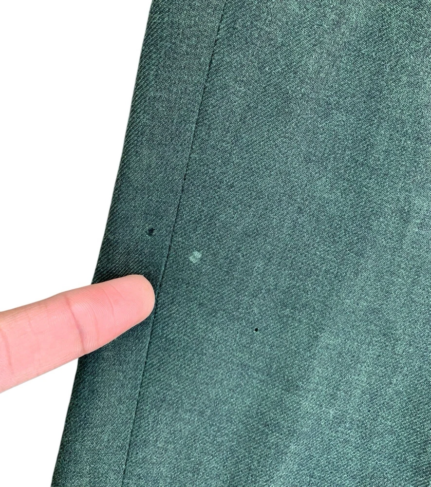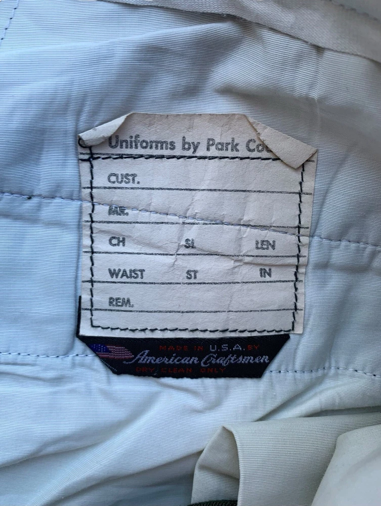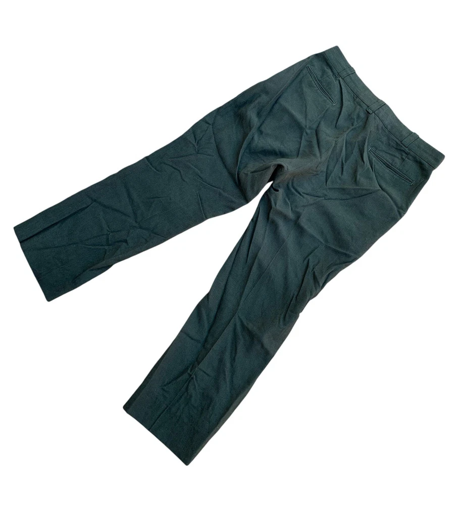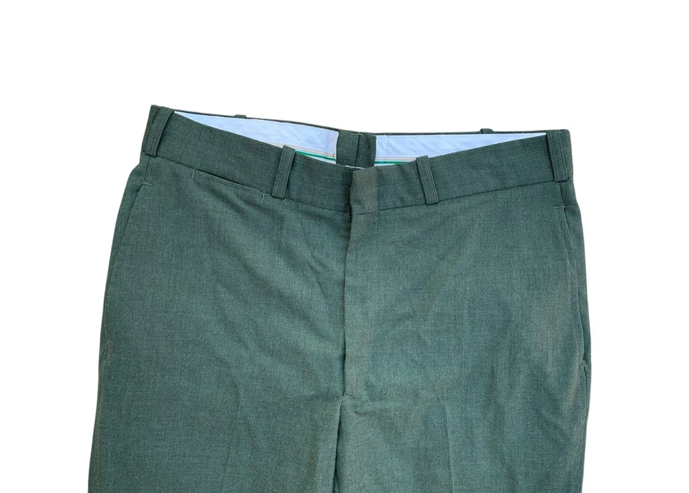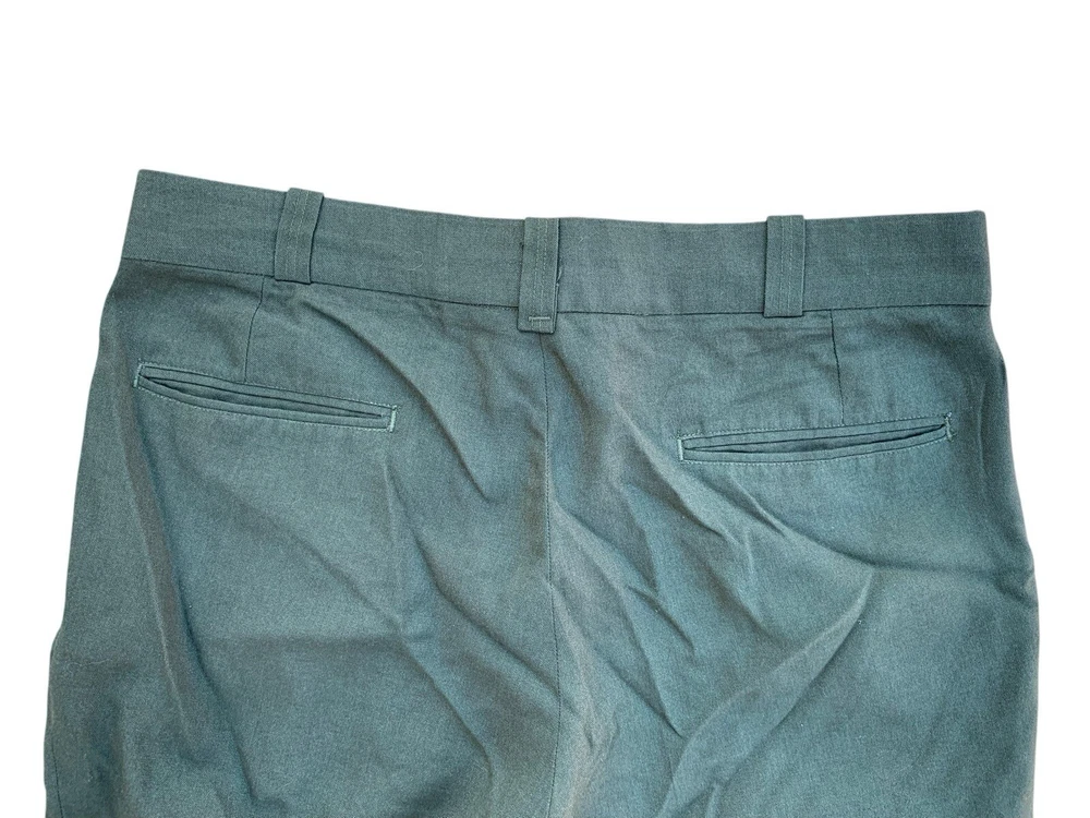 These vintage green military dress uniform pants are designed for men in size 36x32. The pants feature a flat front with a relaxed fit, suitable for various occasions including casual, formal, and business settings. Made of polyester fabric, the pants have a zipper closure, straight leg style, and adjustable waist for added comfort. With accents like a zipper and pockets, these pants have a vintage look with a theme inspired by the army and USA. Perfect for those seeking a unique and stylish addition to their wardrobe. Measurements: Waist: 18” Rise: 10” Outseam length: 41” Inseam length: 30” Leg opening: 8”