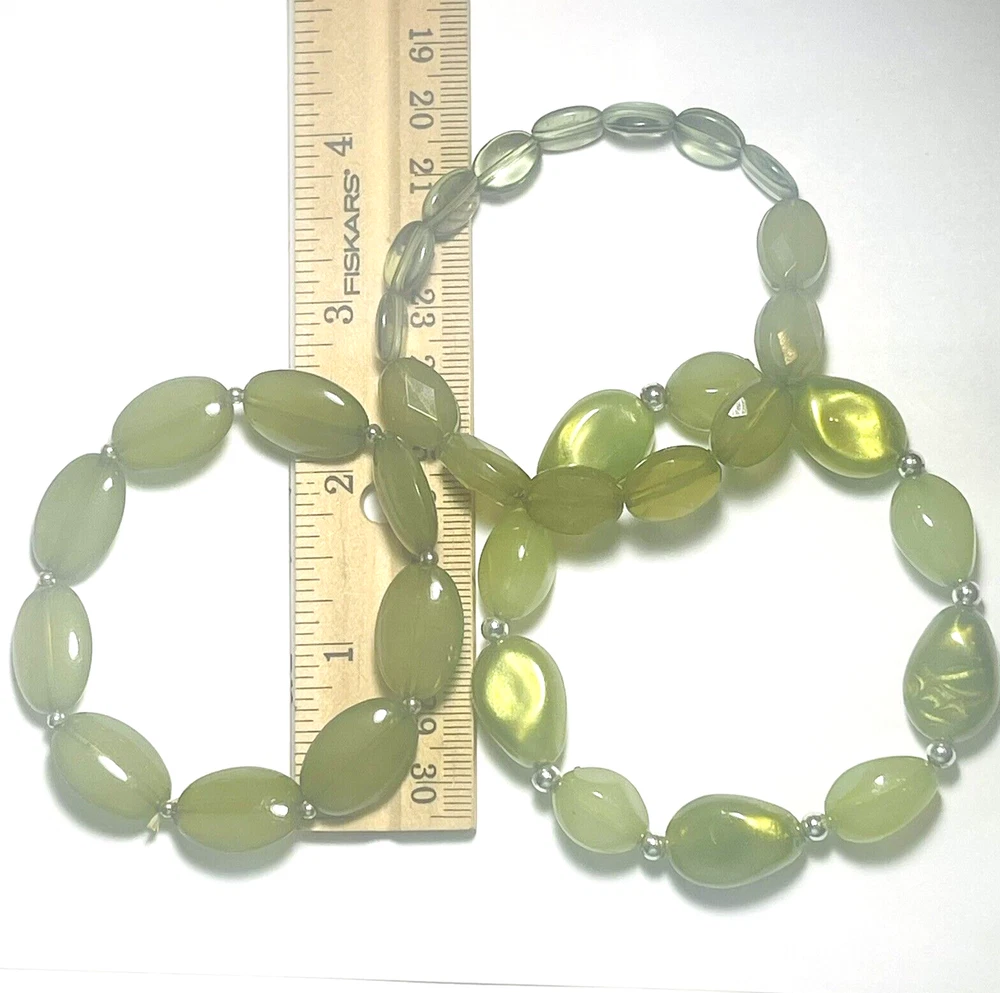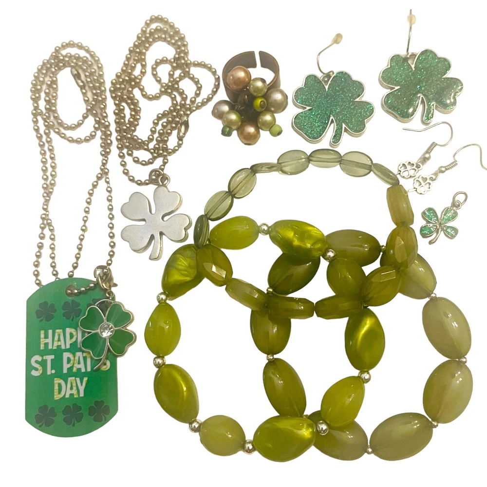 Fun lucky charms or St. Patrick's Day themed mix with necklaces, bead bracelets, earrings, pendant, charms and a ring. Pieces are wearable but would also be great for bead and charm harvest to use in your own jewelry designs and other craft projects. Collection features the color green of course and lucky four leaf clovers. 10 piece lot includes 2 ball chain necklaces with pendants and 1 four leaf clover clip charm, 3 bracelets, 2 pairs of dangle earrings, 1 adjustable ring and 1 small four leaf clover pendant. The length of the ball chains is 22 & 24 Inches. See photos taken with ruler for more description on size of jewelry. See photos. Zoom for more detail and assessment of condition. Feel free to contact me with questions. I will create custom bundles & give discounts for purchases of more than one item/listing + combine shipping for extra savings. Quotes provided on request. All sales are final. Returns are not accepted; however your satisfaction is important to me. Please reach out if there is a problem with your purchase. Thanks! PassionatelyCollected I passionately collect things.....
