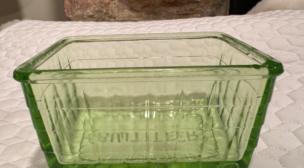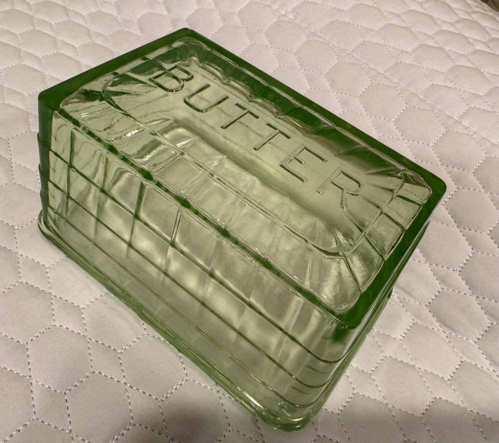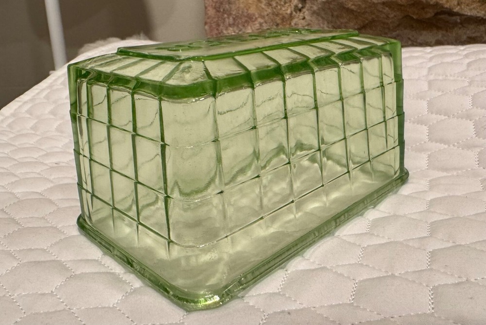 Vtg Block Optic Green Depression Vaseline Uranium Glass Cover for Butter Dish. Condition is Used. Shipped with USPS Ground Advantage.