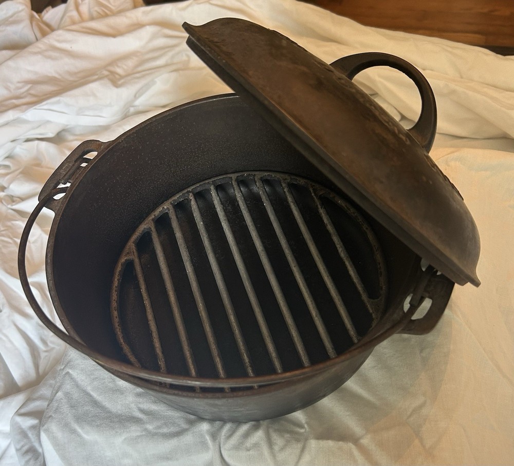 The Vintage Griswold Cast Iron No 8 Tite Top Dutch Oven is a rare collector's item that comes from the United States, specifically manufactured between 1920-1949. This two-piece set includes a round Dutch oven made of durable cast iron in a classic black color. With the brand being Griswold, known for their quality kitchen products, this original piece features a lid and is compatible with multiple stove types including induction, electric, and gas. The vintage nature of this Dutch oven adds to its collectible value, making it a sought-after item for cooking enthusiasts and collectors alike.