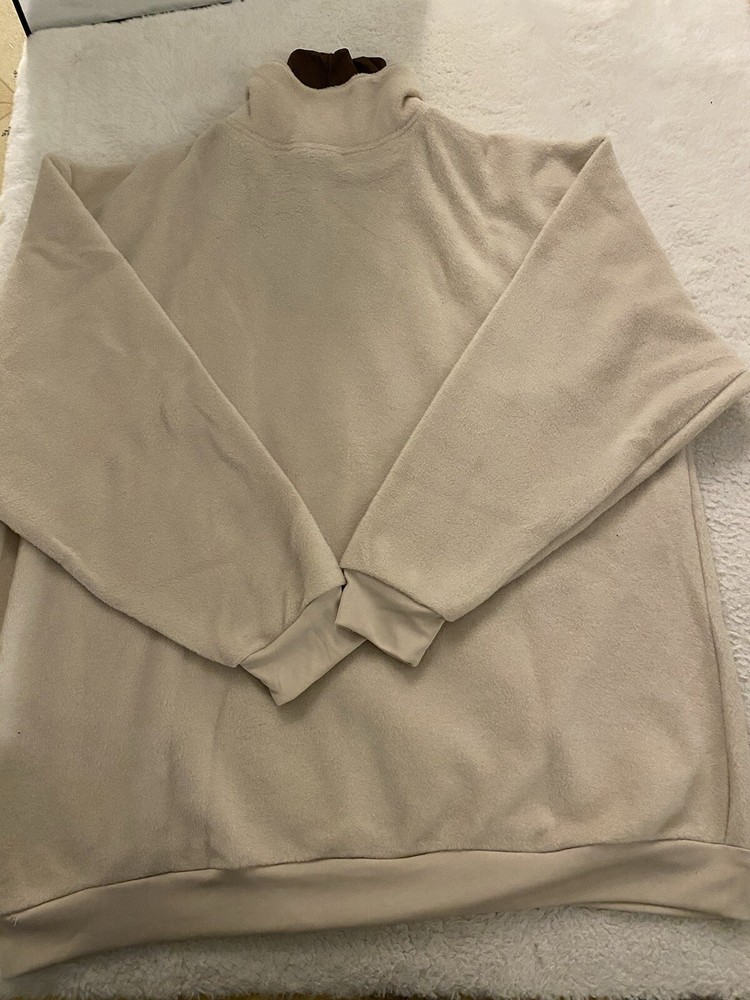This vintage HABAND sweater is a must-have for any fashion-savvy woman. The oversized pullover style is perfect for any occasion, whether it's a casual day out or a day at the office. The tight-knit fleece fabric is super soft and warm, making it a great choice for winter, summer, fall, or spring. The beige color and solid pattern add a touch of 80s and 90s nostalgia to your wardrobe. The sweater features a turtleneck neckline and long asymmetrical sleeves. It's machine washable and easy to care for. The sweater is a size 4X and can be worn as a dress. Don't miss out on this comfortable and stylish piece from SHAZILAND.