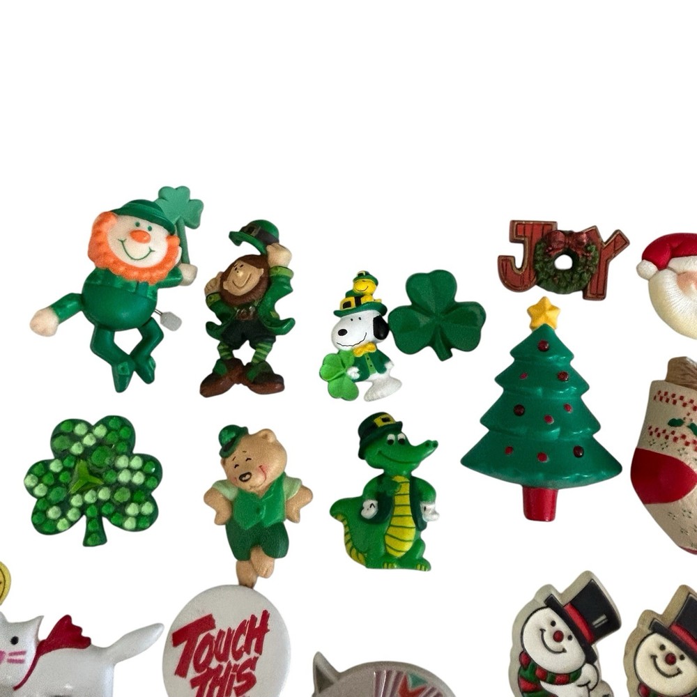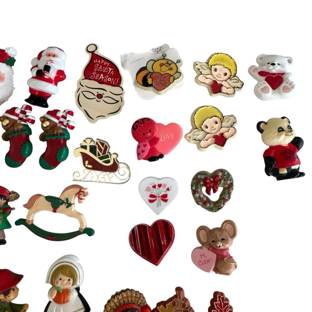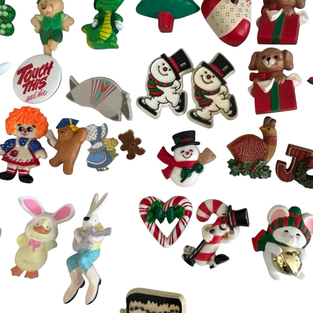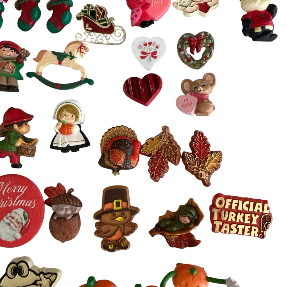 Vintage HALLMARK Variety Lapel Pins Various Holidays Lot of 101. Good pre-owned condition with normal vintage wear, a couple have light discoloration, rubs on color, see photos for details. Includes: 7 St. Patrick's Day, 32 Christmas, 6 Easter, 25 Halloween, 8 Thanksgiving, 10 Valentine's Day, 13 Misc. (SR)