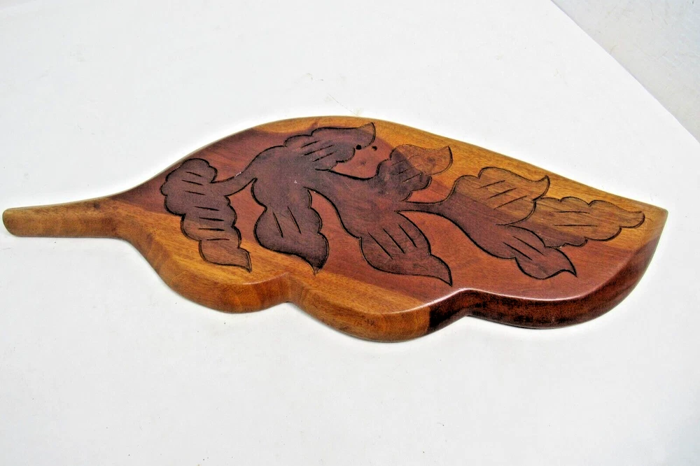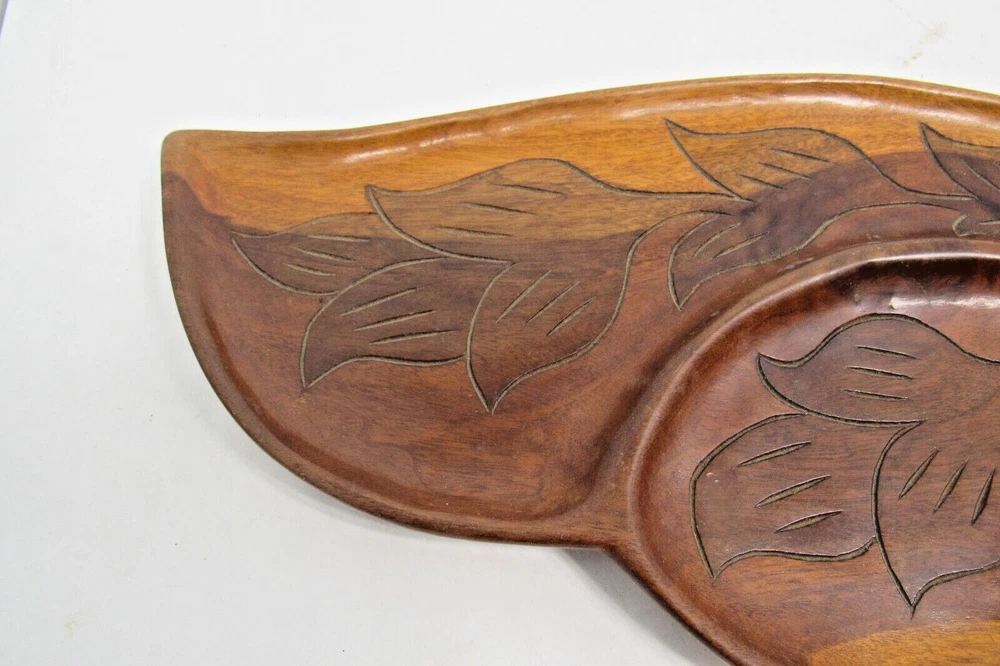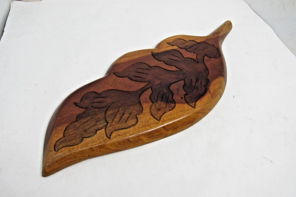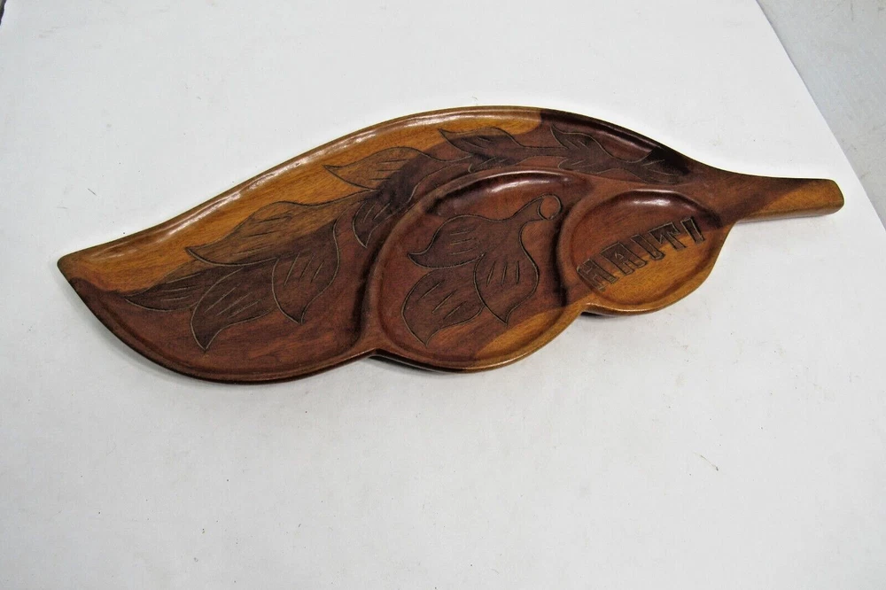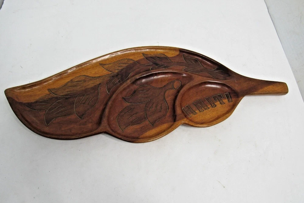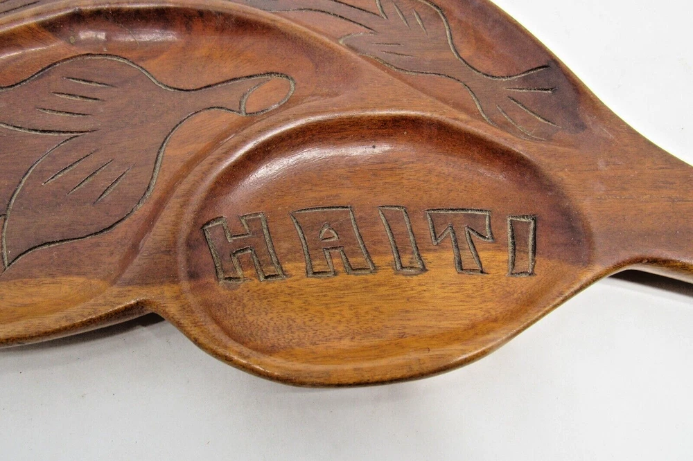 This vintage Haitian leaf-shaped oval tray platter is a unique piece of art that is hand-carved from wood. The tray has a beautiful design that showcases the rich culture and heritage of Haiti. The provenance of this tray is unknown, but it adds to the mystery and intrigue of the piece. The tray is perfect for collectors of cultural artifacts and those who appreciate handmade art. The item is not modified and is in its original condition. It can be used as a wall hanging or displayed on a tabletop. This beautiful tray is a must-have for anyone who wants to own a piece of Haitian history and culture. This tray is 20" x 8" in size. ALL OF OUR ITEMS ARE FROM A SMOKE-FREE, PET FREE ENVIRONMENT INTERNATIONAL BUYERS PLEASE NOTE: Import duties, taxes, and charges are not included in the item price or shipping cost. These charges are the buyer’s responsibility. Please check with your country’s customs office to determine what these additional costs will be prior to bidding or buying. Customs fees are normally charged by the shipping company or collected when you pick the item up. These fees are not additional shipping charges. We won’t under-value merchandise or mark the item as a gift on customs forms. Doing that is against U.S. and international laws. RESPONSE TO EMAILS: We try our best to respond to your questions within 2 hours. However, we are just a husband and wife team, not a corporation. We work from 7:00 to 5:00 Monday through Saturday. We are not here on Sunday to respond to your questions.