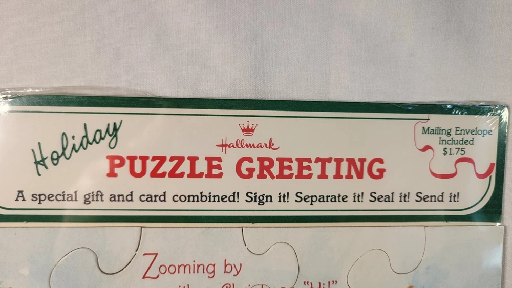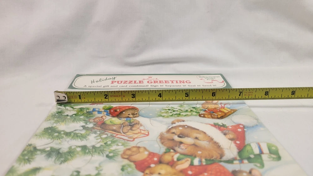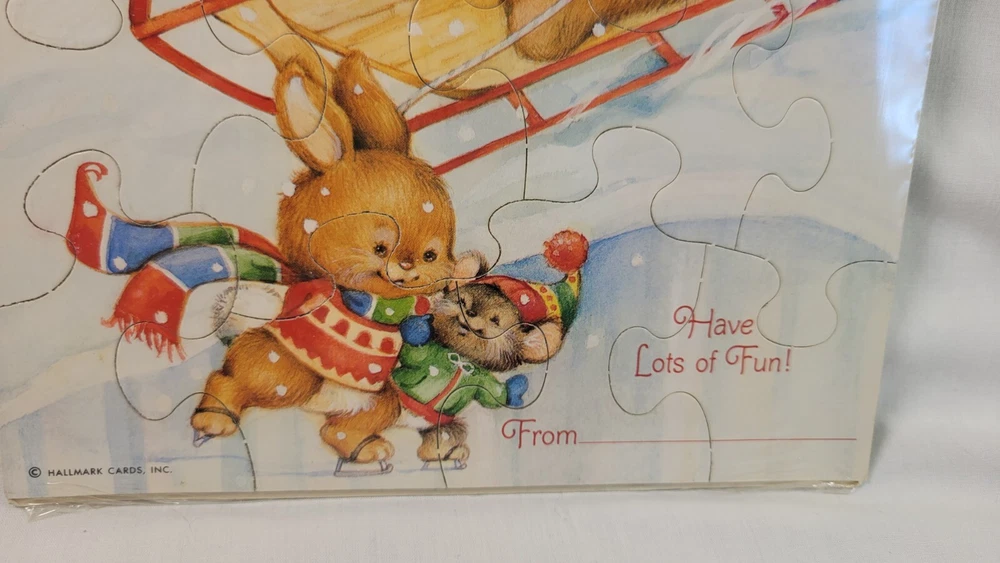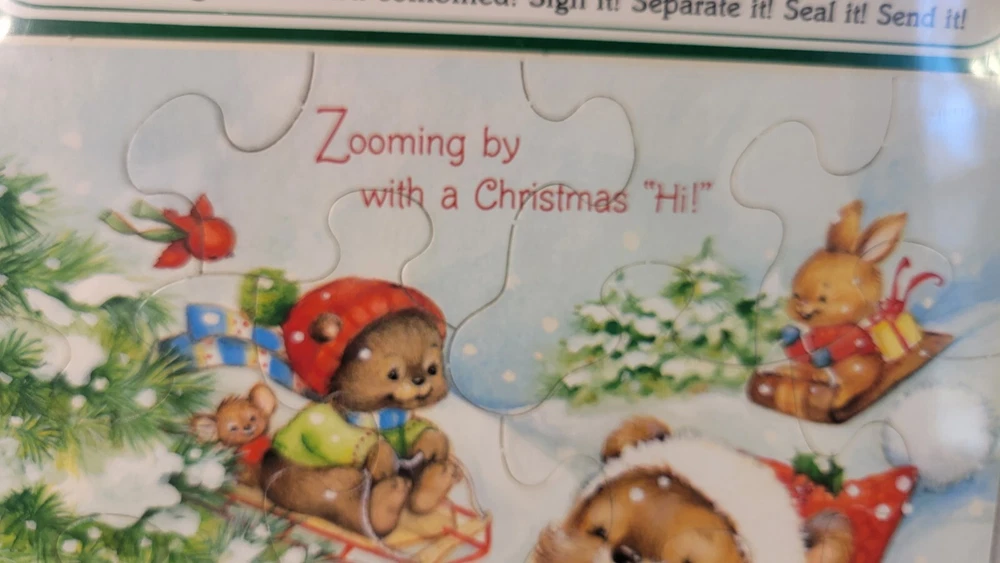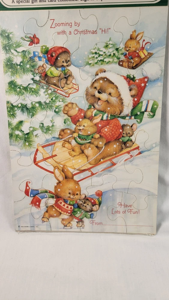 Vintage Hallmark Holiday Puzzle Greeting Card Sealed. Zooming by with a Christmas "Hi"! Very cute Wintery scene with animals sledding amd skating in the snow. Perfect way to send a Hi to a loved one or friend. Comes from a smoke-free environment.