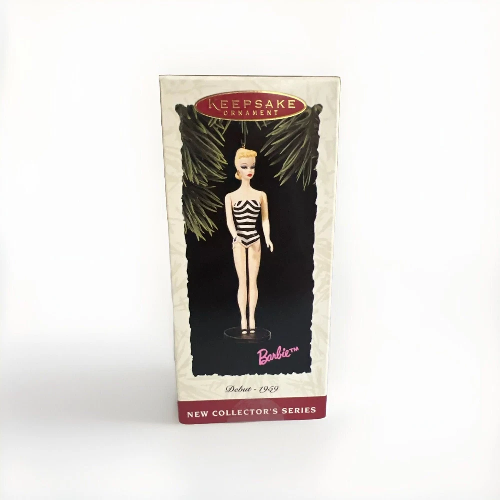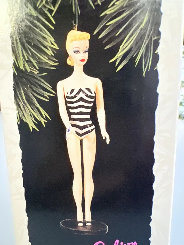 Add a touch of nostalgia to your holiday decor with this vintage Hallmark Keepsake Barbie Debut 1959 Black Striped Swimsuit Ornament from 1994. This ornament features Debut Barbie 1954 in a black striped swimsuit, perfect for a Christmas occasion. The Hallmark brand is known for its quality and this ornament is no exception. With its unique design and vintage charm, it is sure to be a standout piece in any collection. Celebrate the holiday season in style with this one-of-a-kind Barbie ornament. I am in the process of listing over 100 vintage Hallmark keepsake ornaments. Please check out my store and contact me for combined pricing.