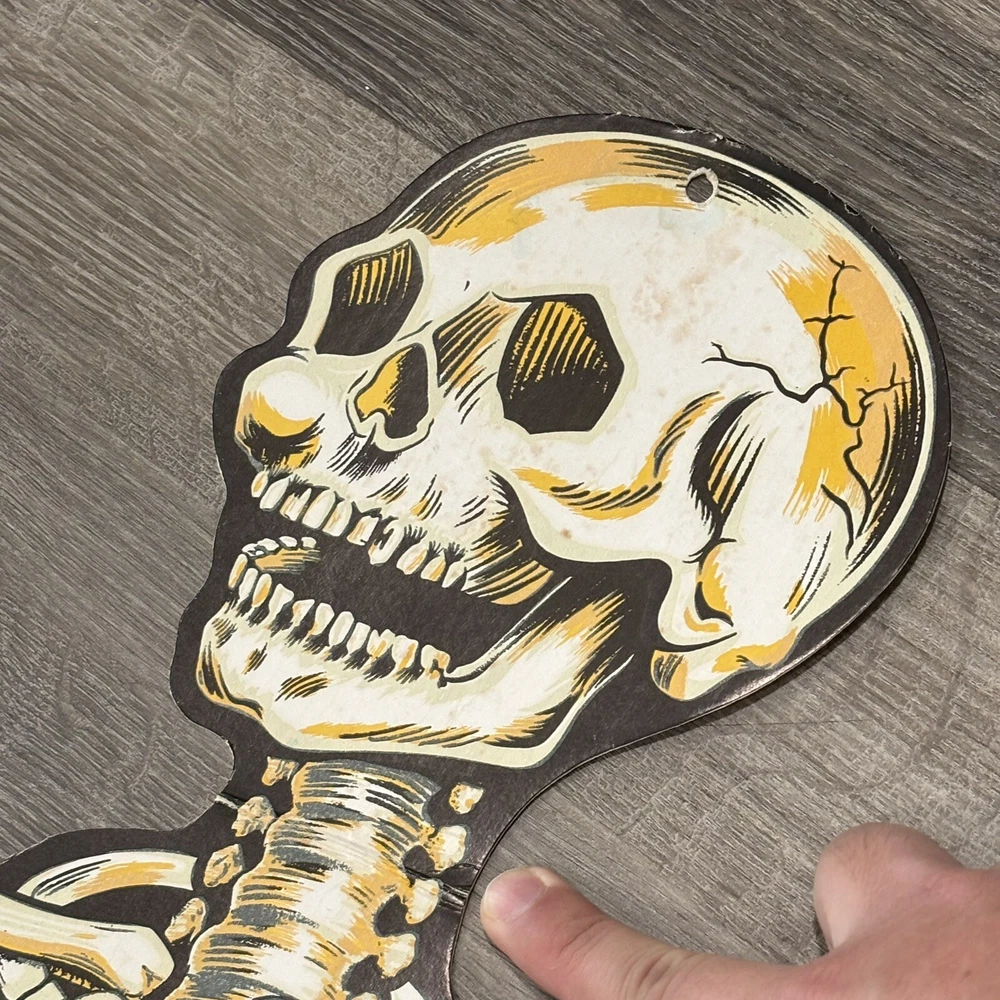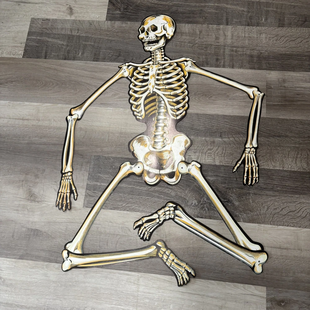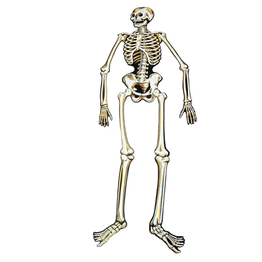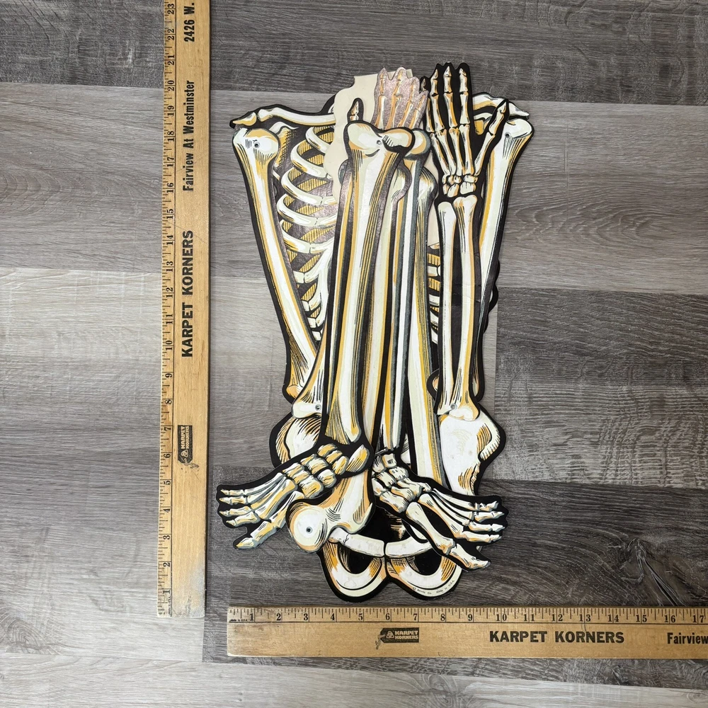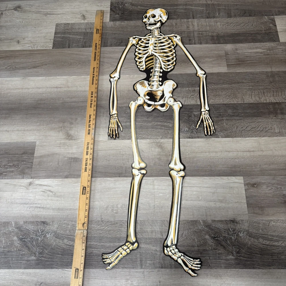 Brand:BeistleOccasion:HalloweenCharacter:SkeletonSubject:SkeletonFeatures:Glow in the DarkOriginal/Reproduction:OriginalMaterial:CardboardItem Height:54inPattern:VintageSuitable For:Door, WallSize:LargeColor:WhiteItem Length:54"Type:Diecut Decoration