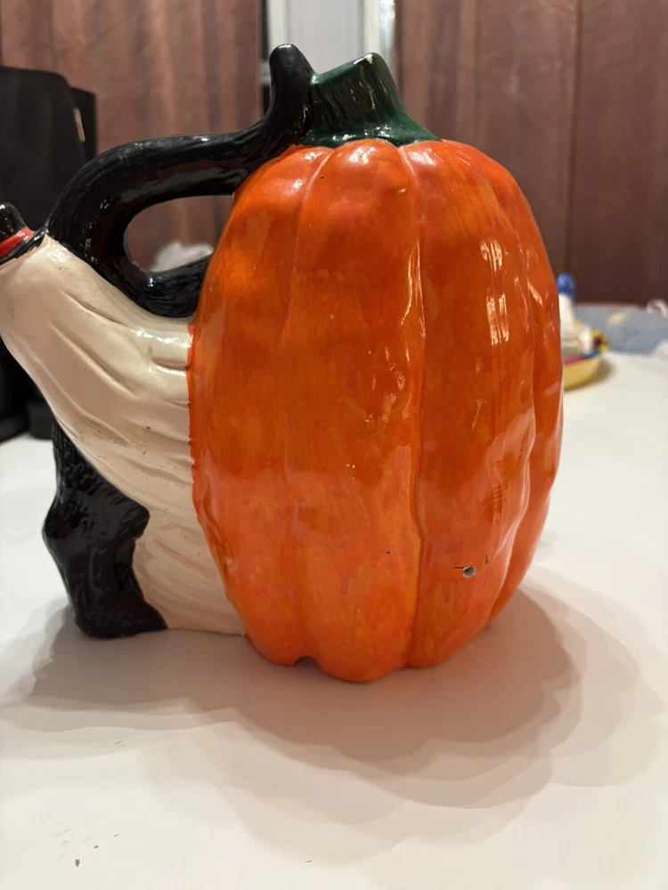 This vintage Halloween decoration is sure to add a spooky touch to your home. Featuring a black cat with a mischievous expression, this ceramic piece is made in Taiwan and has a unique pumpkin pattern. The ghost subject adds to the creepy atmosphere, making it perfect for Halloween occasions. The CAT brand adds value to this collectible item, and it's a great addition to any holiday or seasonal wall décor. Don't miss out on the chance to own this one-of-a-kind piece.