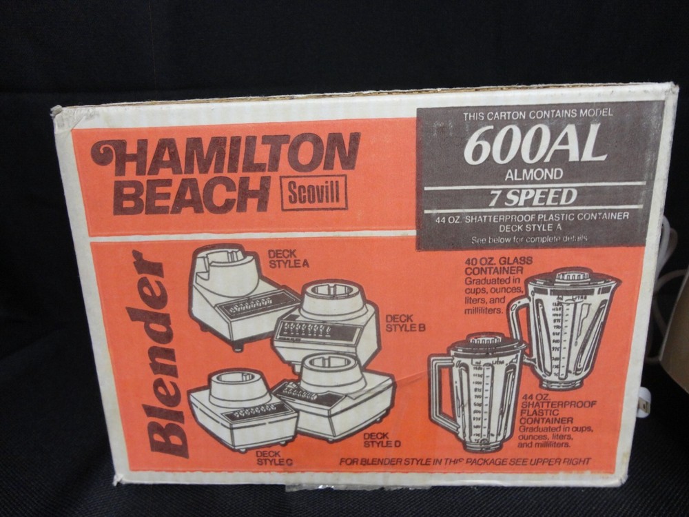 Power Source:ElectricAppliance Capabilities:Blend, PureeUPC:Does not applyVoltage:120 VNumber of Settings/Programs:7Number of Blades:4Country/Region of Manufacture:United StatesModel:Hamiltom Beach 600-1Brand:Hamilton BeachMaterial:PlasticNumber of Speeds:7Type:Electric Blendergtin13:Does not applyColor:BeigeFeatures:High Speed, Multipurpose, Speed SettingComponents Included:BlenderAppliance Uses:Frozen Drink, Sauce, SmoothieMPN:651Power:330 wNumber of Items:1Capacity:44 oz