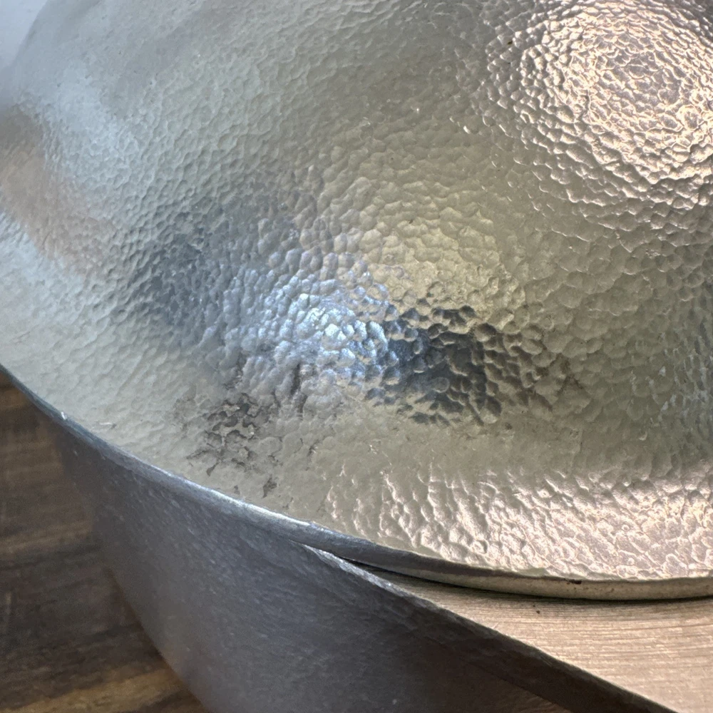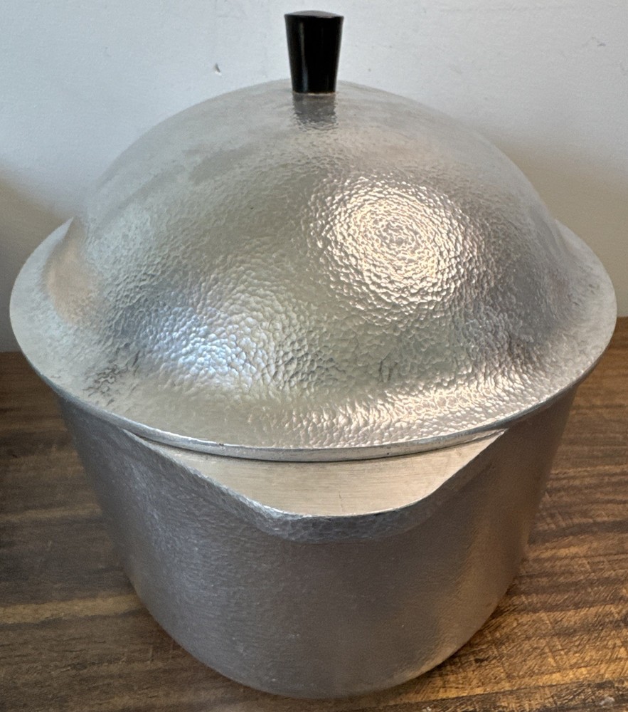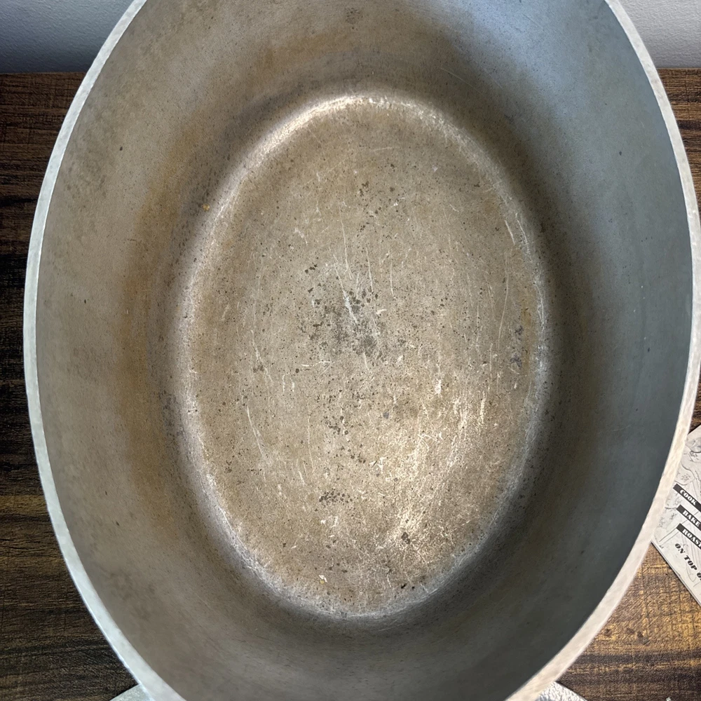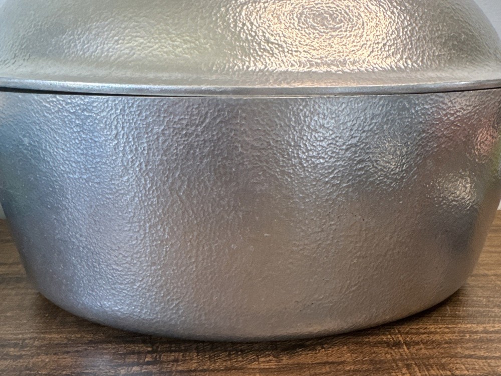 The Vintage Hammercraft Club Hammered Aluminum 15" Oval Roaster Dutch Oven with Lid is a collectible kitchen piece from the 1950s, made in the United States. This two-piece set includes an oval roaster and a matching lid, crafted from cast aluminum with a silver surface coating. The 15" roaster features handles for easy transport and can be used on both electric and gas stoves. Its vintage charm and original design make it a unique addition to any kitchen collection, perfect for cooking on a retro stove. Scratches or marks it is pre-loved. Good shape!