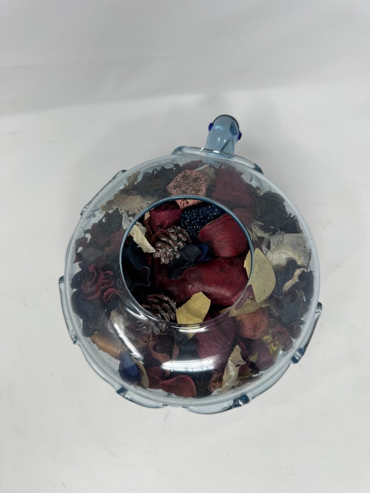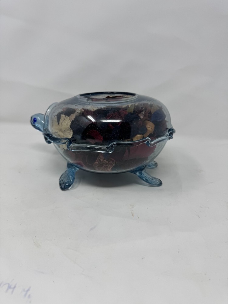 This is a vintage hand-blown glass turtle-shaped bowl , originally designed to hold potpourri or decorative items. The glass is a beautiful transparent blue , giving it an oceanic, coastal feel. The turtle's legs, tail, and head are detailed, making this a unique collectible decor piece for sea life enthusiasts. π Key Details: β Handmade, hand-blown glass β Measures 7 β L x 6β W x 4β H β Holds potpourri, trinkets, or decorative stones β Condition : Has a small chip on the belly (see images), but otherwise in good shape β Ideal for coastal, nautical, or cottagecore-themed homes π Great for collectors, beach house decor, or as a unique gift! Additional Note: (stuffed with aroma pieces) chip on belly