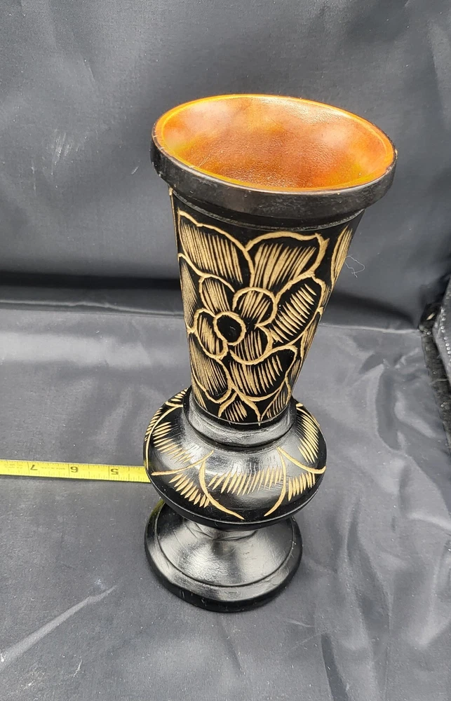 Vintage Hand Carved Floral Turned Wood Pedestal Vase Vessel Approximately 9.5" H x 4 " W Condition is good - used See pictures for more details