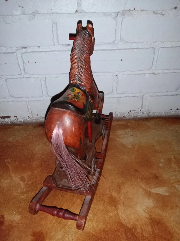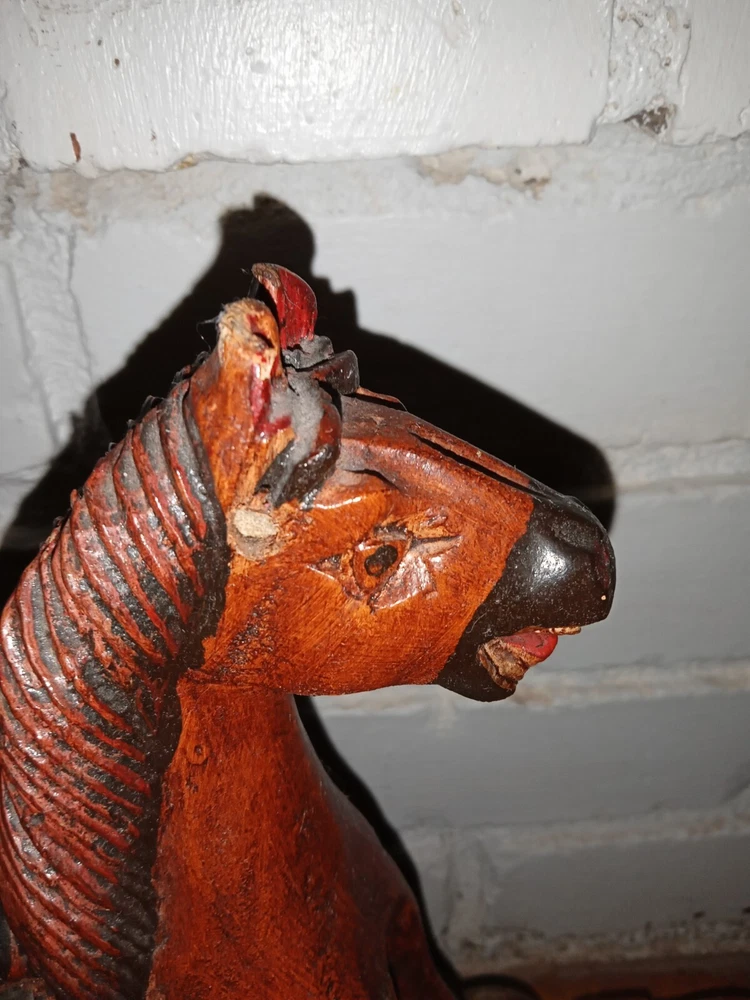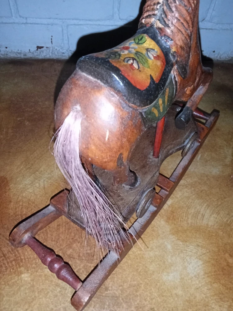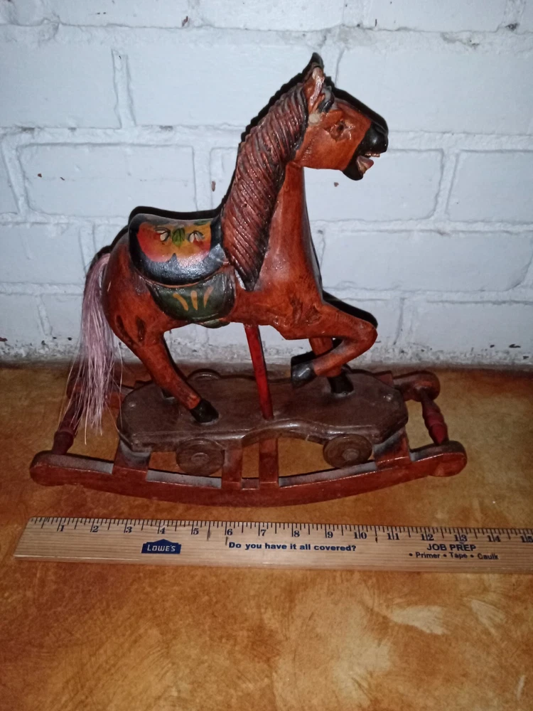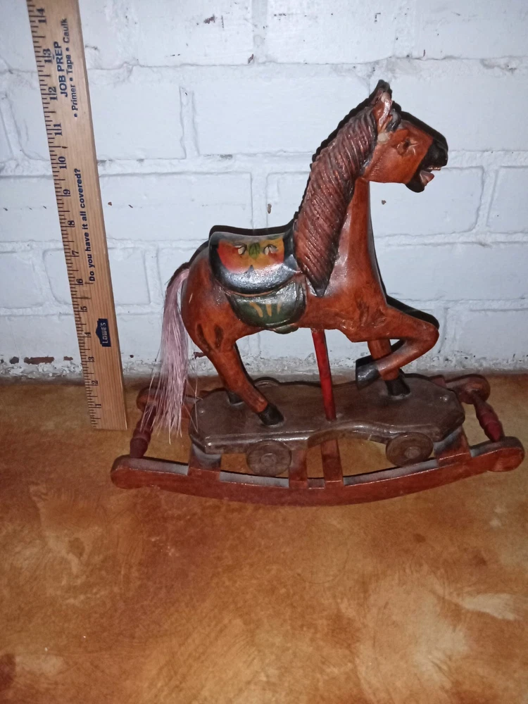 Vintage Hand Carved Wooden Platform Horse on Wheels Wood Carving Primitive Carousel Horse Pull Toy Folk Art Home Decor There is some as-expected damage such as scuffs and chips in the paint here and there, and the horsehair tail has seen better days as most of the hairs have been long gone, but that could be repaired fairly easily if desired. The tail is like bristles. Saddle is painted mahogany. It has a missing wooden peg piece on the right ear see picture #12. Dimensions Height: 12 " Width: 4" Length: 13 " Please let me know if you have any questions. Thanks for looking.