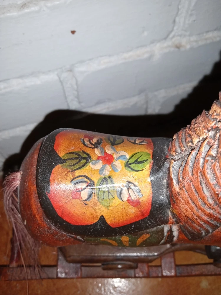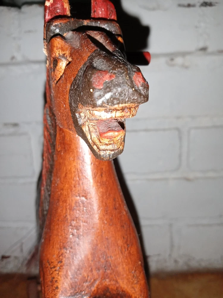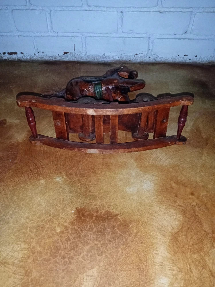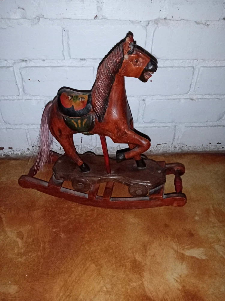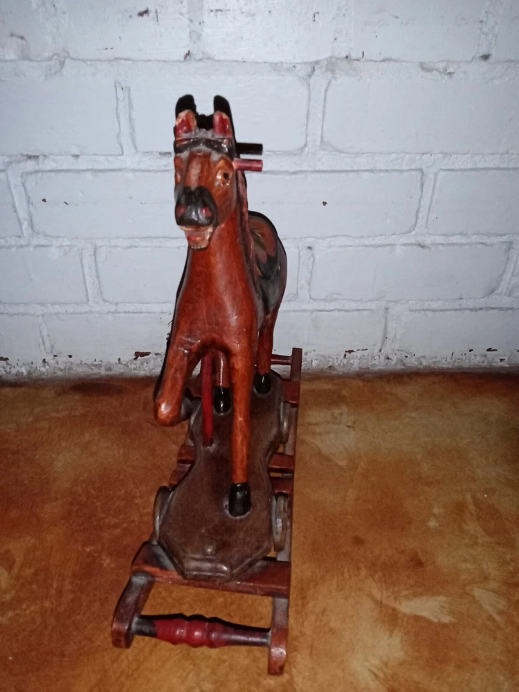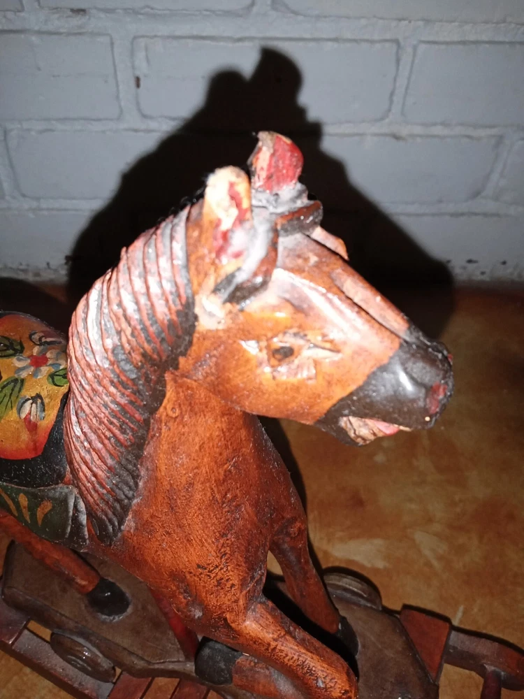 Vintage Hand Carved Wooden Platform Horse on Wheels Wood Carving Primitive Carousel Horse Pull Toy Folk Art Home Decor There is some as-expected damage such as scuffs and chips in the paint here and there, and the horsehair tail has seen better days as most of the hairs have been long gone, but that could be repaired fairly easily if desired. The tail is like bristles. Saddle is painted mahogany. It has a missing wooden peg piece on the right ear see picture #12. Dimensions Height: 12 " Width: 4" Length: 13 " Please let me know if you have any questions. Thanks for looking.