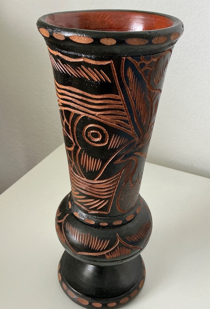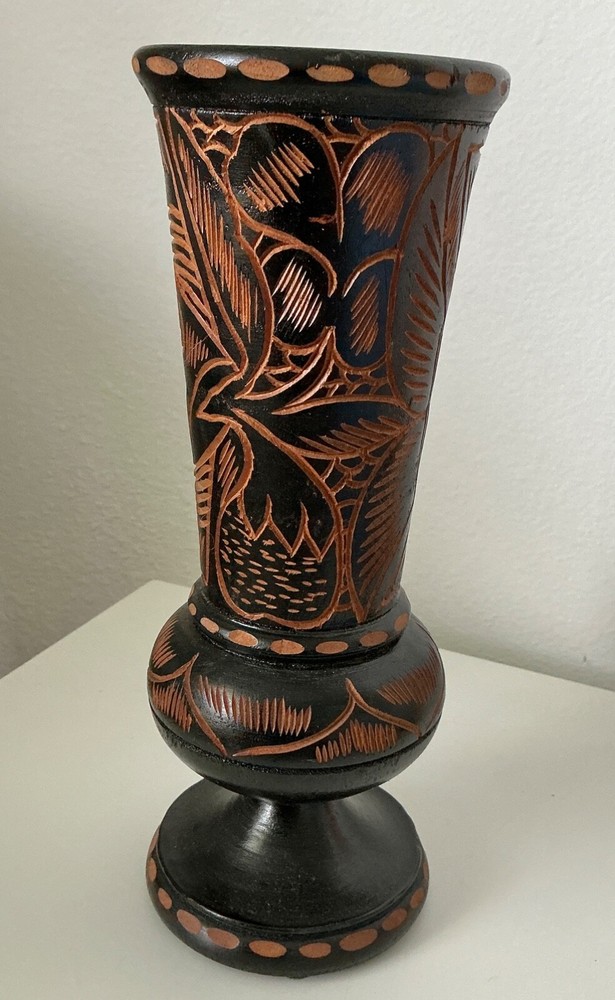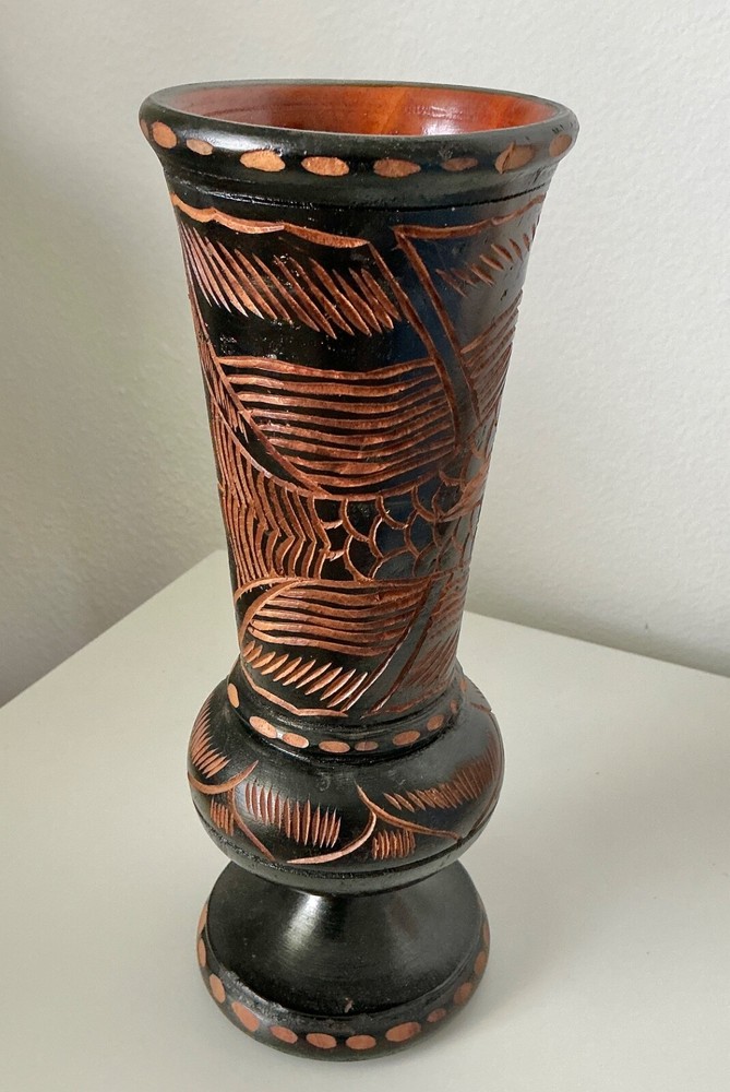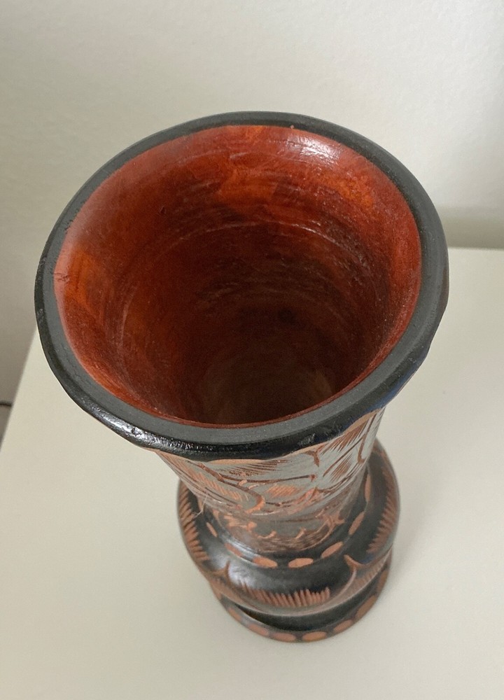 Vintage Hand Carved Wooden Pedestal Vase with Flower