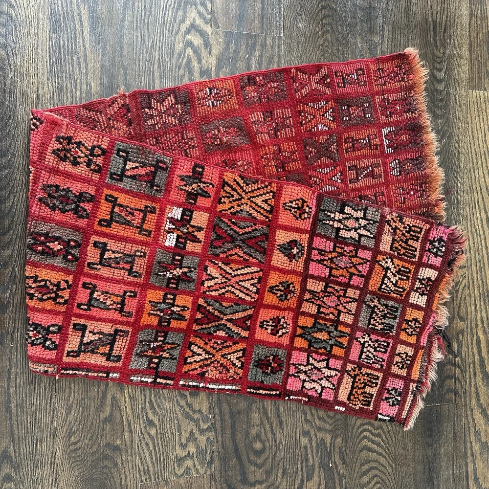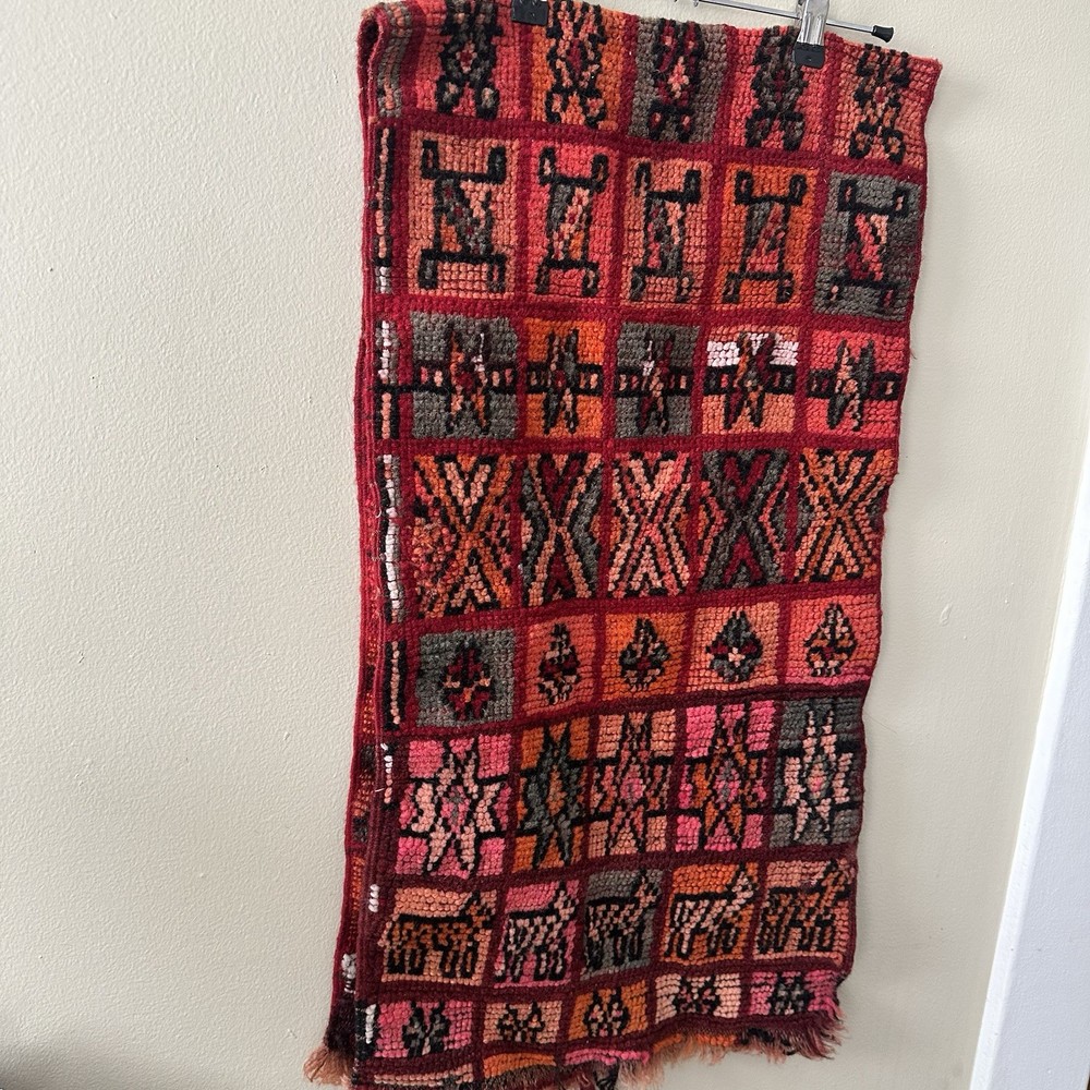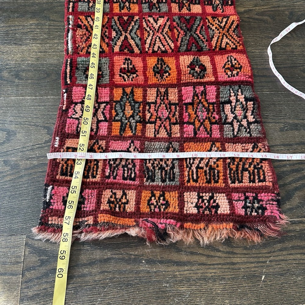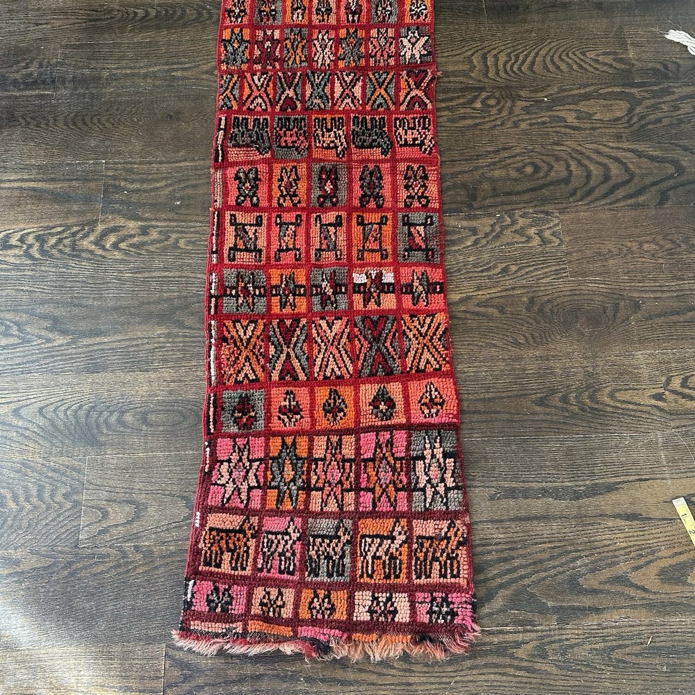 Vintage hand hooked runner rug featuring geometric and animal motifs in rich reds, pinks, and charcoal tones. I bought this at an antique store and there was no tag so don’t have much info on it. It is machine washable. Approx. 16” x 58” Great for hallway, entryway, or layered boho decor. Shows normal vintage wear consistent with age.
