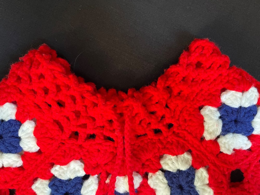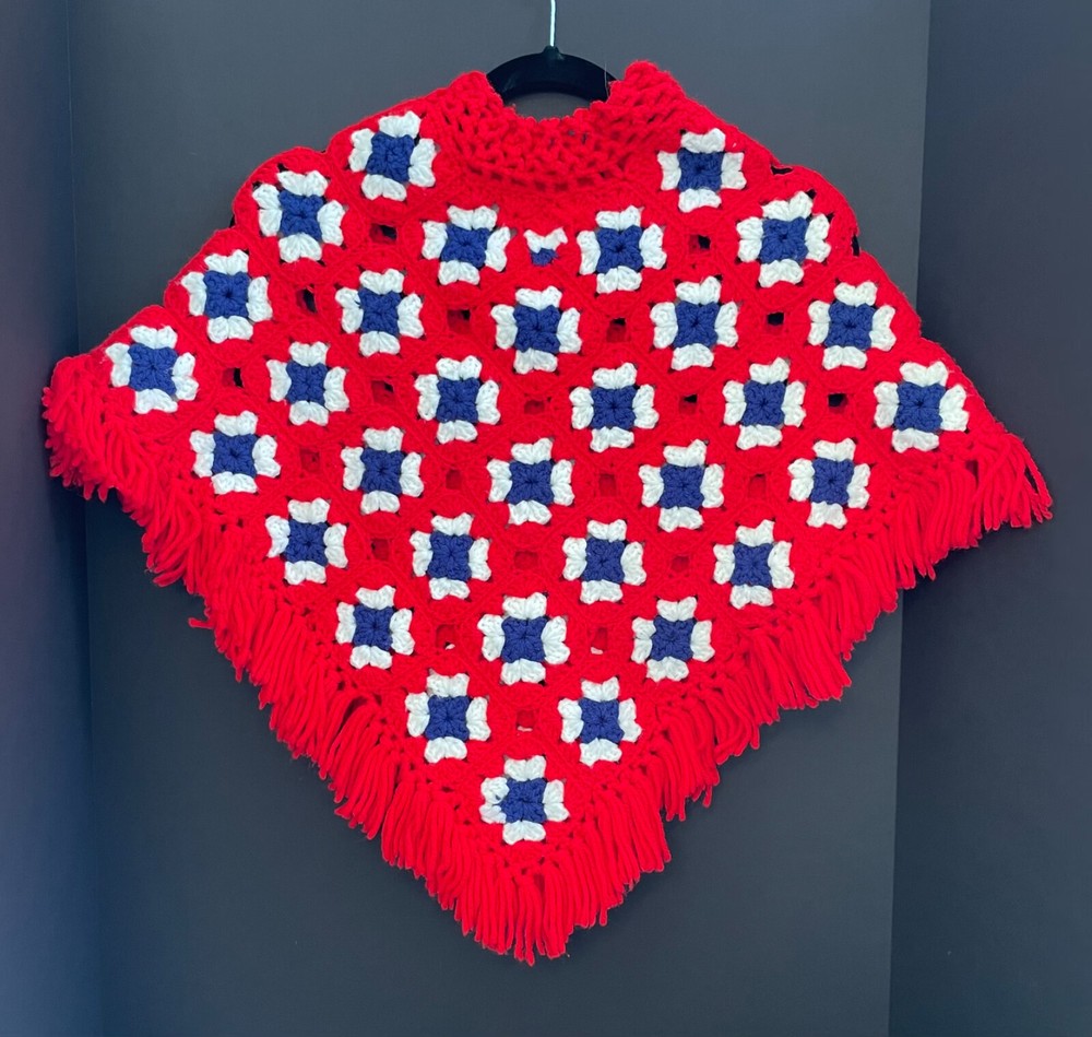 This is a vintage little girls' poncho found in grandma's closet. Hand crocheted probably in the early 70's. Not sure what yarn was used, cotton or a blend. I tried it on my 3 and 5 year olds and it was adorable! The poncho measures 26" at the widest section across and 23" from the neck to the bottom. The head piece is approximately 17" X 6 1/2". Thanks for looking!
