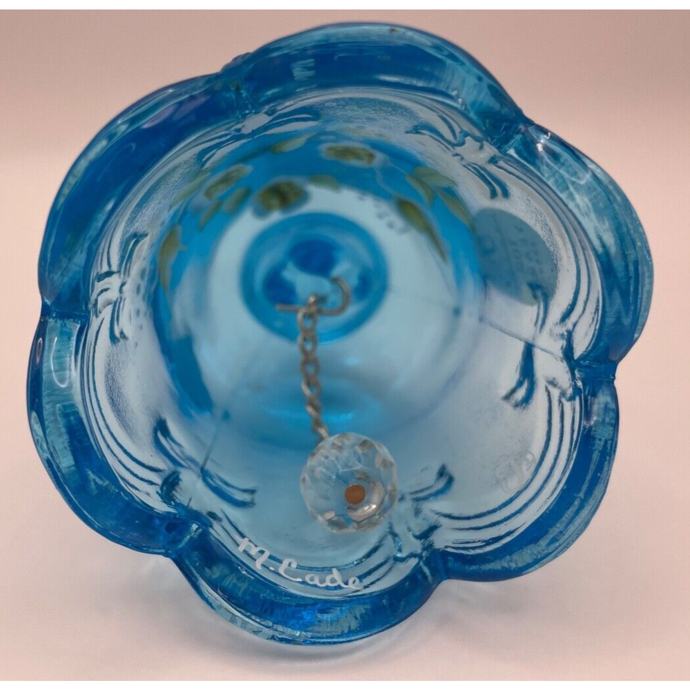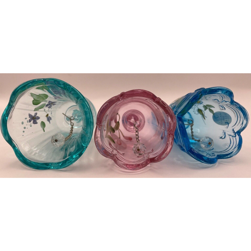 This vintage set of three Fenton bells is perfect for any collector or lover of traditional style. Each bell is hand painted with intricate floral designs, bows, and drapes, making them a beautiful addition to any room. The bells are signed by the artists M. Cade, M. Shyuer, and L. Everson, and stamped with the Fenton brand. The bells are made of pressed glass and have a high gloss finish. They are suitable for indoor use and require no additional parts. Care instructions include wiping gently with a dry cloth. This special edition set is retired and discontinued, making it a rare find for collectors. Don't miss your chance to own these limited edition commemorative bells. These exquisite Fenton Bells are in excellent, like new condition. They have no cracks, no chips. A must have for collectors!