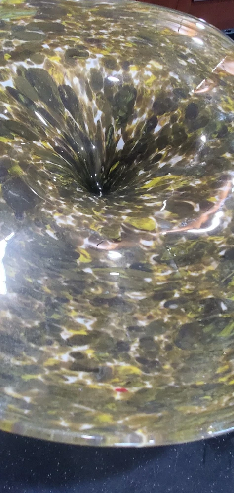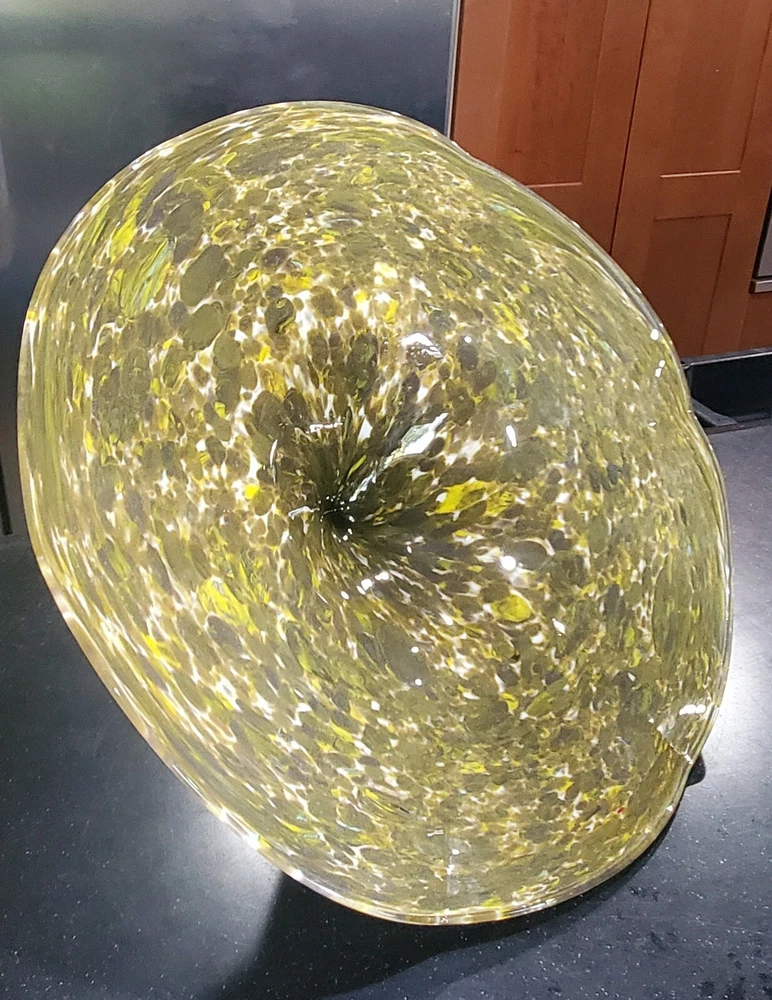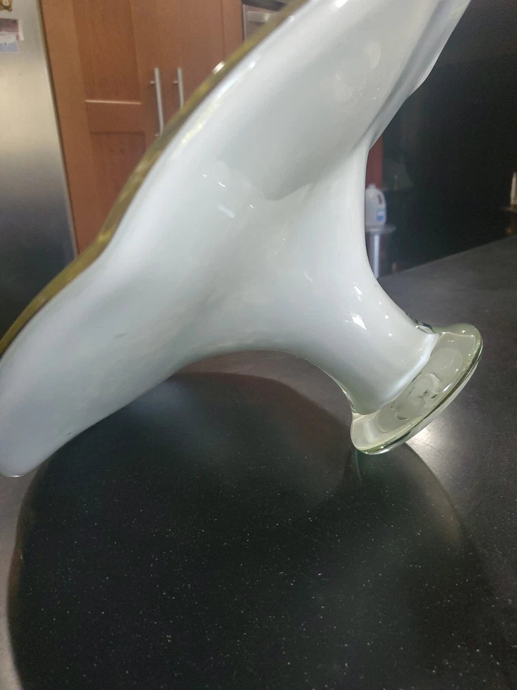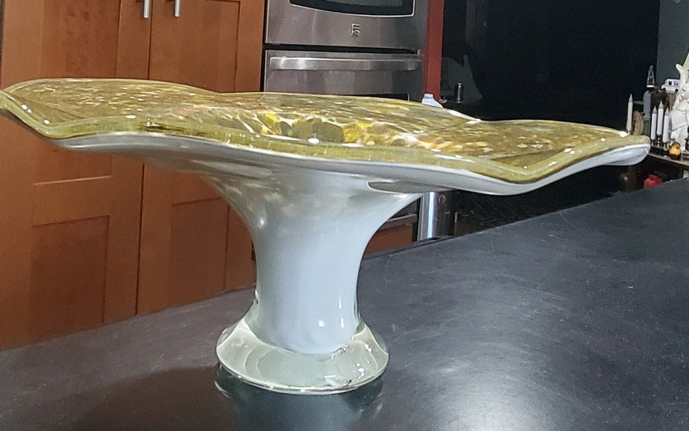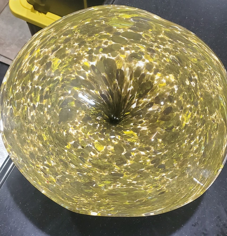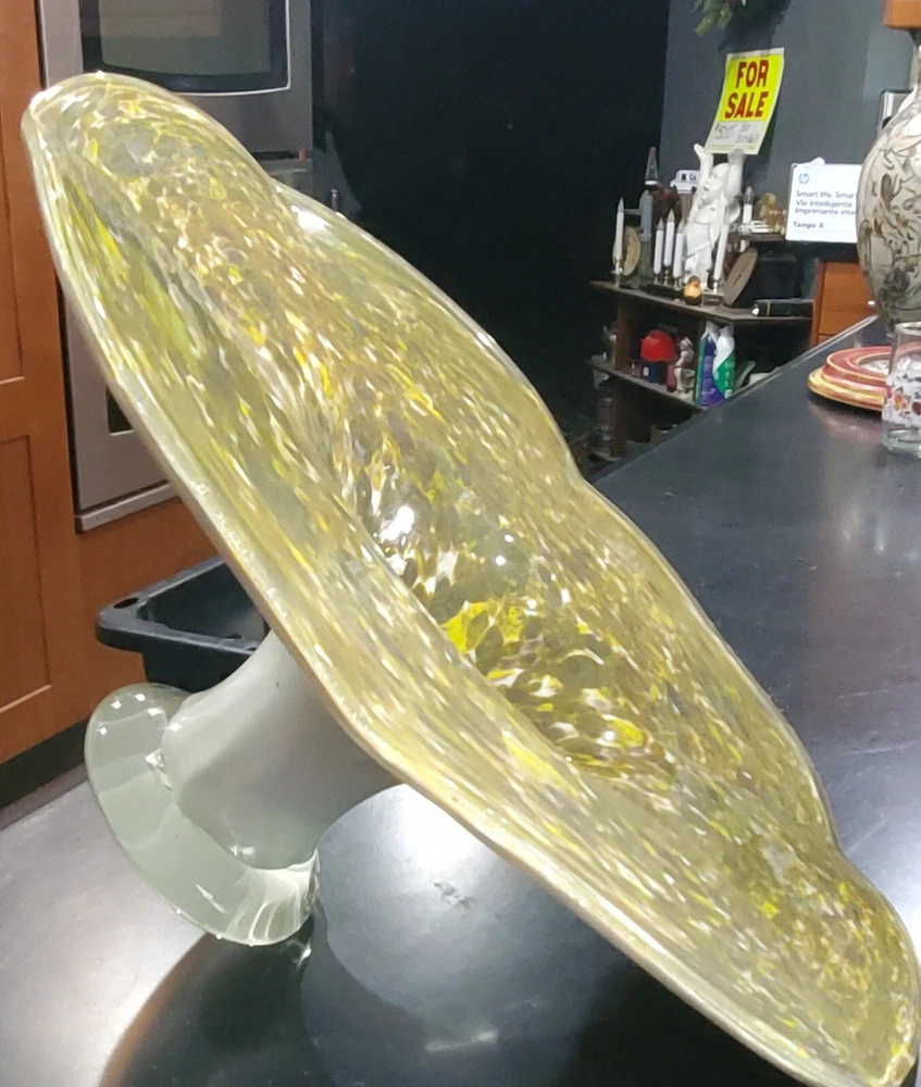 Vintage and Stunning This exquisite Vintage Art Glass Pedestal Dish is a true masterpiece. The Murano-style Art Glass Console is a stunning piece of decor that showcases beautiful greens and yellow white colors. The bowl is hand-blown with a production technique that makes it unique and special. The Mid 20th Century (1941-1969) vintage bowl is 6 inches tall and 13.5 inches wide, making it a perfect centerpiece for any table or shelf. The art glass production style and material used in creating this beautiful piece are of the highest quality. This Vintage Art Glass Pedestal Dish is a must-have for collectors of fine art glassware.