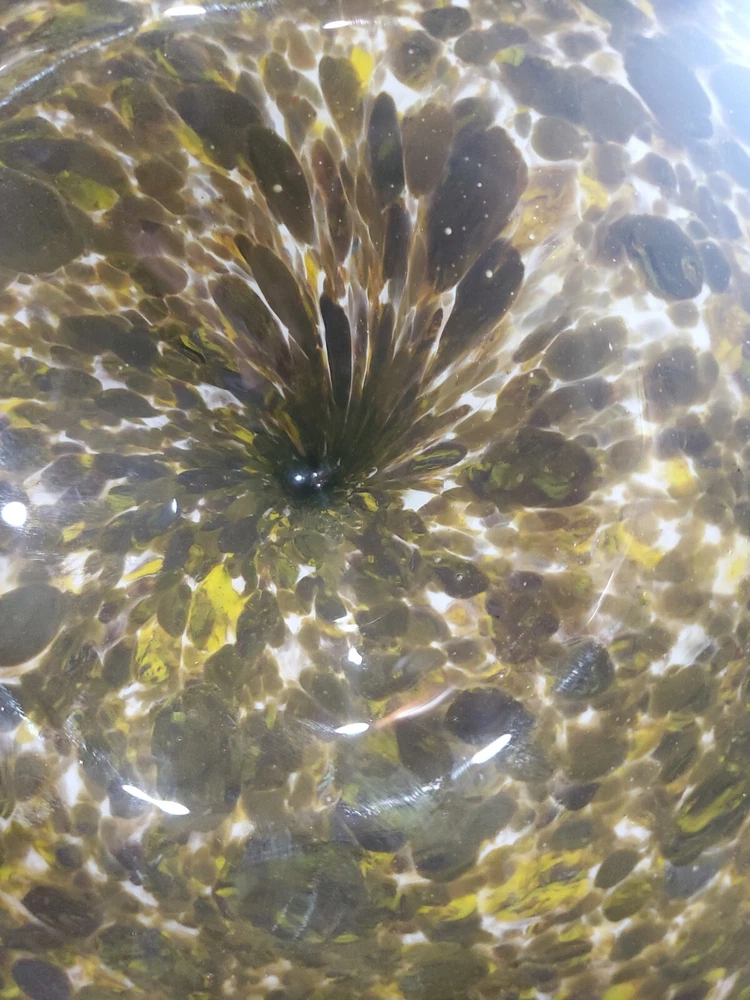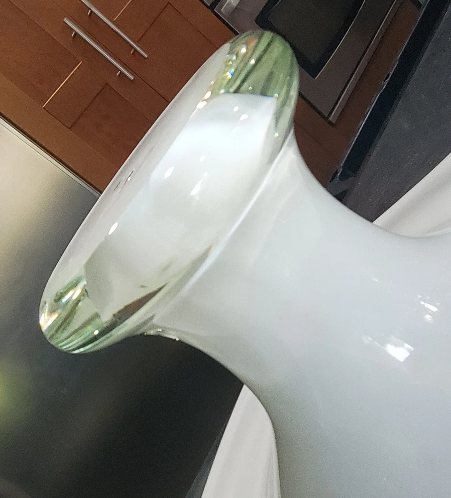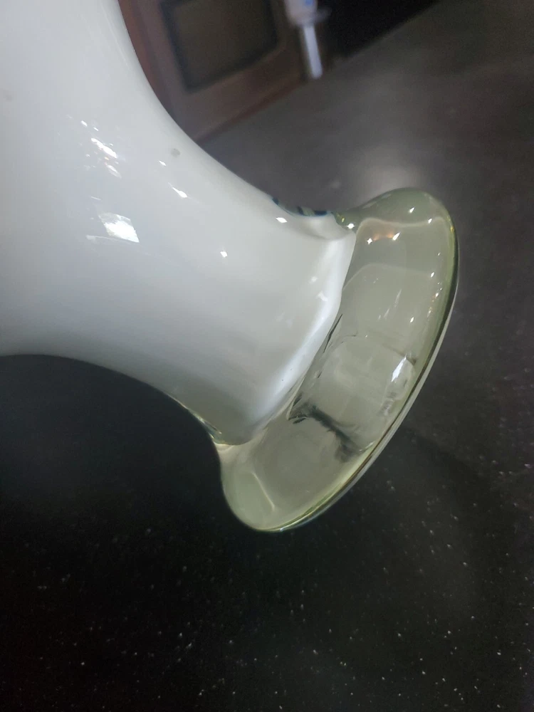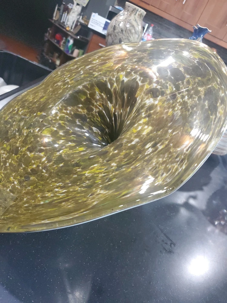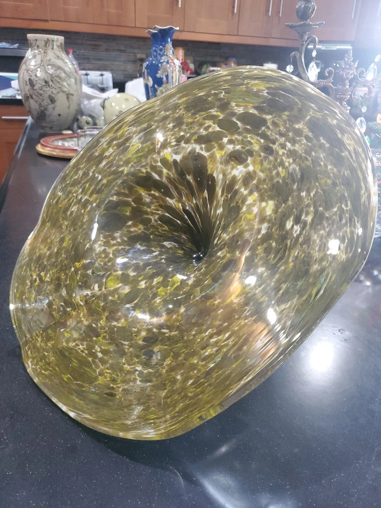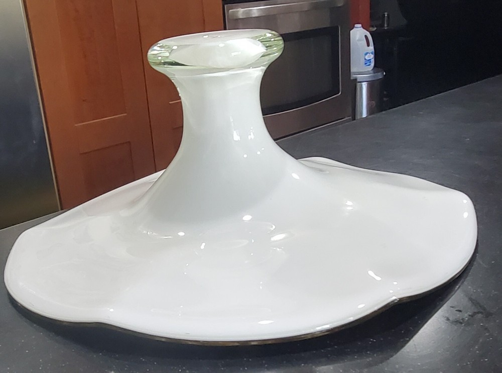 Vintage and Stunning This exquisite Vintage Art Glass Pedestal Dish is a true masterpiece. The Murano-style Art Glass Console is a stunning piece of decor that showcases beautiful greens and yellow white colors. The bowl is hand-blown with a production technique that makes it unique and special. The Mid 20th Century (1941-1969) vintage bowl is 6 inches tall and 13.5 inches wide, making it a perfect centerpiece for any table or shelf. The art glass production style and material used in creating this beautiful piece are of the highest quality. This Vintage Art Glass Pedestal Dish is a must-have for collectors of fine art glassware.