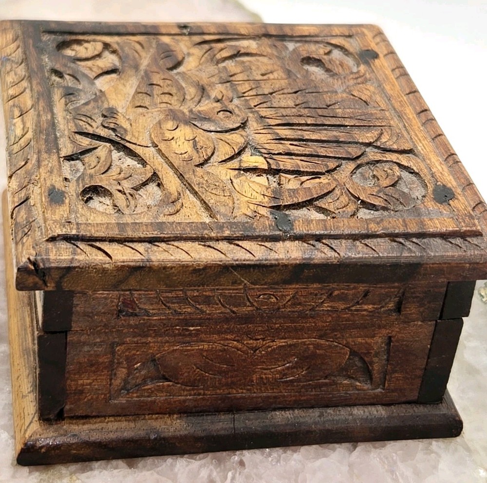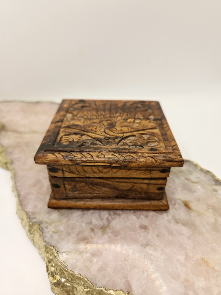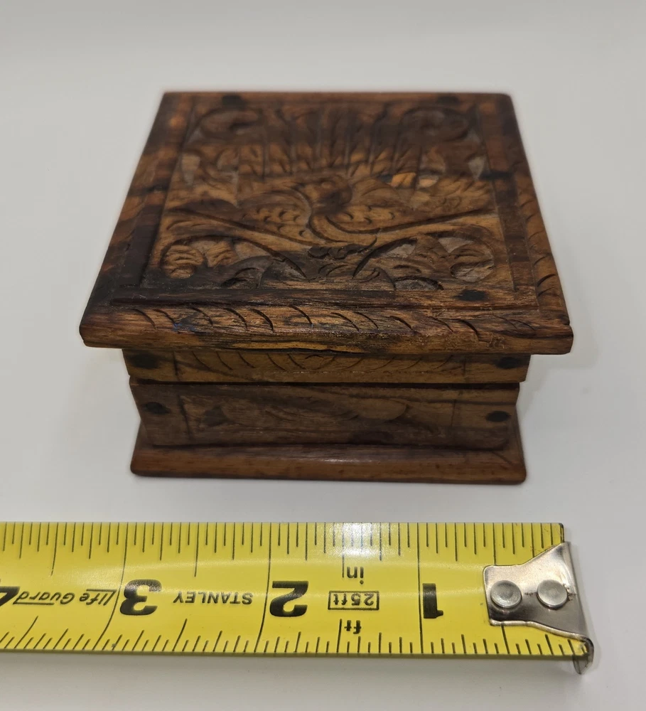 This is a vintage hand-carved wooden trinket box with ornate details and a hinged lid. The box is small and brown in color, made of wood and finished with wood-finished details. It features carvings and is designed for adults, perfect for any room and all occasions. The box is an original piece from India and is part of a collection of keepsake boxes.