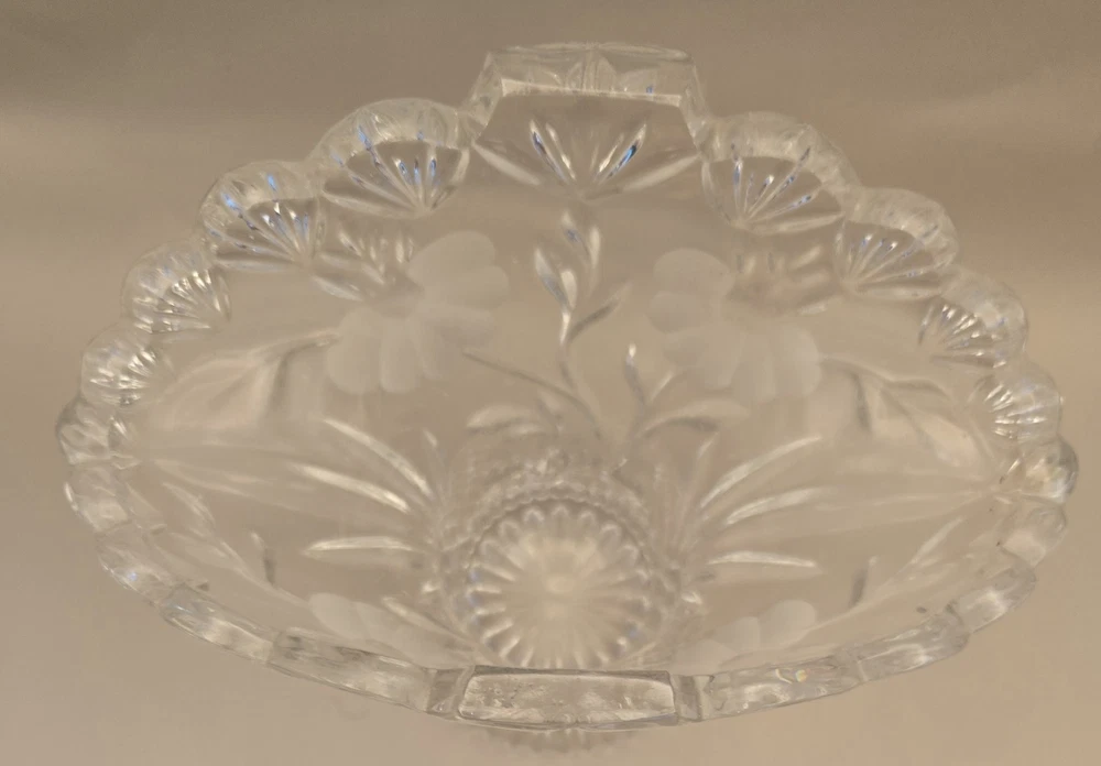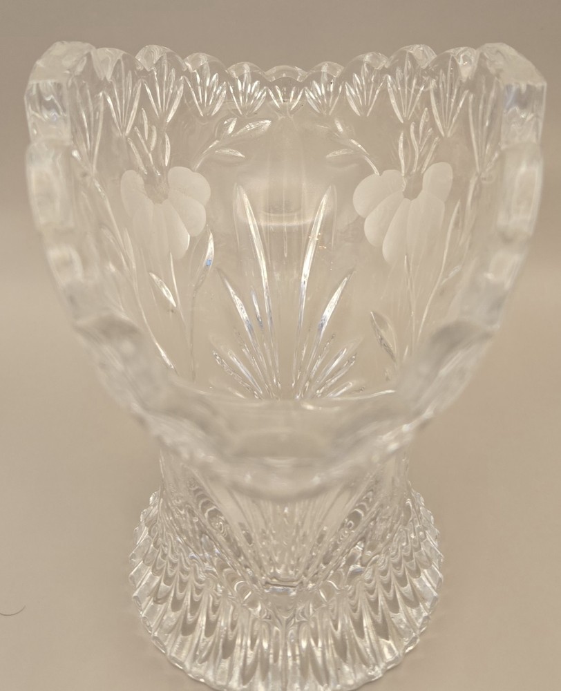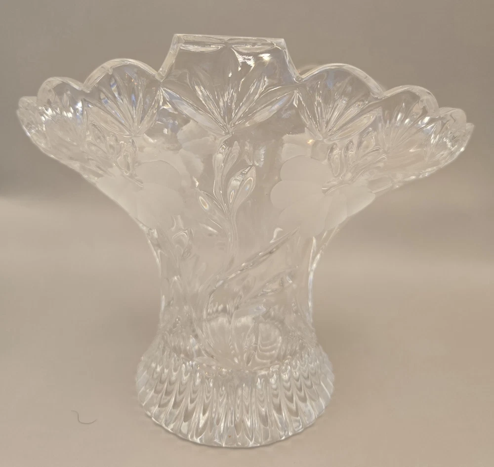 This vintage hand-cut flower vase with crystal etched flowers is a beautiful and elegant addition to any room in your home. The oval-shaped vase features a floral pattern in clear crystal, exuding a Mid-Century Modern style. Standing at 6.5" tall and 7.5" wide, this decorative piece is perfect for displaying flowers in any space. The shiny finish and intricate etched details make it a standout piece that requires no additional parts for display. Care instructions recommend hand washing only, ensuring easy maintenance for this delicate vase. No cracks, chips, or scratches. Thank you for viewing.