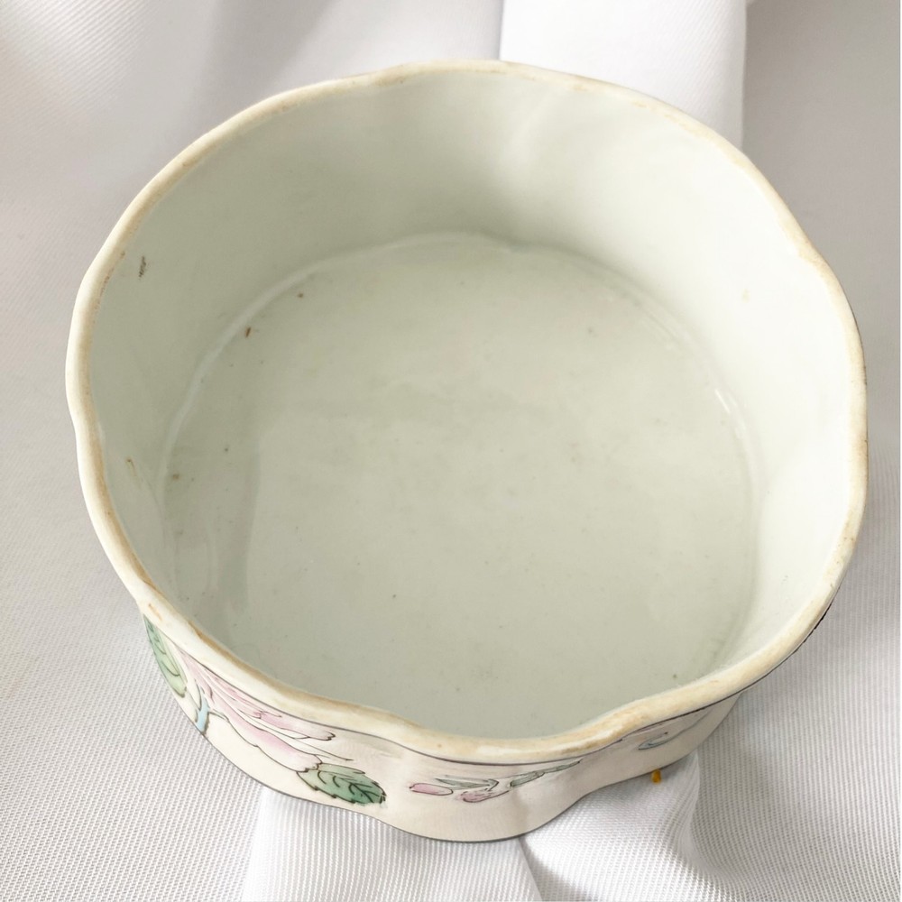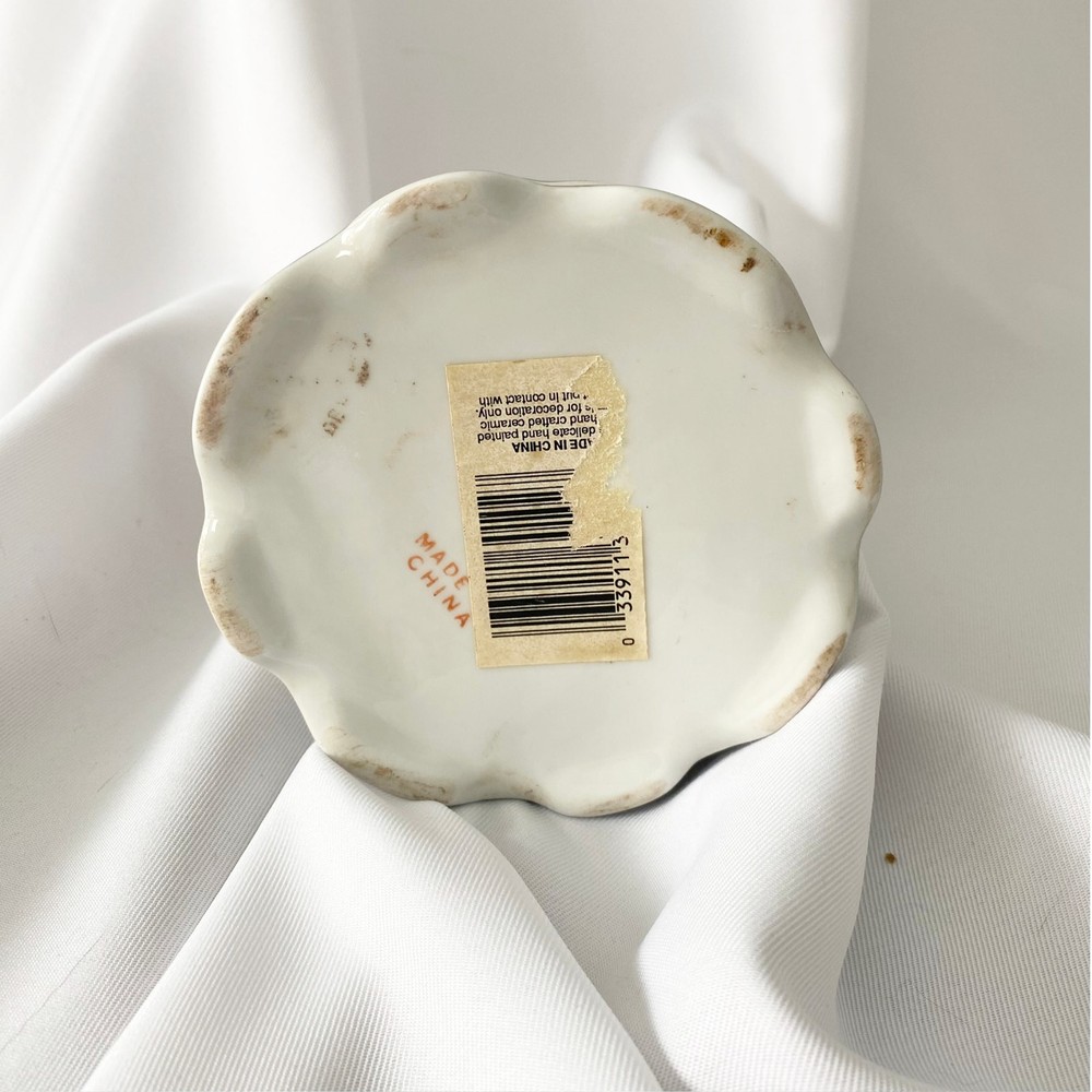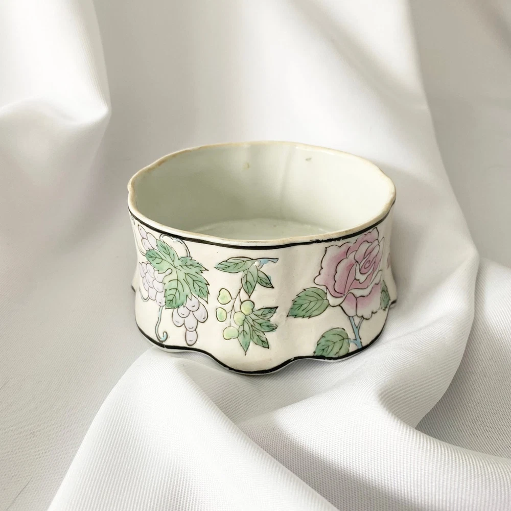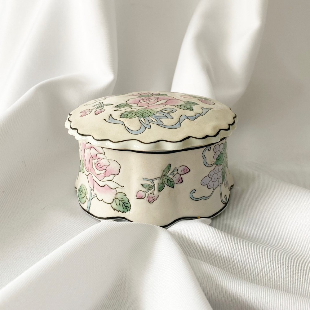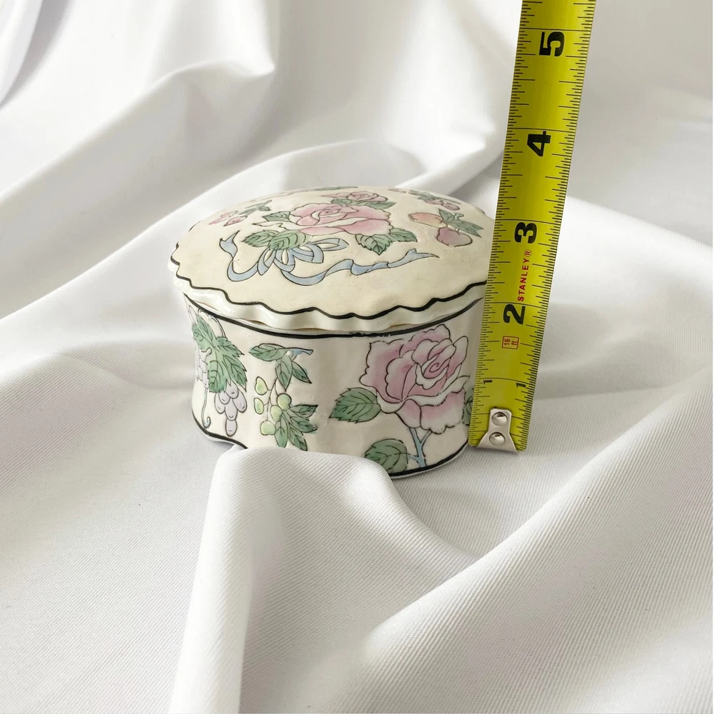 This charming vintage ceramic jewelry box is beautifully hand-painted with delicate pink roses, green leaves, and pastel blue ribbons, offering a touch of timeless elegance. The scalloped edges and intricate floral design make it a perfect addition to your shabby chic or cottage-core decor. Ideal for storing jewelry, keepsakes, or small treasures, this trinket box is both functional and decorative. Its romantic design makes it an excellent gift for collectors, vintage enthusiasts, or anyone who appreciates beautiful, handcrafted decor. Bring a touch of vintage charm to your home or give a heartfelt gift to someone special with this lovely jewelry box. Order today and enjoy a piece of timeless artistry!