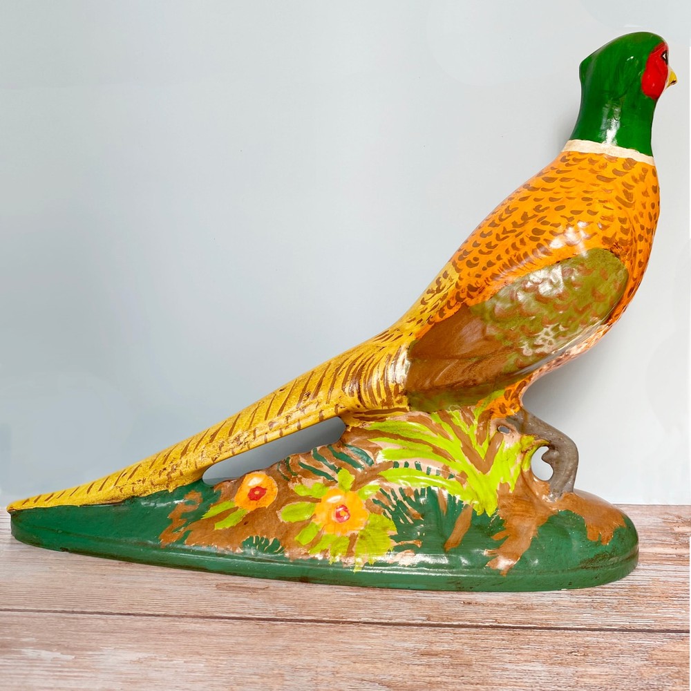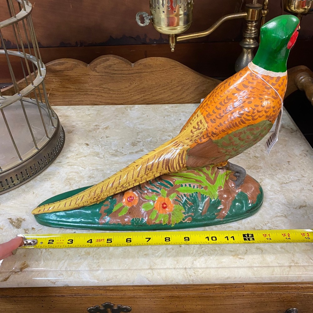 Bring a touch of rustic charm and timeless elegance to your home with this vintage ceramic pheasant figurine. Measuring approximately 10 inches tall and 15 inches long, this beautifully hand-painted piece showcases vibrant hues of green, gold, red, and earthy browns, capturing the pheasant's natural beauty in exquisite detail. Perfect as a centerpiece for your mantle, shelf, or table, this mid-century treasure adds character and a hint of countryside nostalgia to any decor style—whether farmhouse, traditional, or eclectic. Its solid ceramic construction ensures durability, making it a wonderful heirloom-quality item for collectors and bird enthusiasts alike.